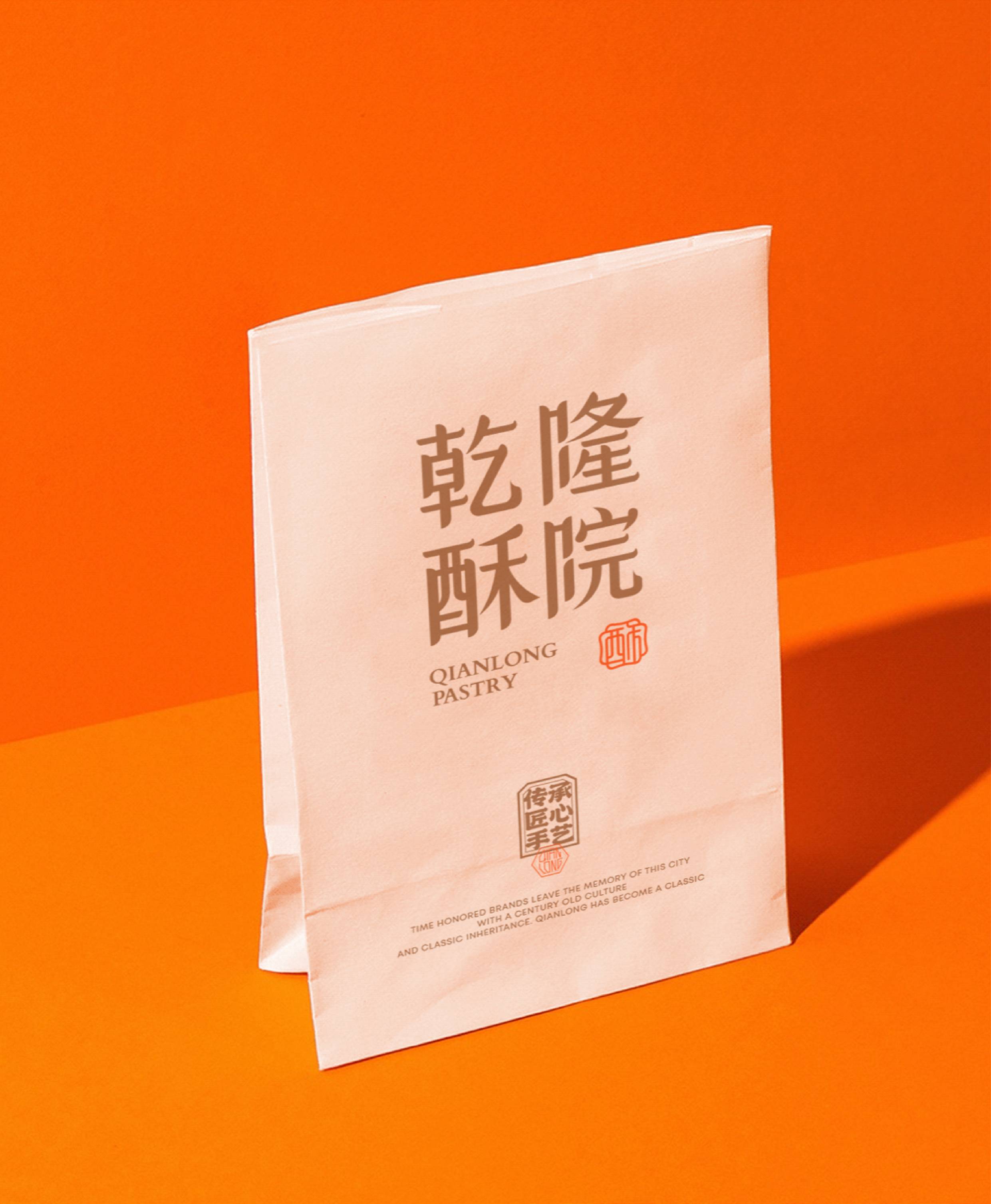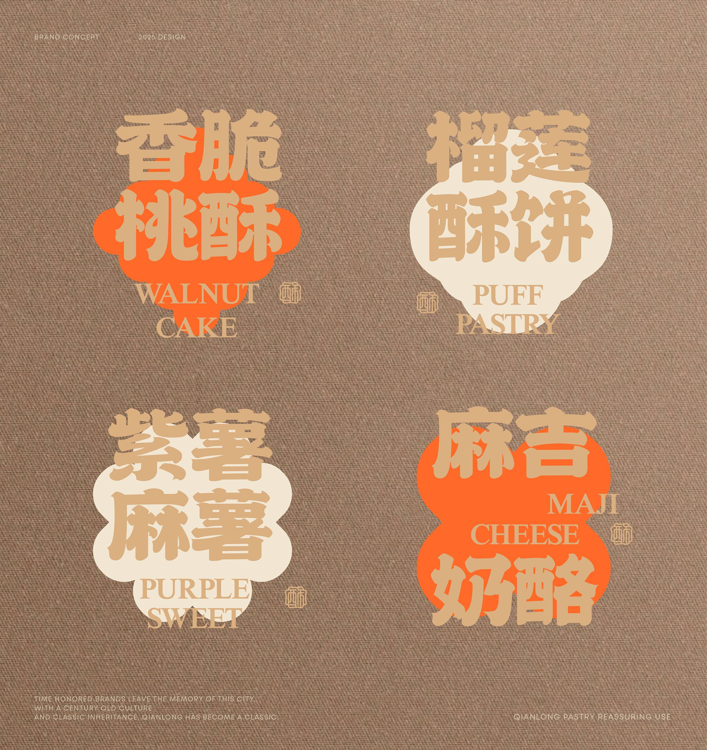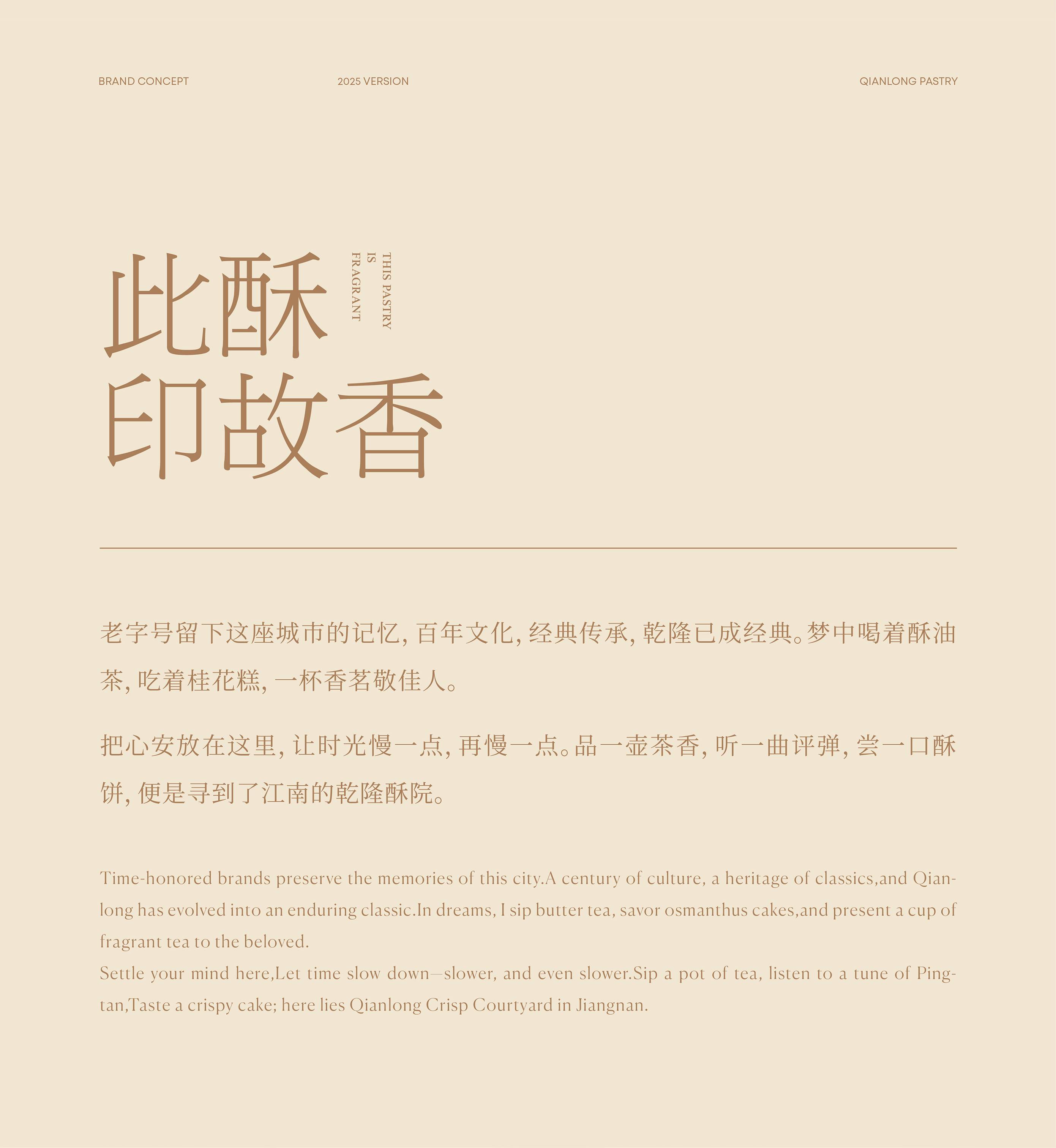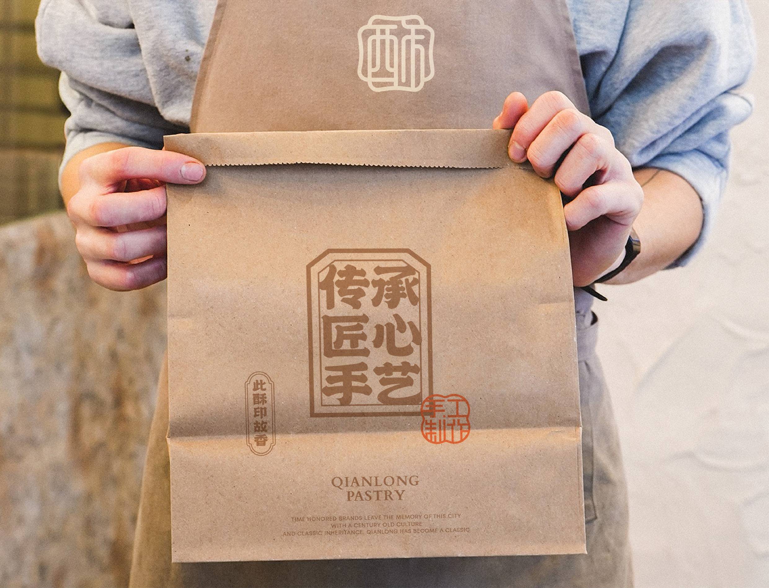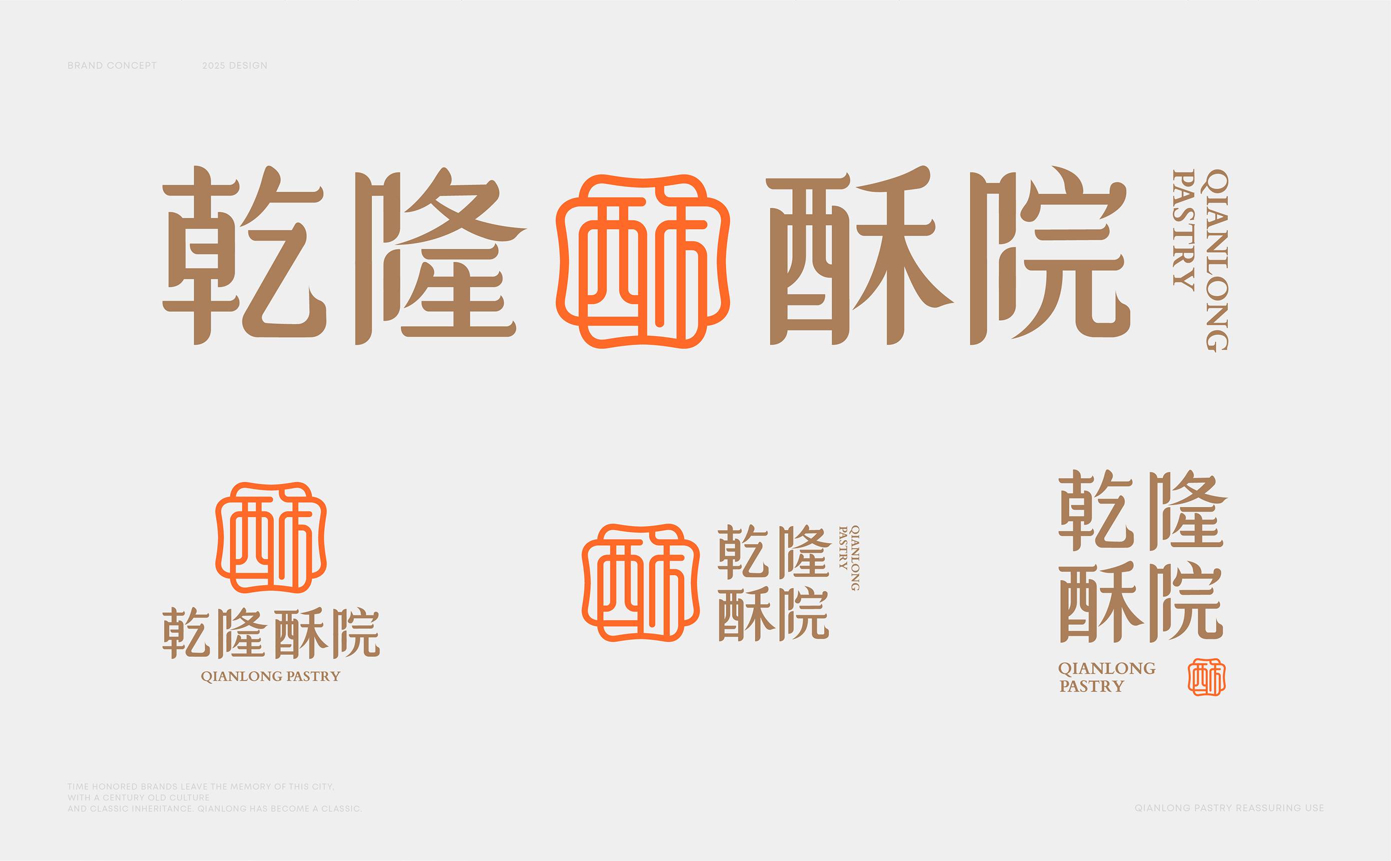 面对品牌扎根浙江的地域属性,我们聚焦“江南意象”与“宫廷传承”两大文化支点展开设计。logo图形设计上,融合江南窗棂的灵秀轮廓与传统印章的严谨形制,既点出地域特色,又呼应“乾隆”背后的历史感。核心“酥”字以书法笔触融入图形,直观传递品牌专注酥类糕点的定位。整体造型简约典雅,既承袭江南美学的温婉细腻,亦符合现代审美。