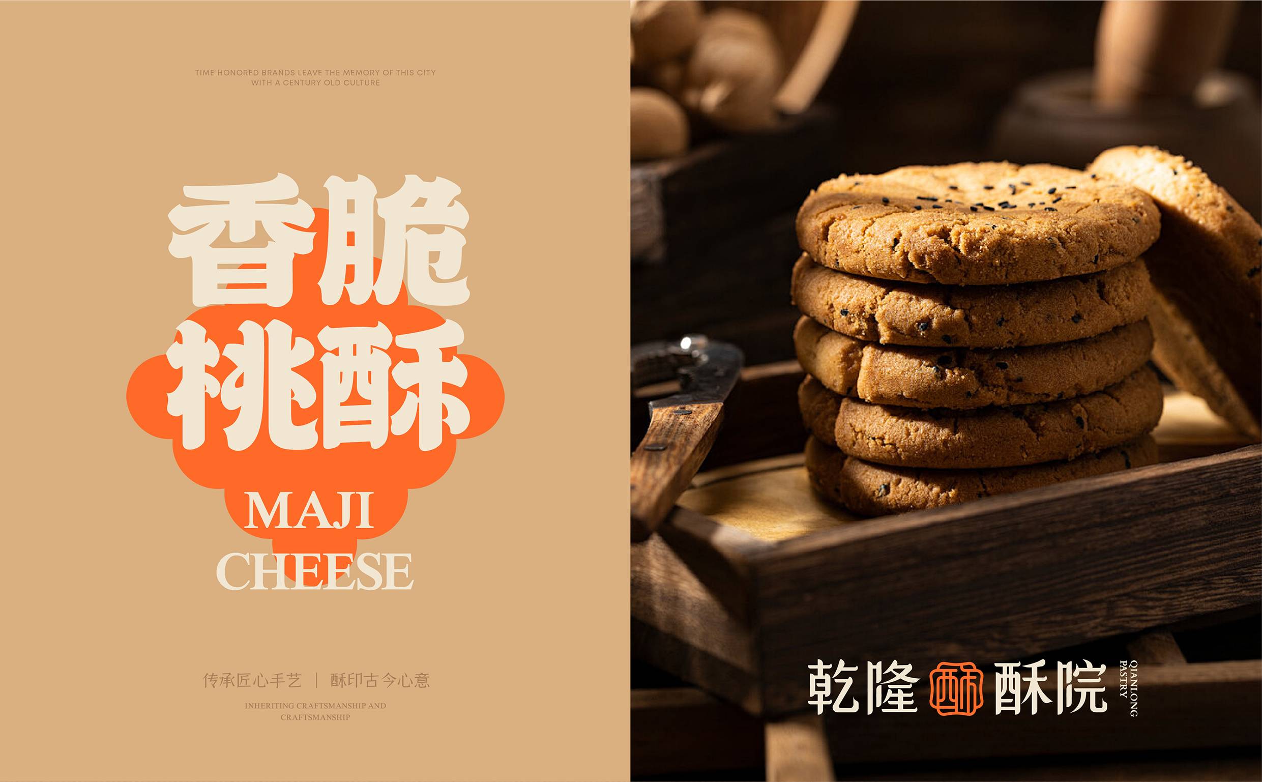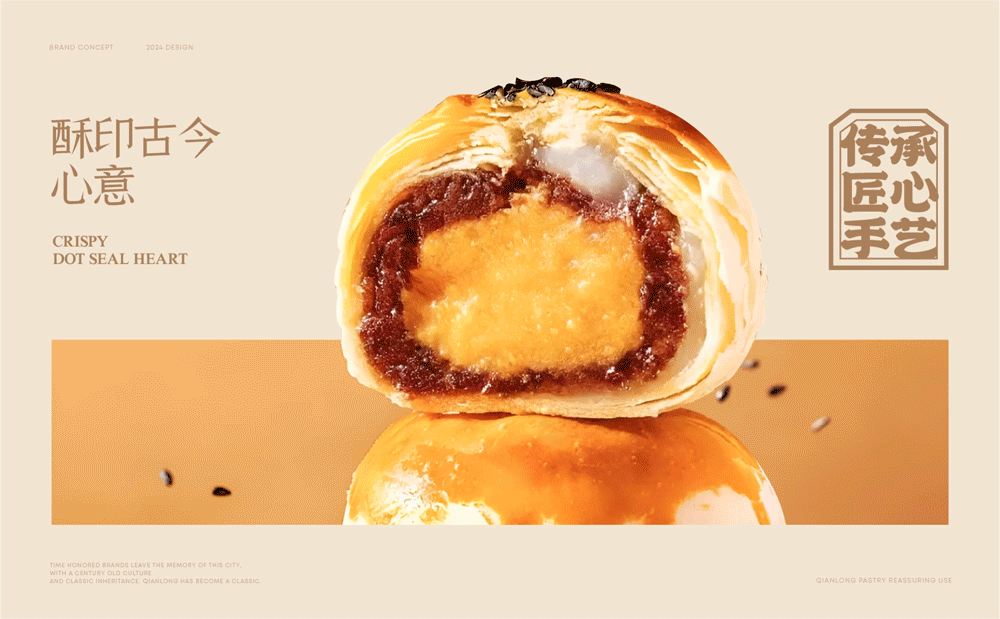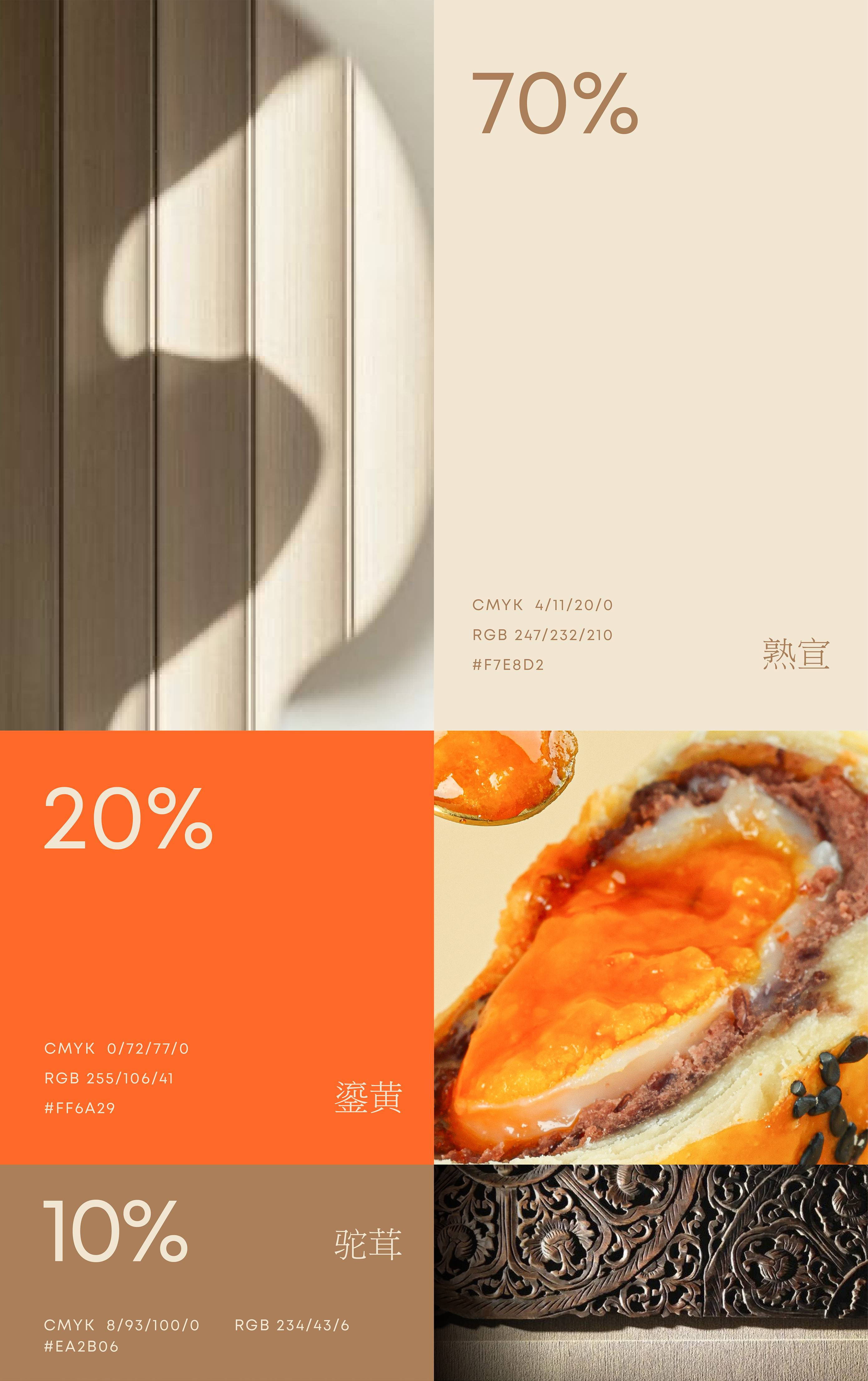 整体以柔和雅致的熟宣色铺陈基调,传递传统糕点的温润质感;鎏黄作为点睛之色跃入视线,以其鲜活张力激发食欲;驼茸色则沉稳融入,强调匠心打磨的品质。三色相融,既展露了东方糕点的文化内核,又清晰传递出“传统与现代交融、美味与品质兼具”的品牌气质。