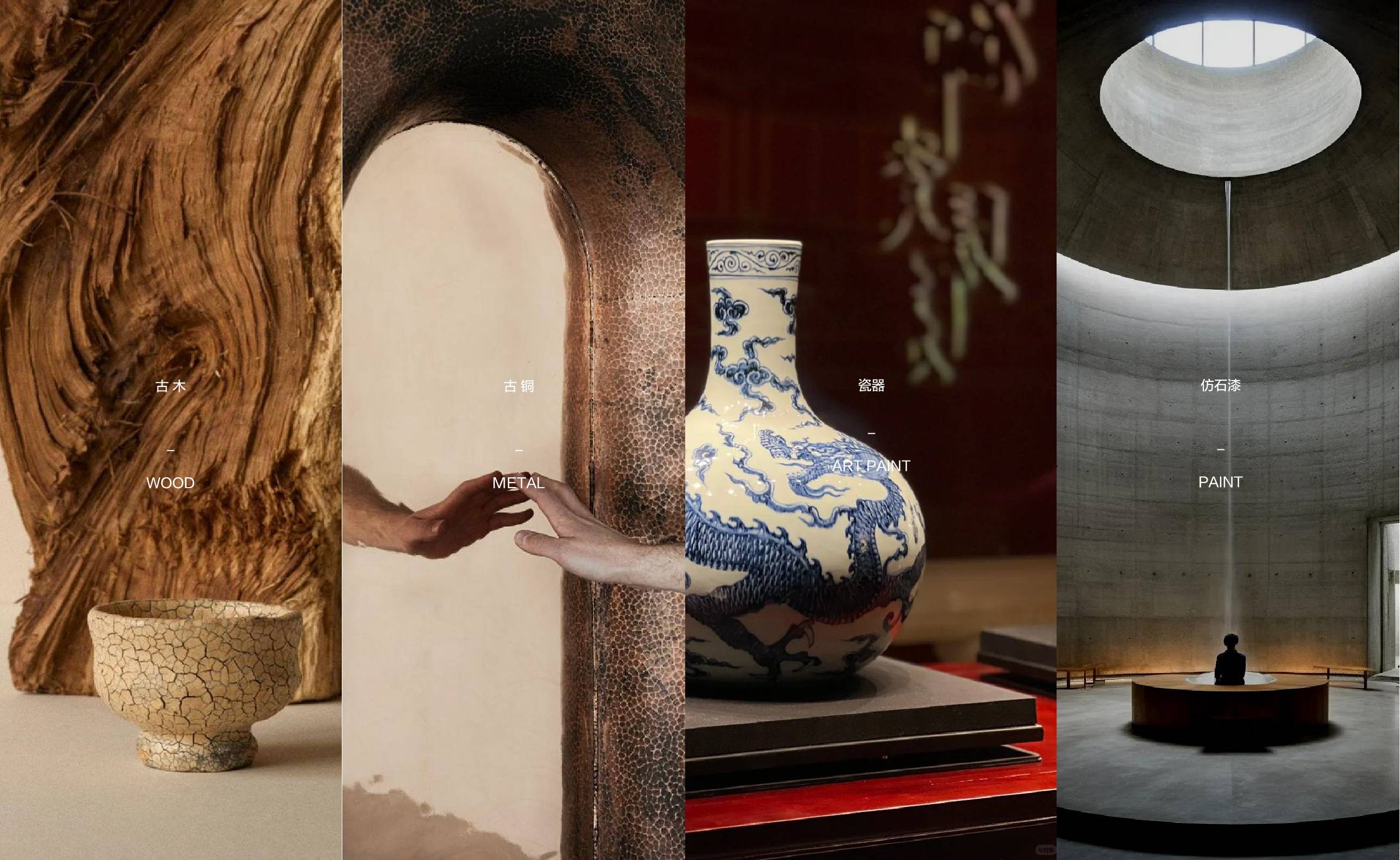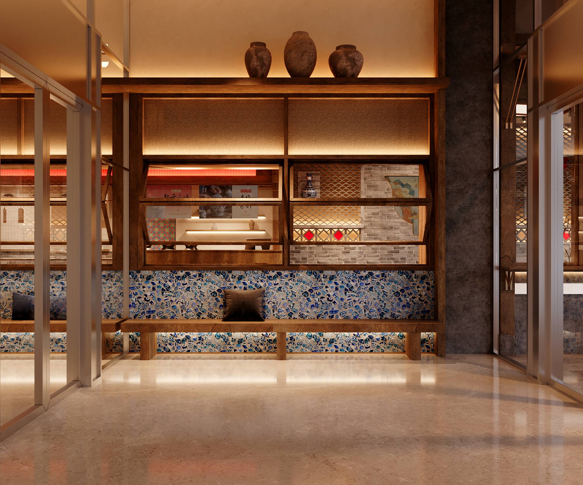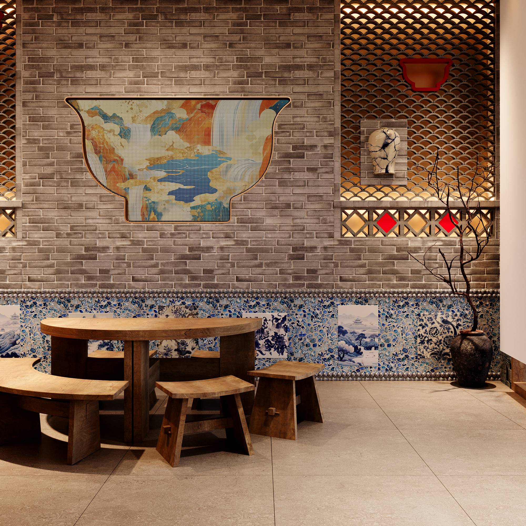 空间以木材作为主材,其温润自然的质感,赋予空间质朴亲切的基调。仿石漆呈现出类似石材的粗糙质地,增添历史厚重的气息;古铜则以细腻的金属光泽,在整体质朴中融入精致感。陶瓷碎片砖点缀其中,独特的釉色与拼贴效果,赋予空间东方雅韵,展现传统与现代交融的美感。