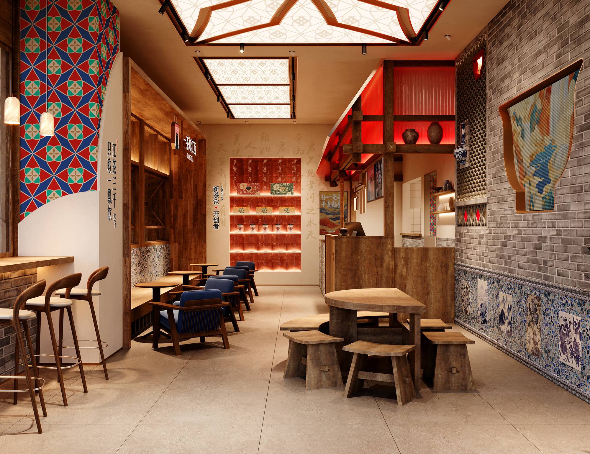 空间以暖木色调为基底,营造出质朴而温润的茶饮氛围,传递出东方式的放松与亲和。其间融入一抹靛蓝色,以其深邃而宁静的质感,平衡了暖调的整体氛围,增添几分理性与沉稳。而源自江西底蕴的红色,则作为点睛之笔跃然其间,于沉静中注入在地文化的热烈气息。