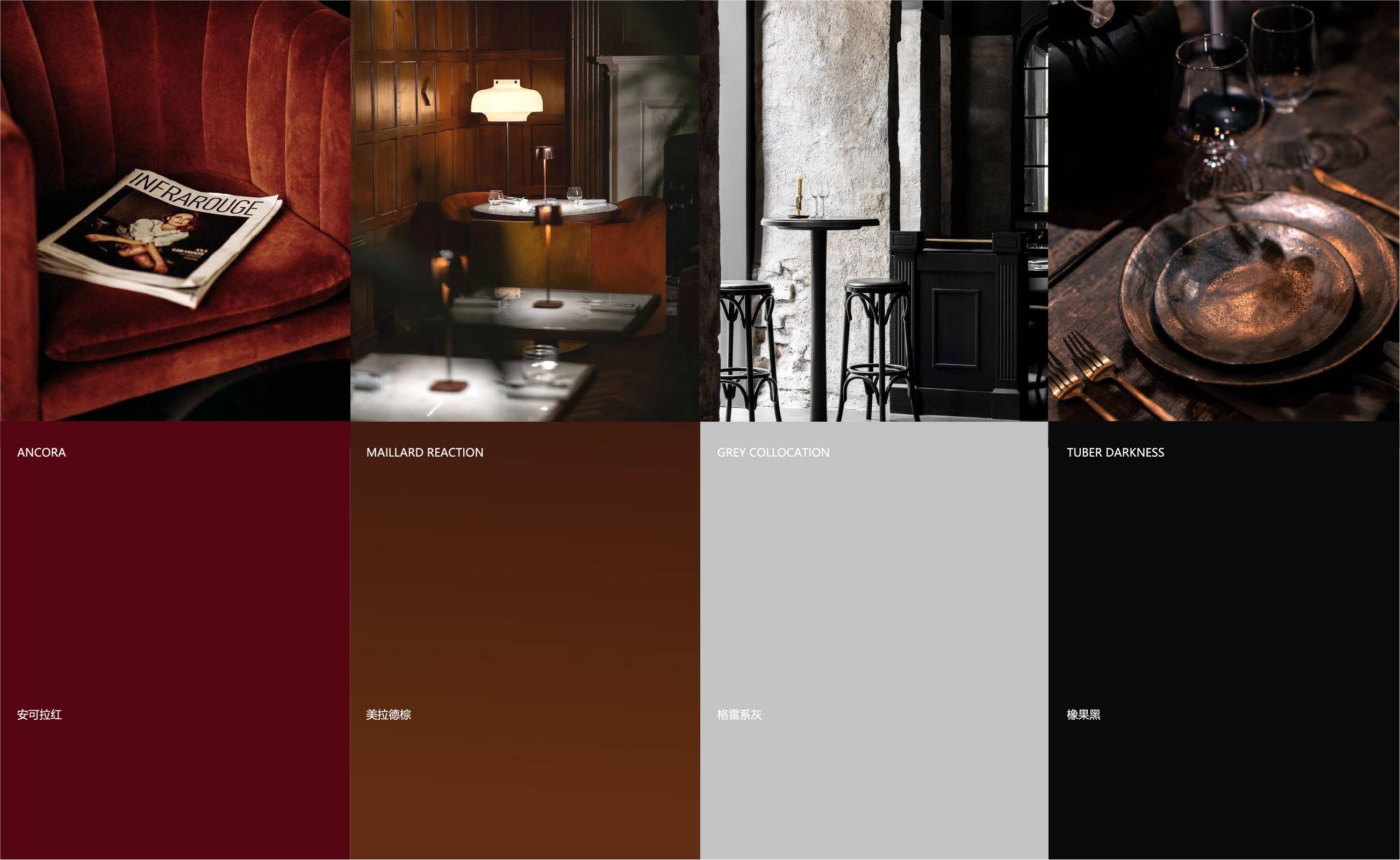 色彩搭配展现出沉稳而富有张力的美感。浓郁暗红与温暖棕色交织出复古雅致的基调,奠定空间温暖醇厚的氛围。中性灰色巧妙平衡了暖色的浓郁,为空间注入冷静理性的气息。深邃暗色作为视觉锚点,强化了整体稳重感。