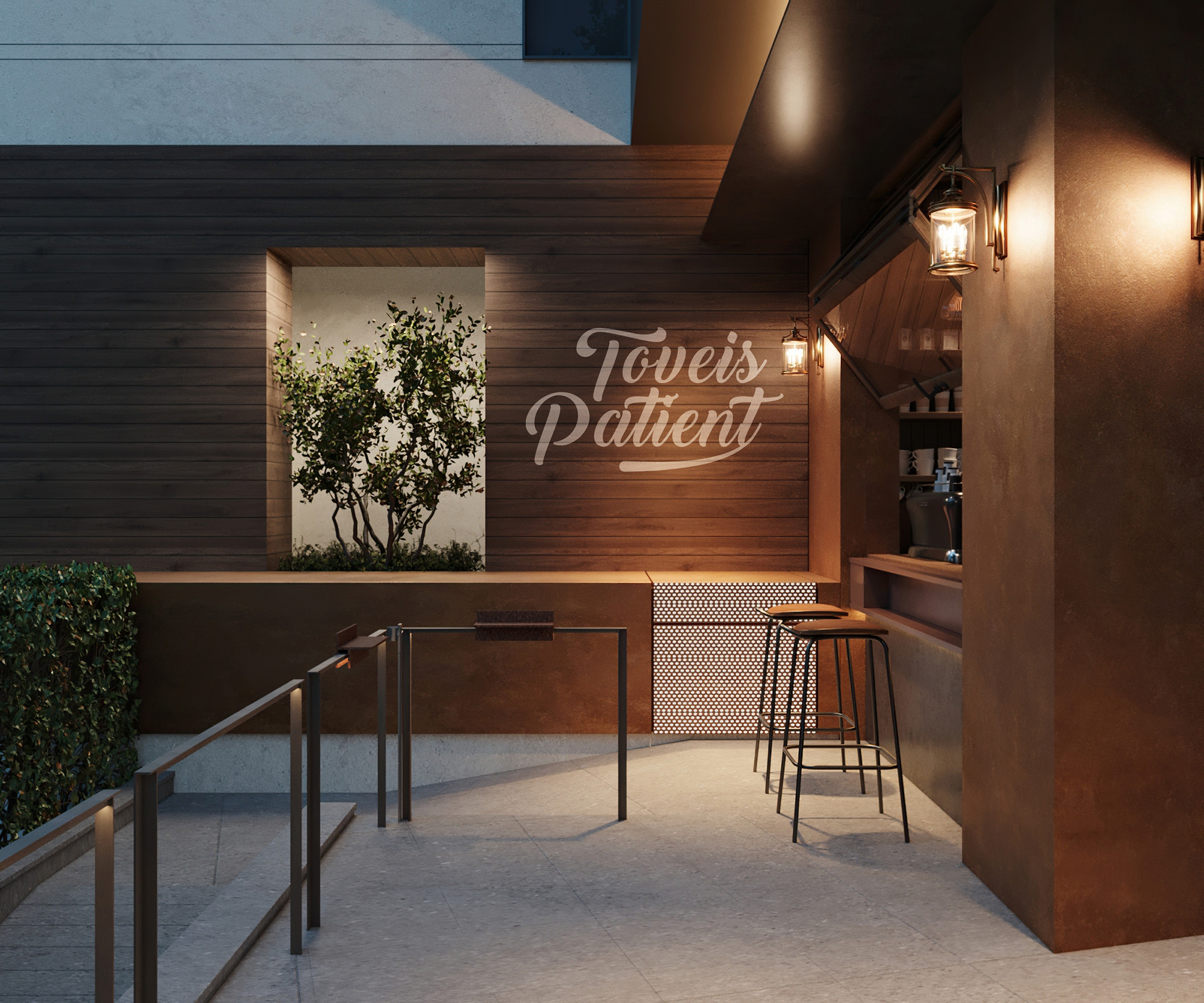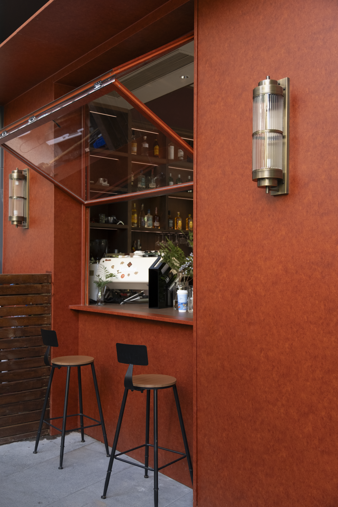阶梯式过渡与绿植围合形成半开放的街边庭院,搭配露天吧台与外摆座椅,点上一杯咖啡或酒饮,在静安街头营造出一处轻松自在、吸引住客与邻里共同停留的社区聚集点。