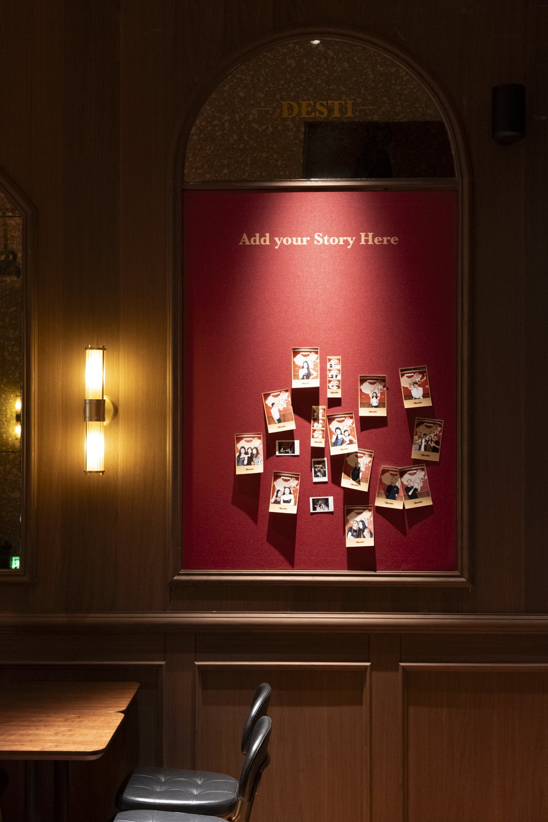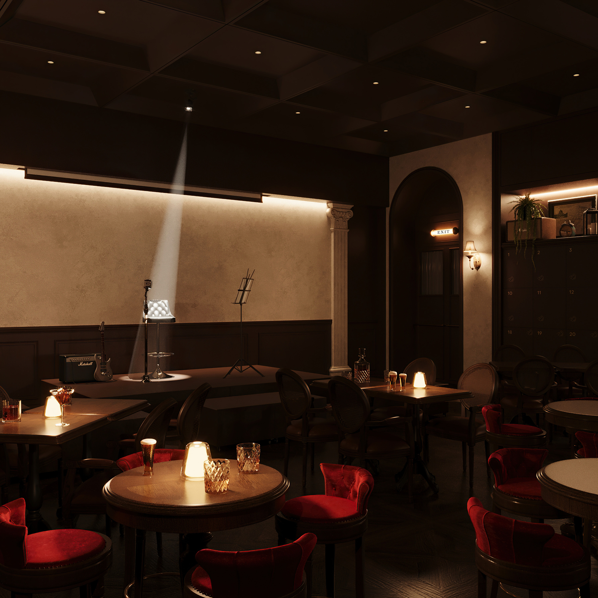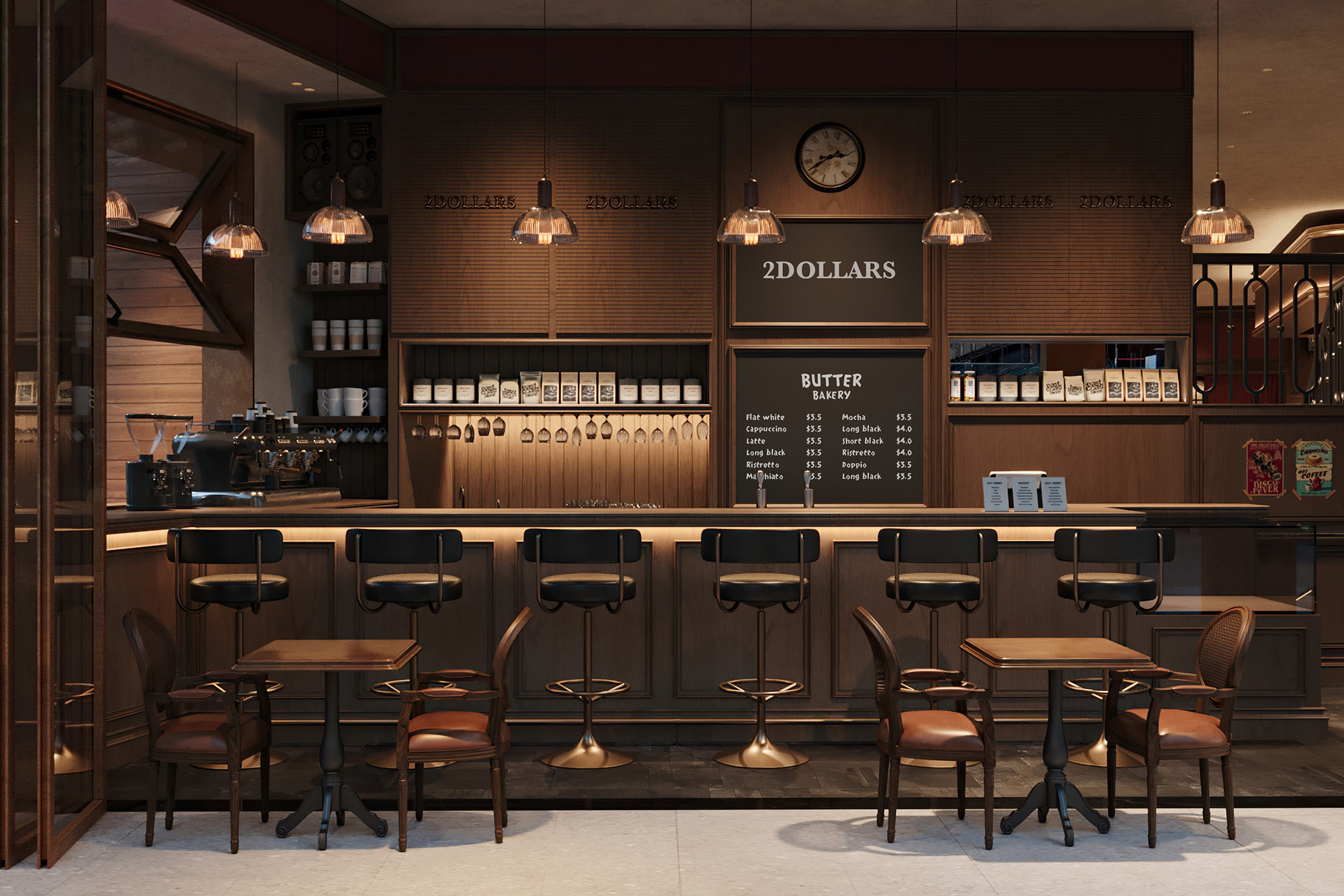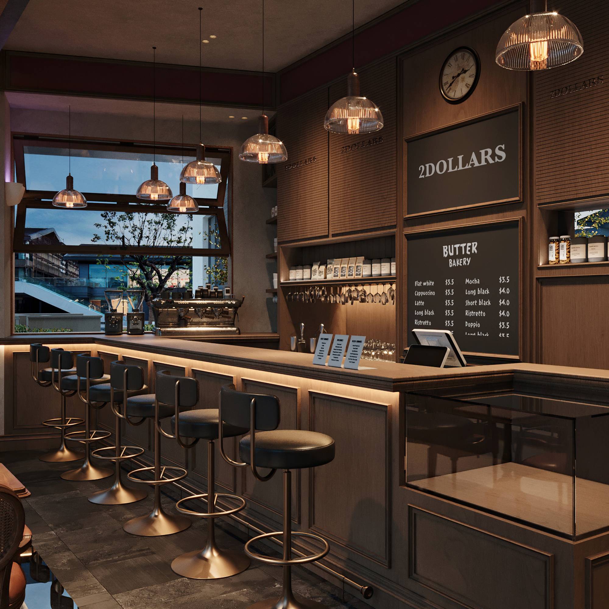 Coffee&Bar区域以深色木质吧台为核心,在紧凑布局中保持流畅动线,搭配金属高脚凳与复古吊灯,营造出温暖而精致的氛围。