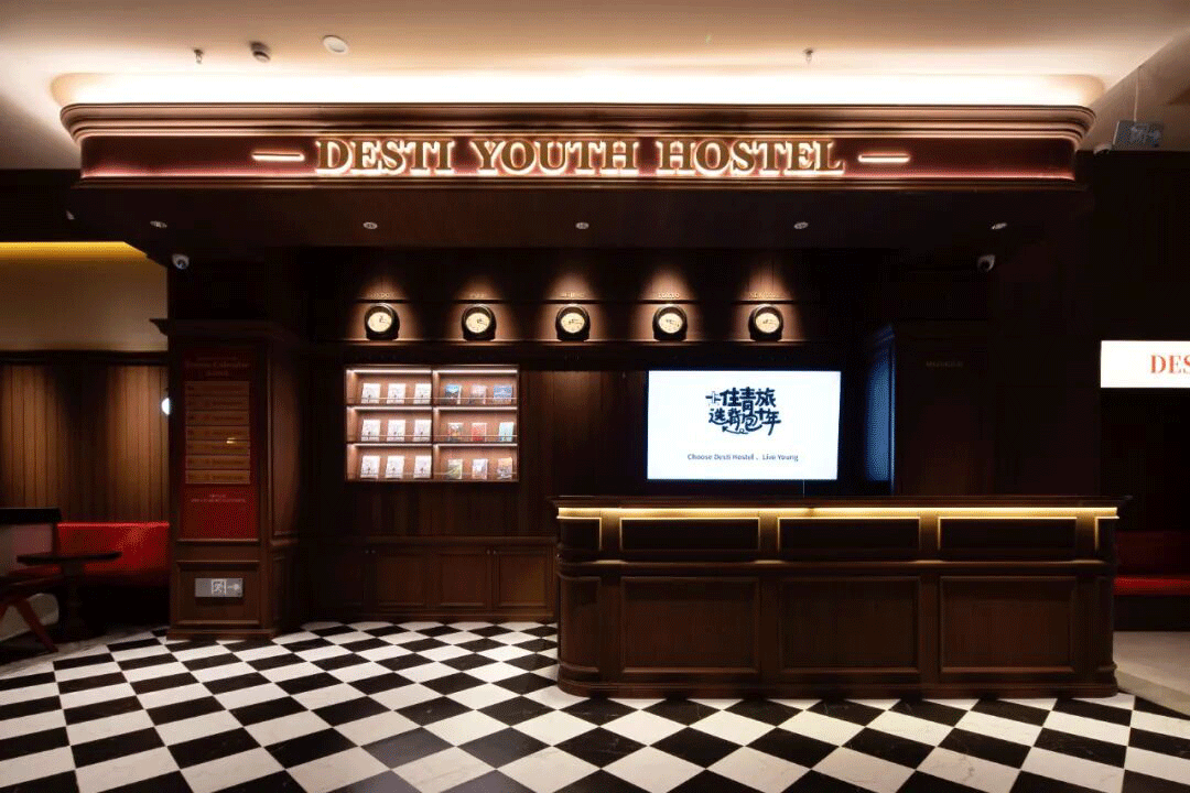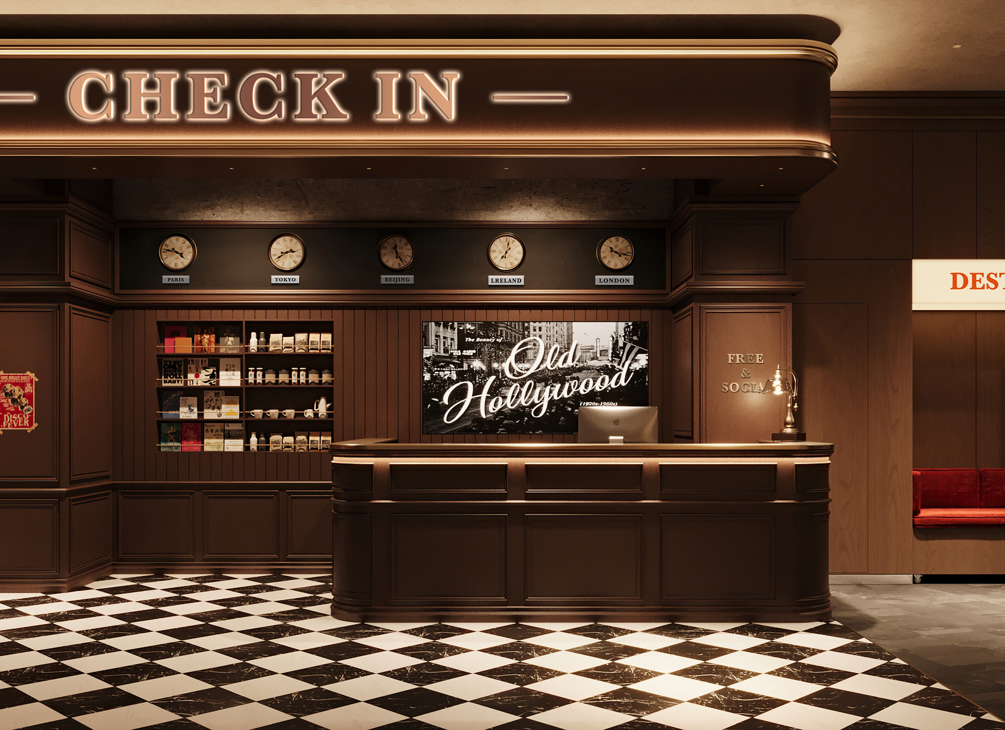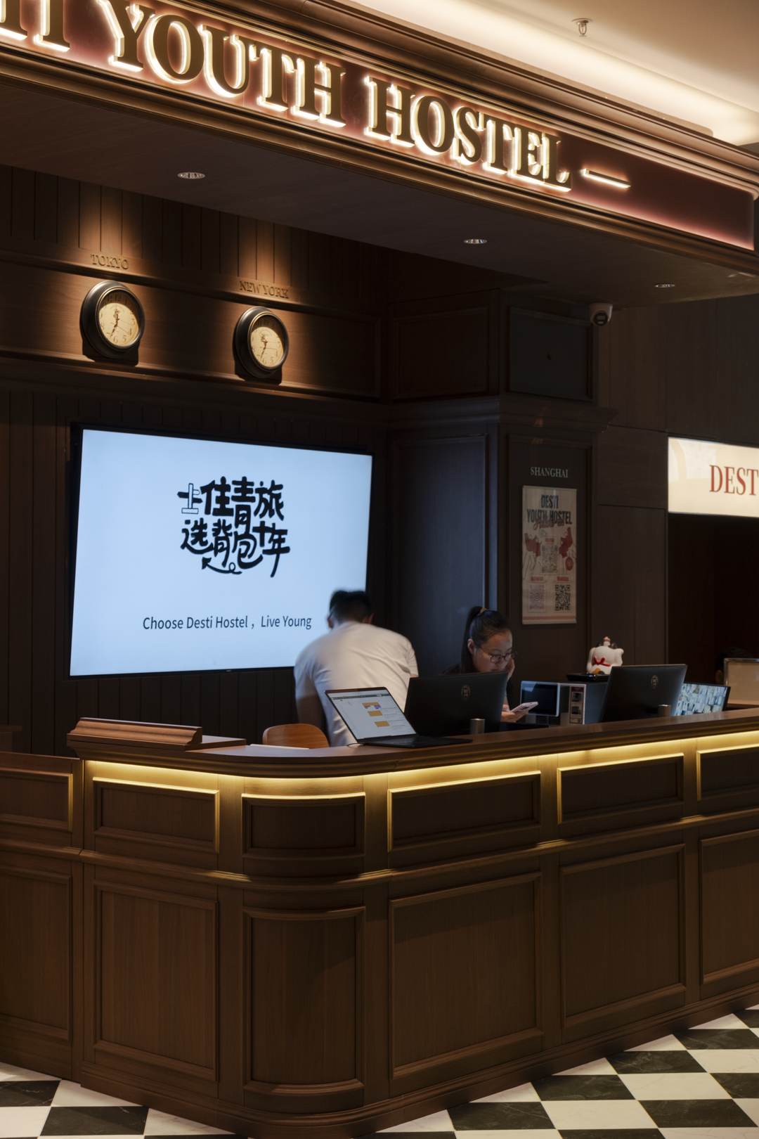 步入大厅,服务台后方悬挂的五地世界时钟墙,以跨越时区的视觉符号,奠定了空间的旅行叙事基调。
