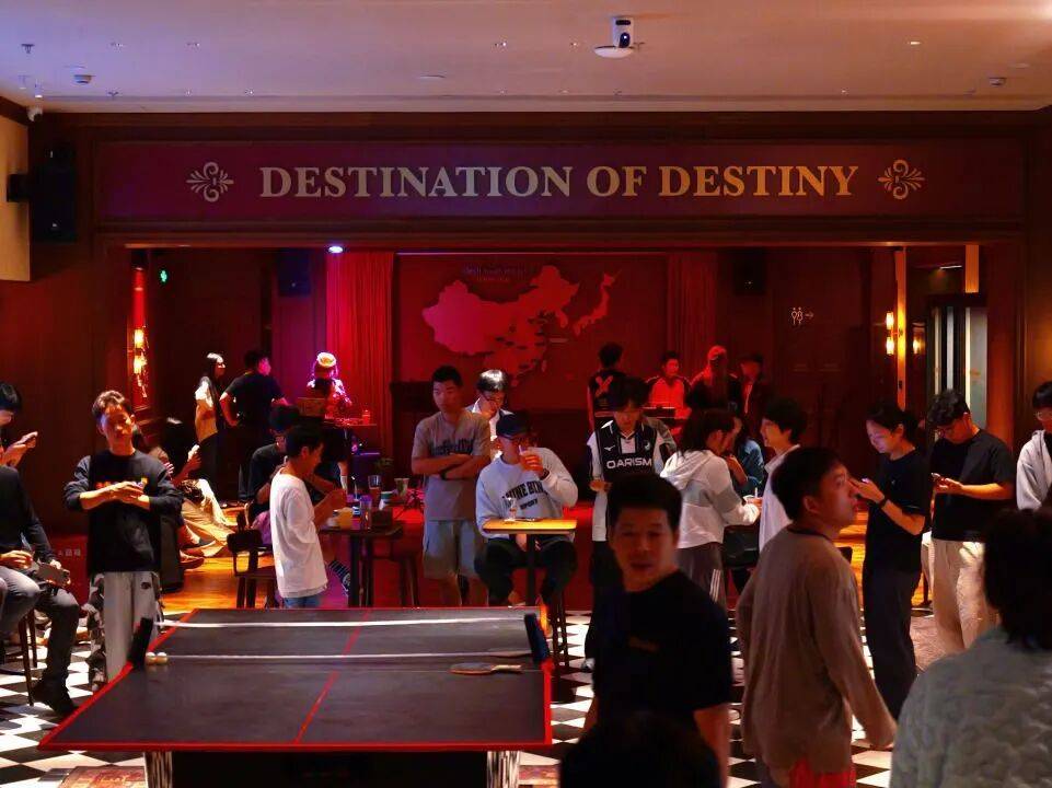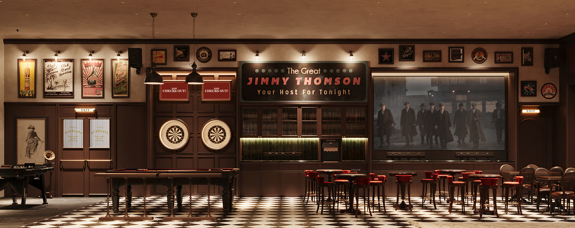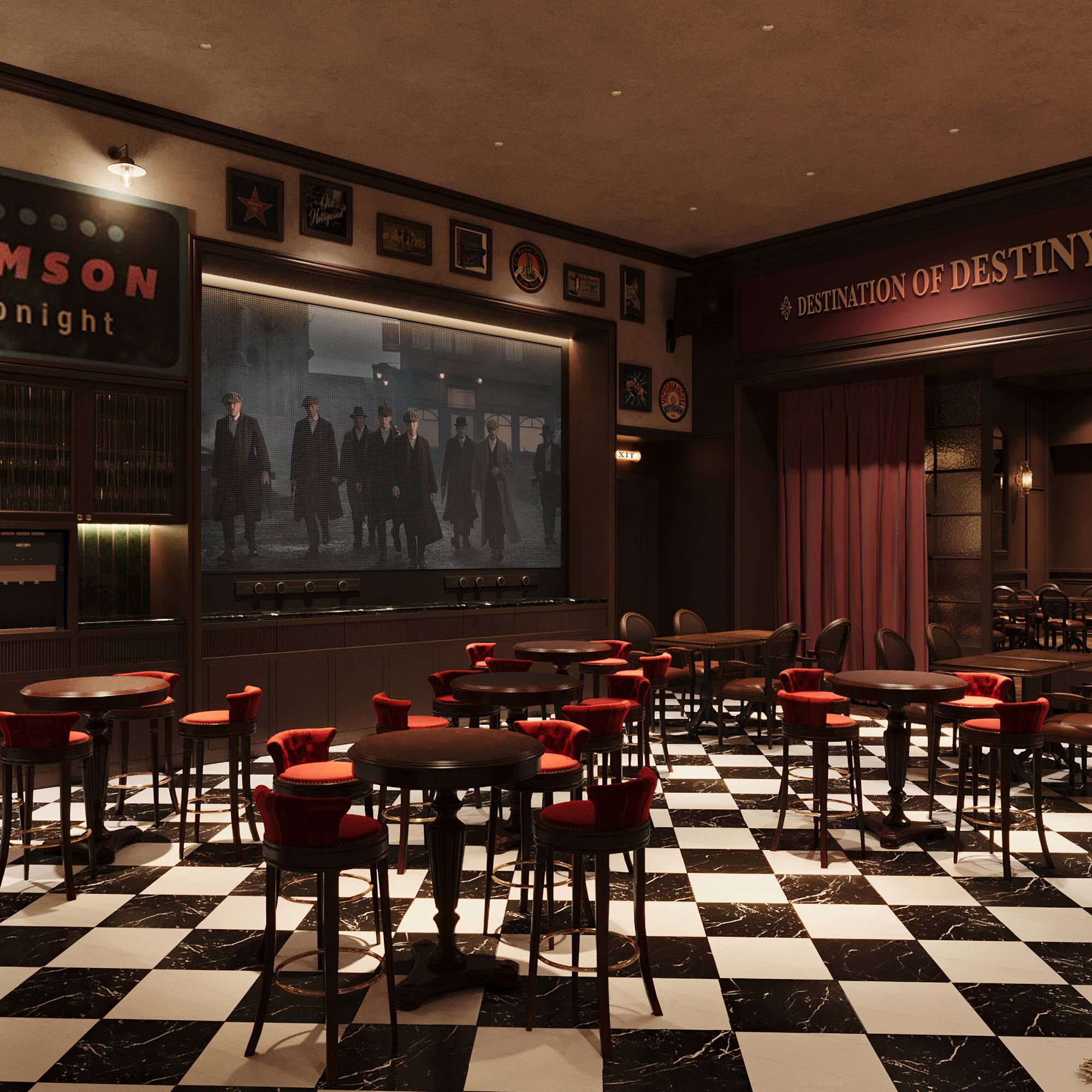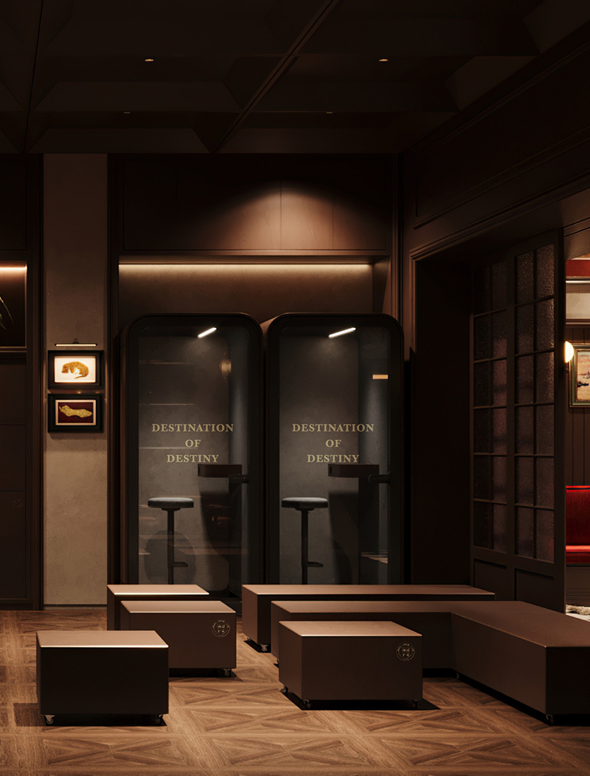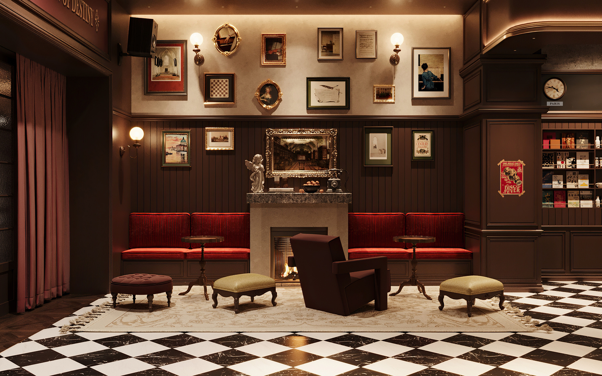 我们通过材质清晰划分出动静双区:棋盘格地砖界定的动态区域,集中设置了台球、飞镖、观影等娱乐区以及卡座壁炉区,搭配红色帷幕与复古海报墙,形成一个开放活跃的社交聚点。
