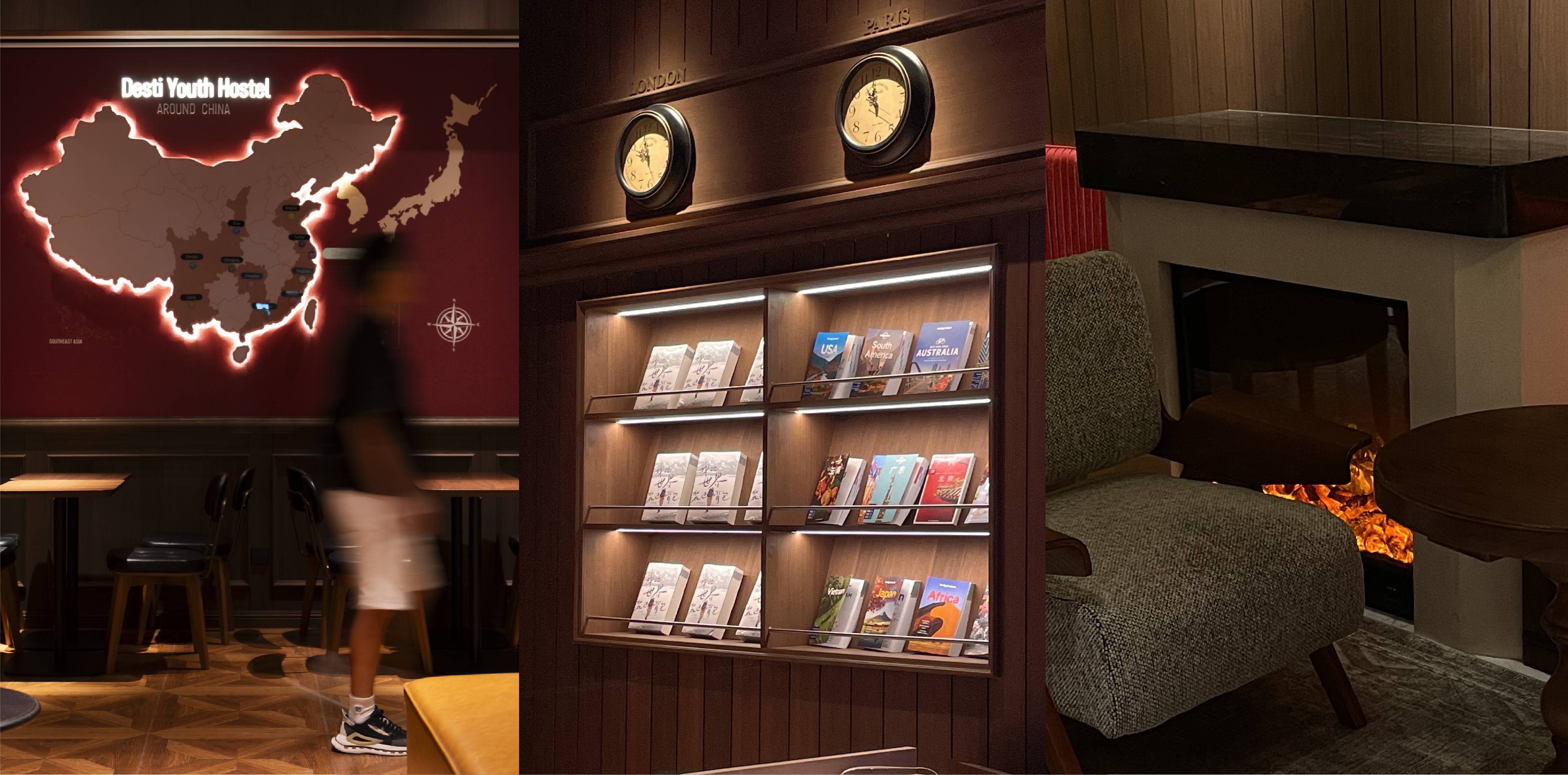 • 细节处,地图元素、复古壁炉与深色调家具,共同强化了整体的旅行主题与质感。