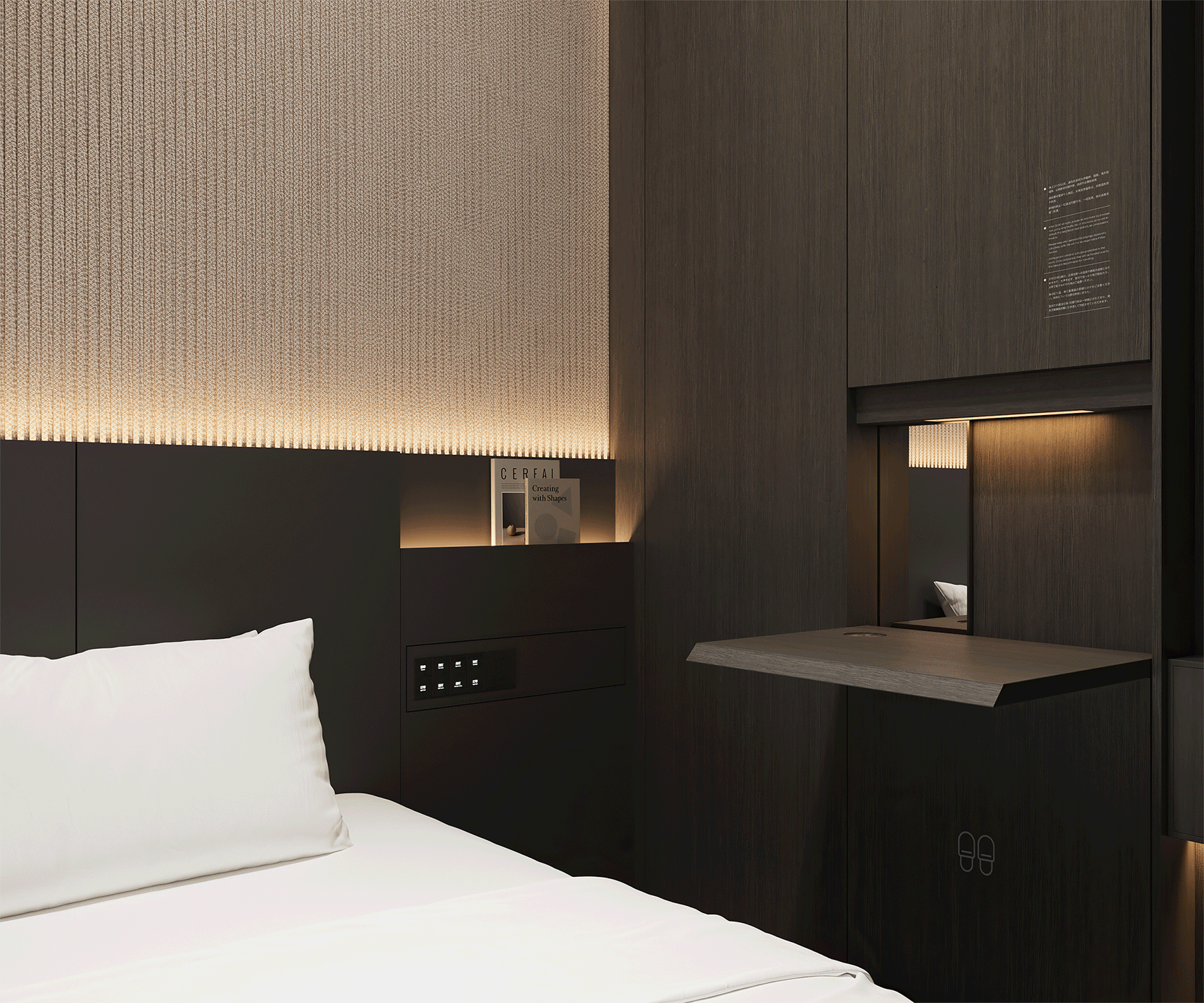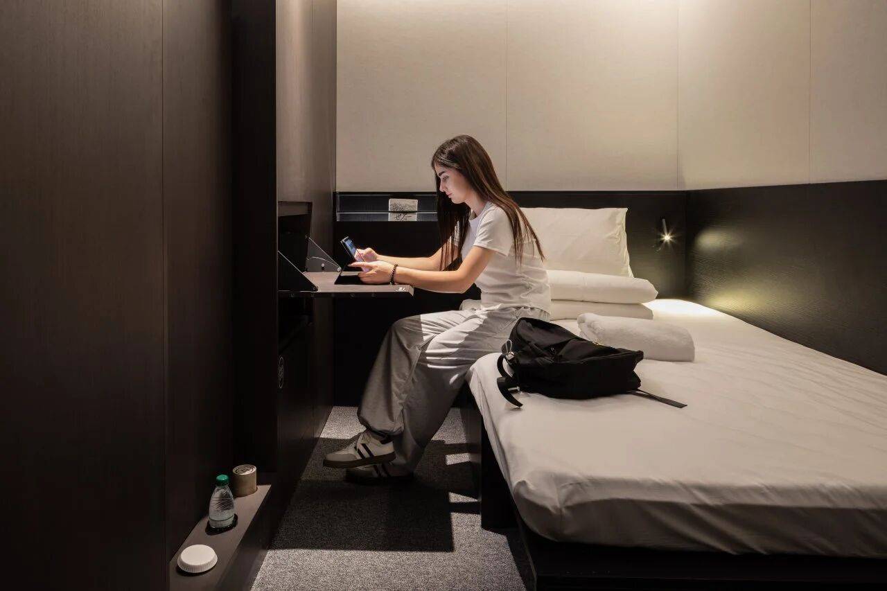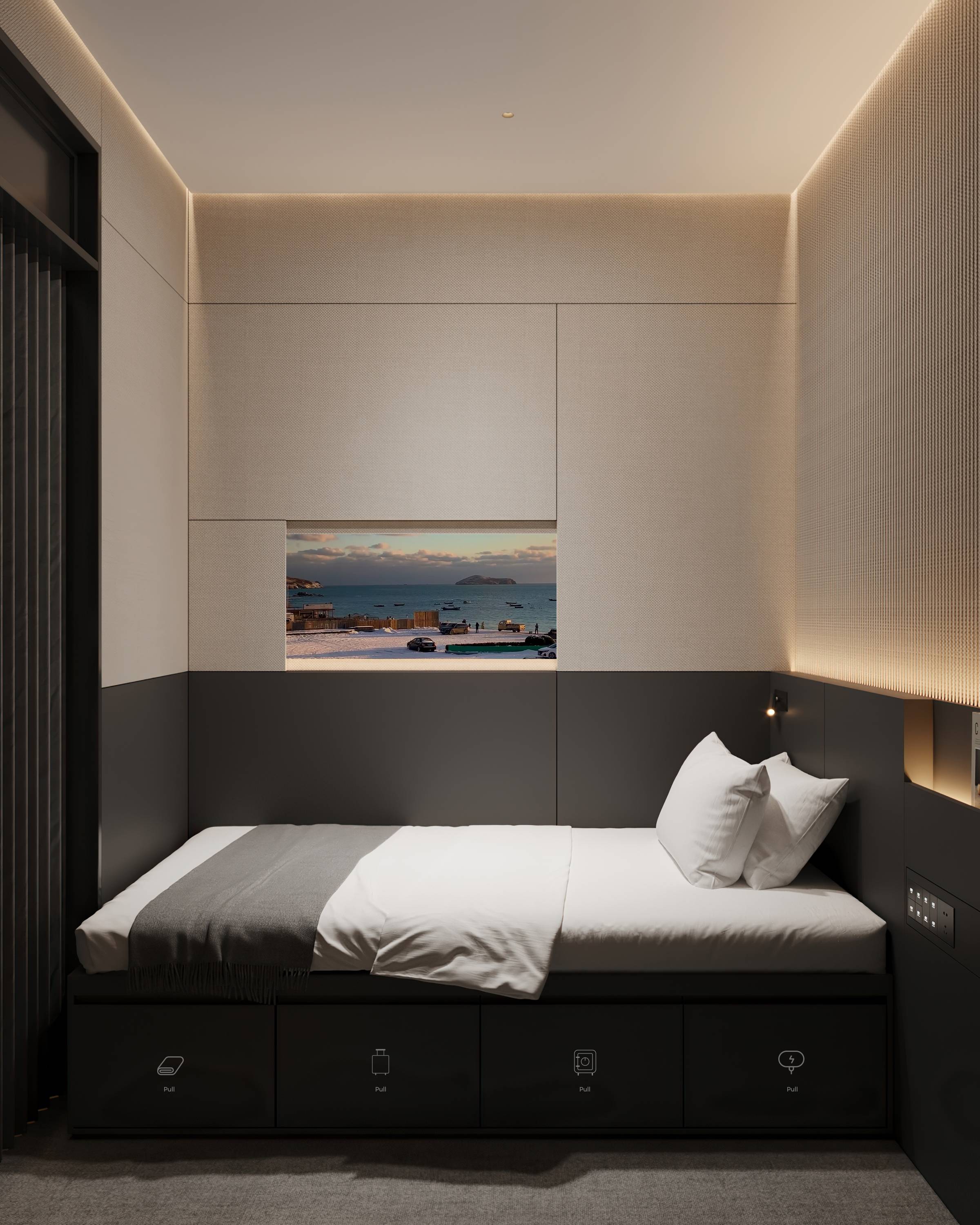 胶囊房以“功能集成”为核心,在紧凑空间内通过立体规划实现高效居住。设计将各项功能巧妙嵌入墙面及床体,将每一寸空间都转化为功能性载体,最终在有限空间内呈现体面且舒适的私密领域,为尽情探索与社交后的休憩提供宁静港湾。