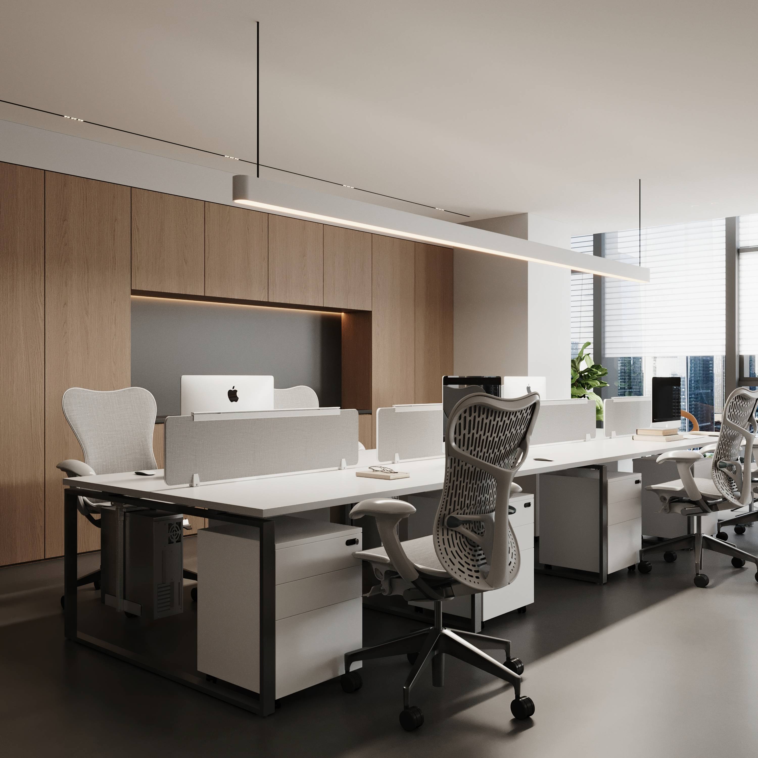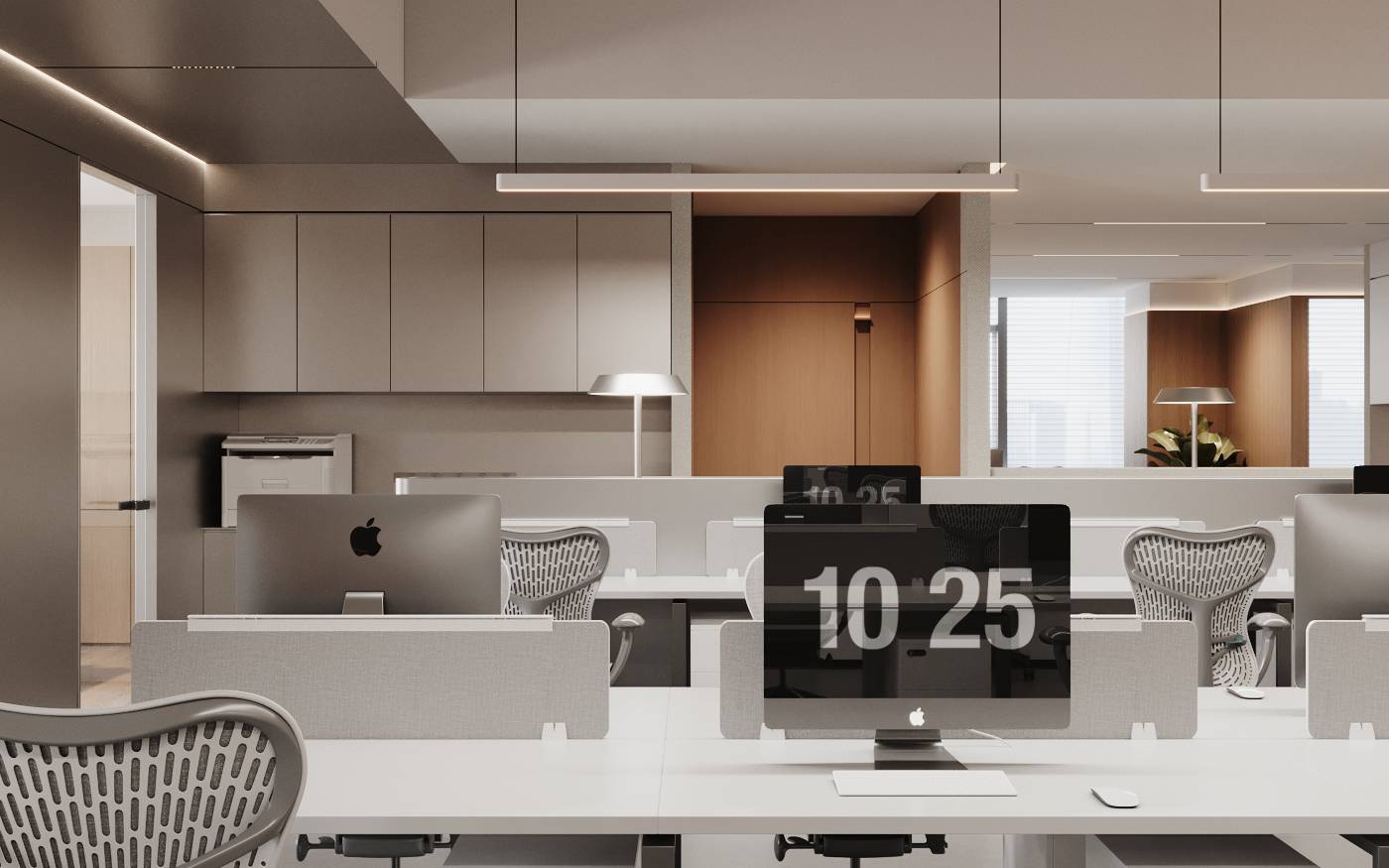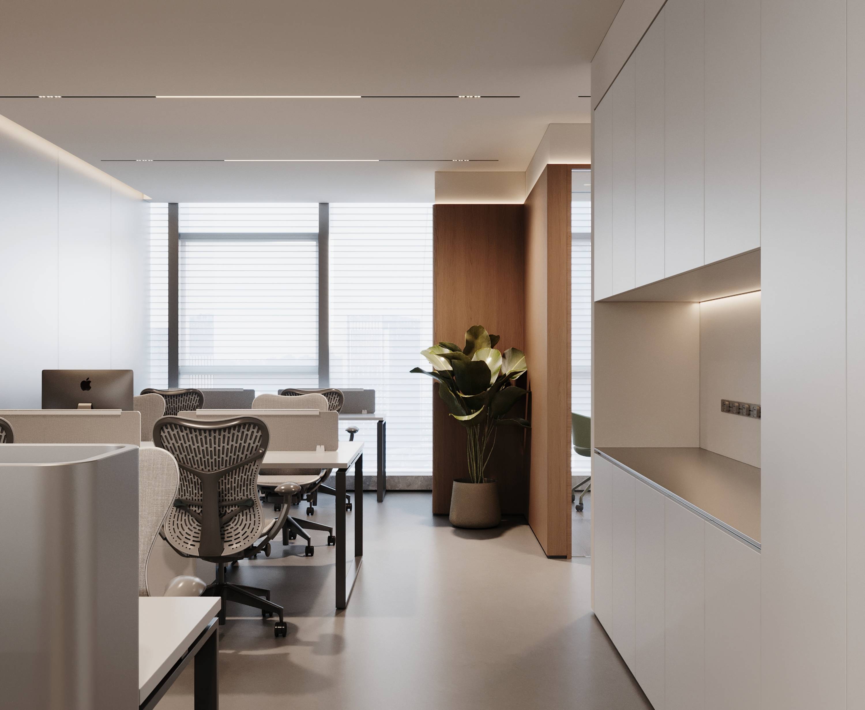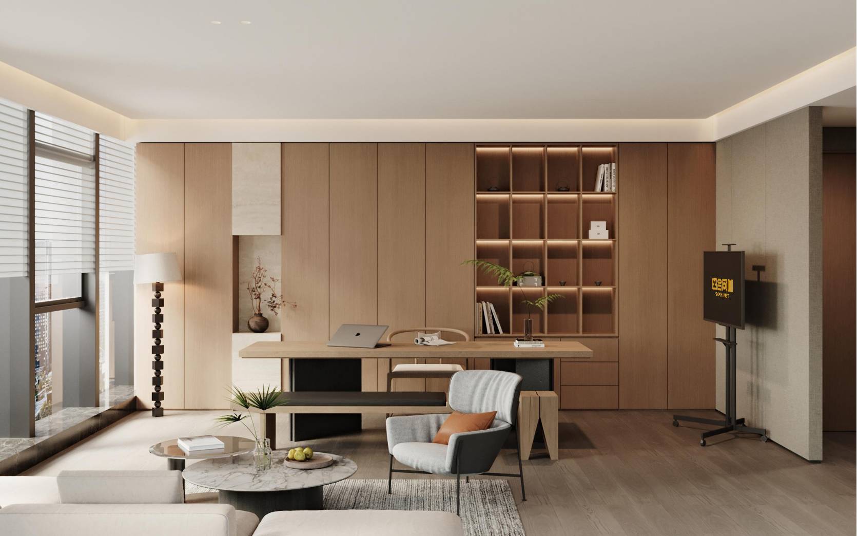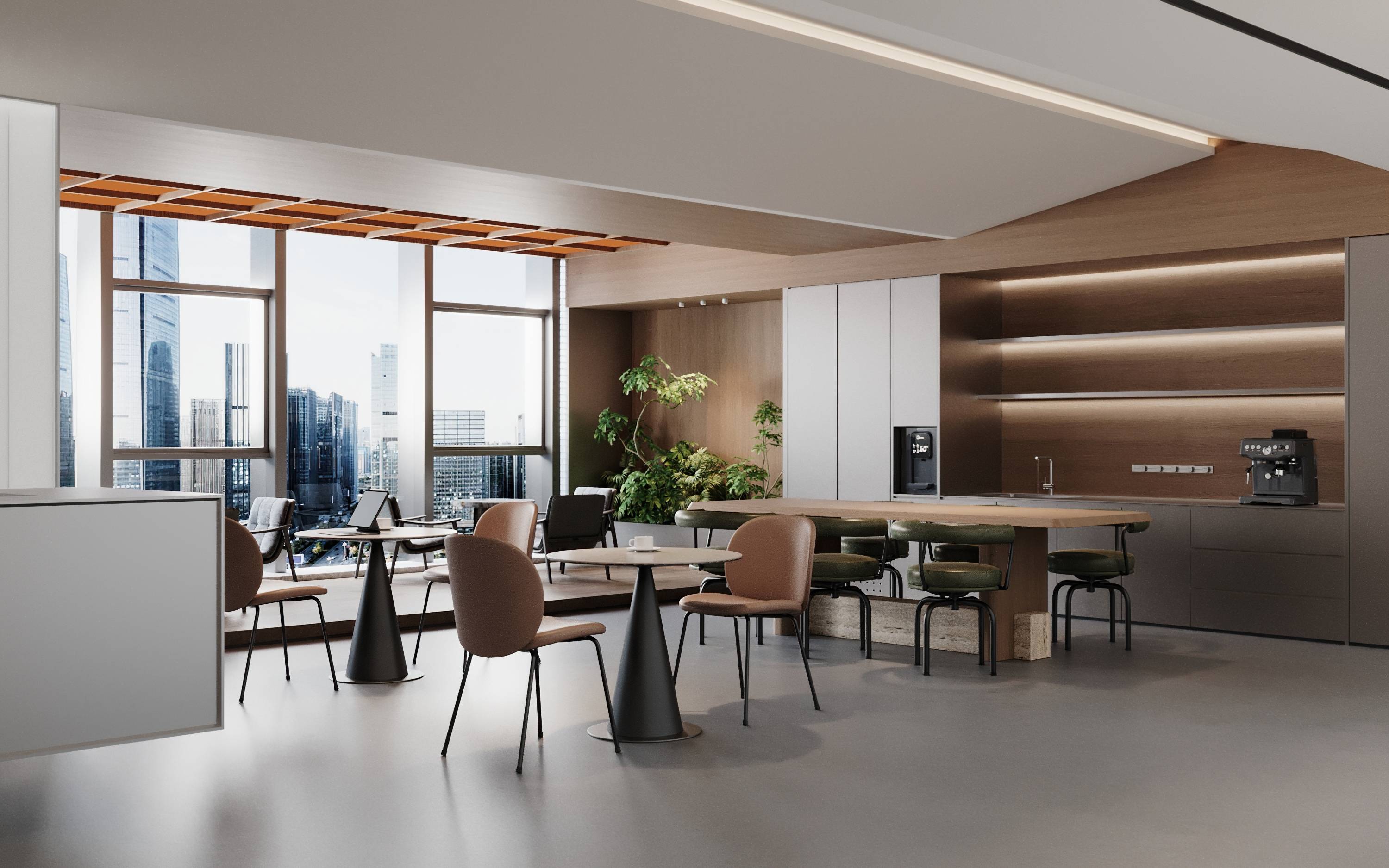 这里是功能高度融合的核心场域。开放的布局确保了视野的无阻与思维的畅通,促进了团队间的即时互动与协作。温润的木色在理性基调中注入持续的温度,营造出专注而不失人文关怀的工作氛围。
