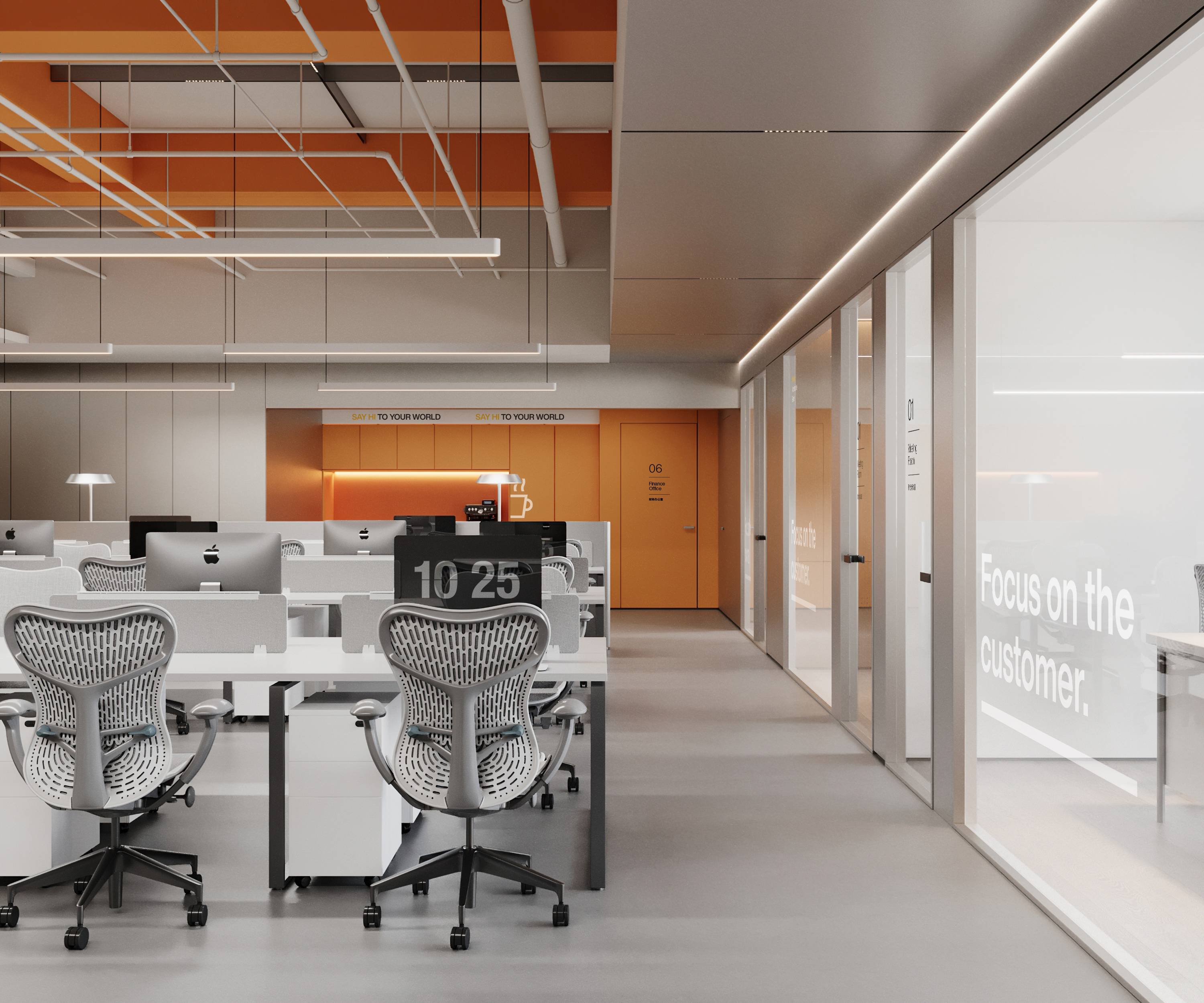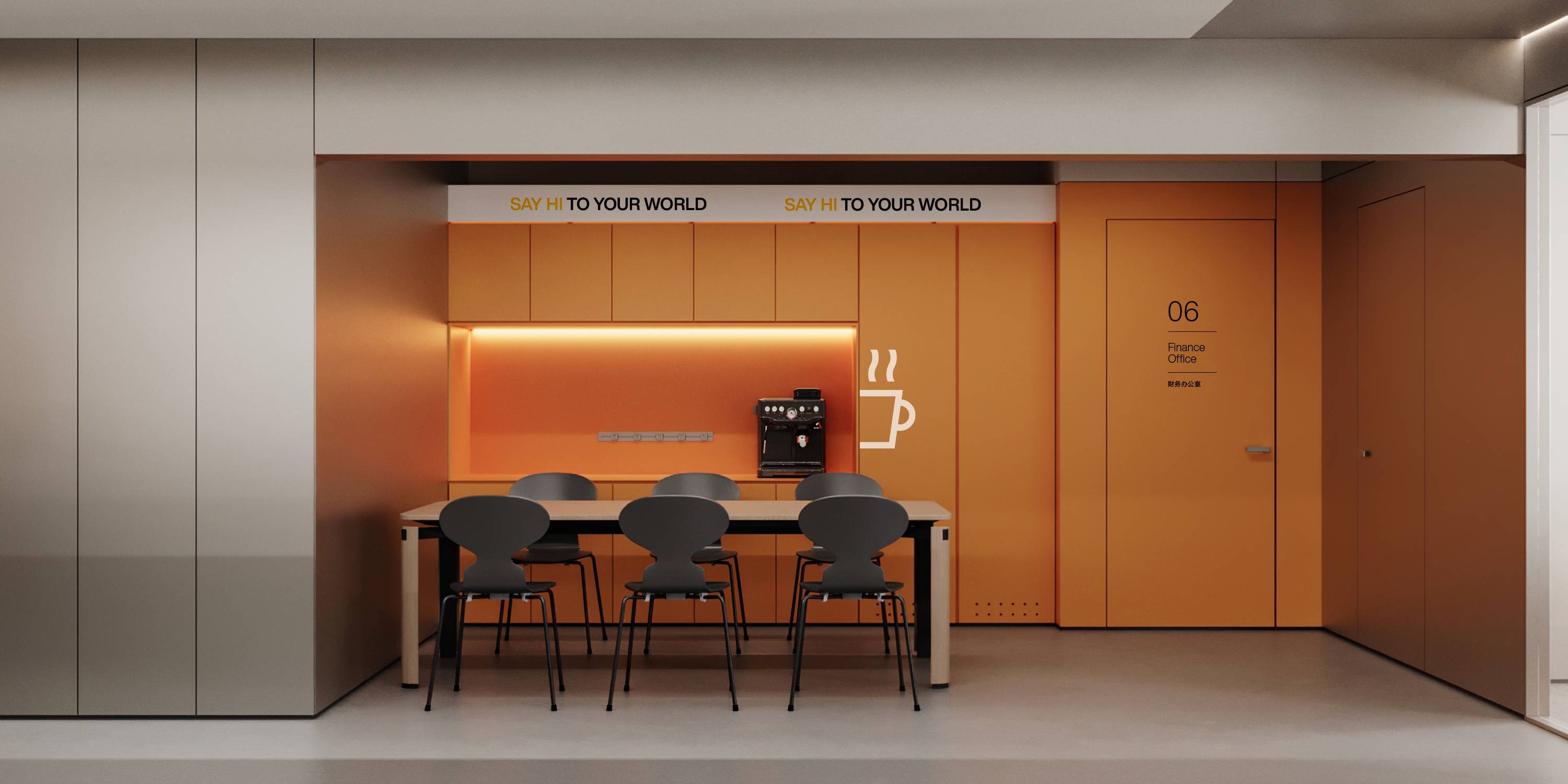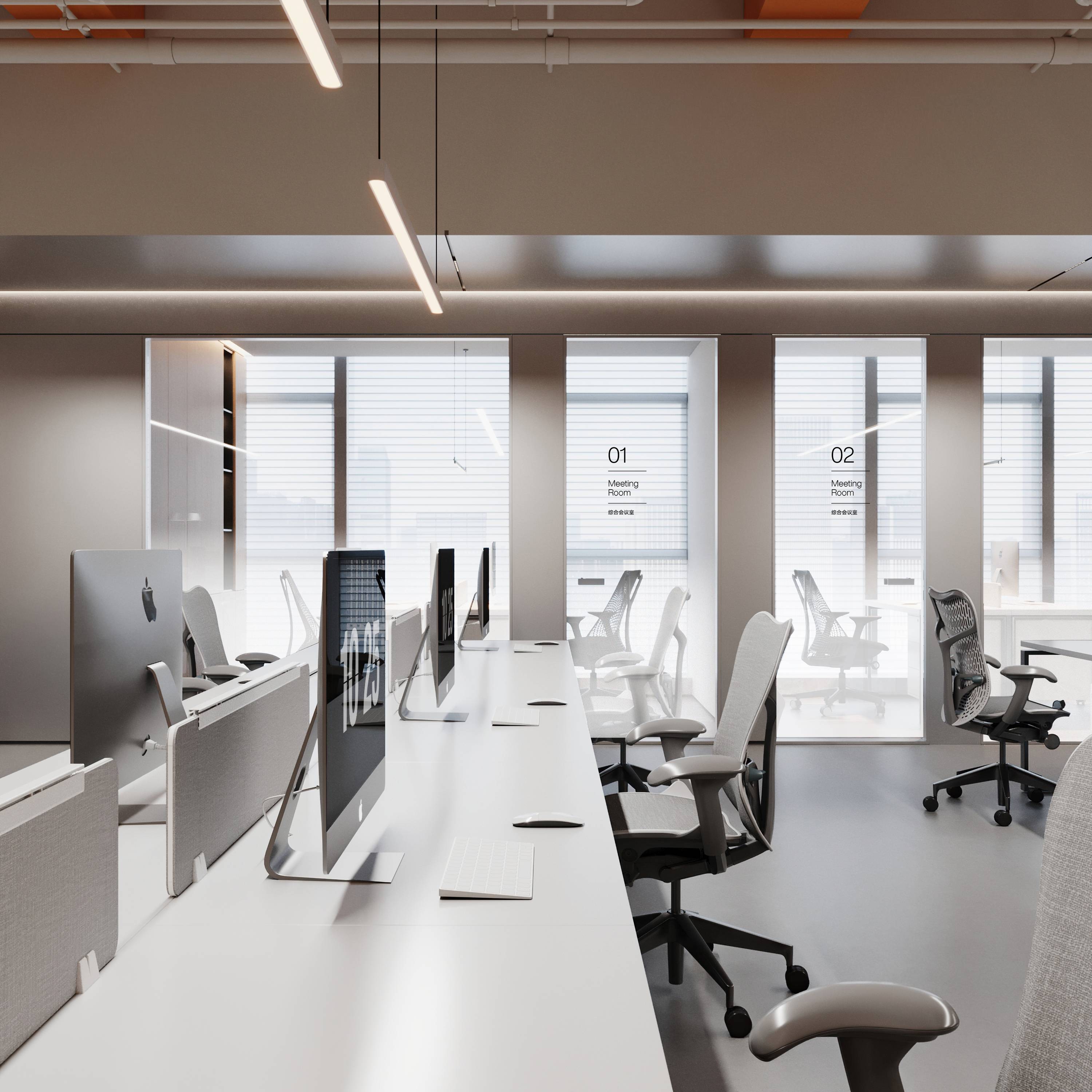 色彩上,以白色与灰色为主导,构成了明亮、干净且专业的整体印象。并运用大面积的棕色提升空间的温度与亲和力,营造出沉稳而舒适的氛围。设计中的点睛之笔在于橙色的局部点缀,这一抹亮色在沉静的主调中迸发出热情与创造力,为办公环境注入了源源不断的活力。