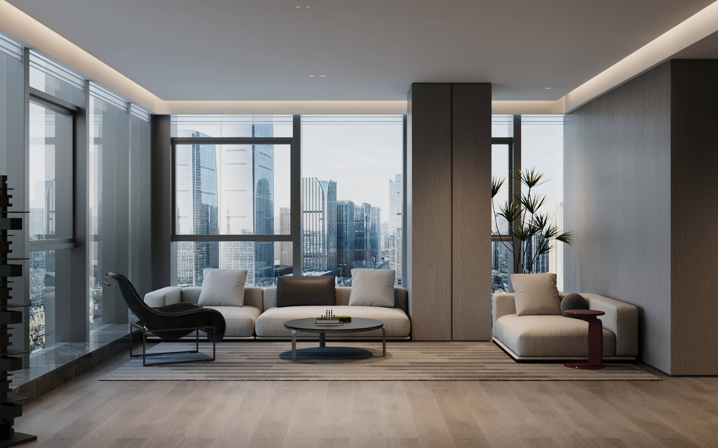 前台即为公司对外的第一印象,设计师运用冷静的线条和简练的体块,率先为空间定调,展现出专业、高效的形象。视线随之被天花延伸的结构线条牵引,深入空间内部。休闲接待区内,几株绿植恰到好处地点缀其间,巨大的落地窗将城市景观定格为动态画作,光与景的自由流动,让整个区域充满开阔气场与呼吸感。
