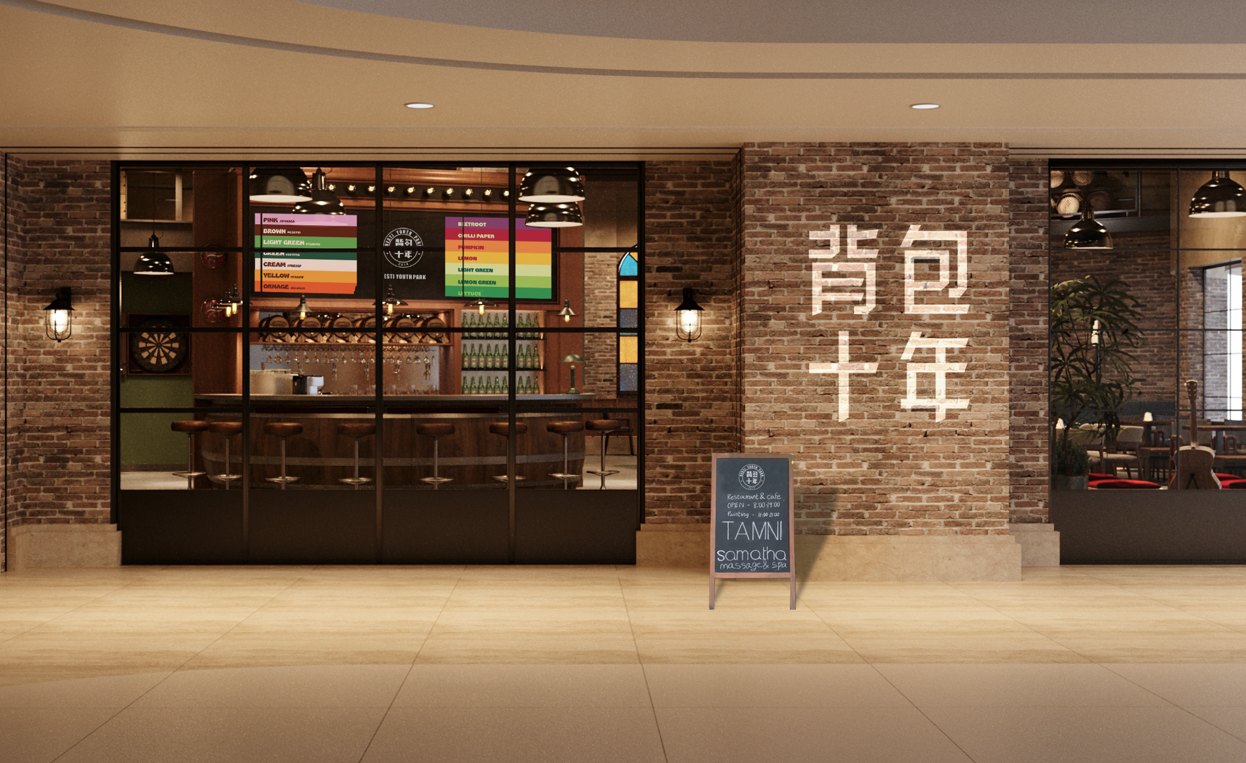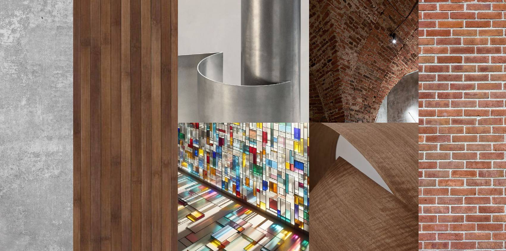Main Materials: Old Wood, Silver Stainless Steel, Gray Tiles, Red Bricks, Colored Glass, Artistic Paint
