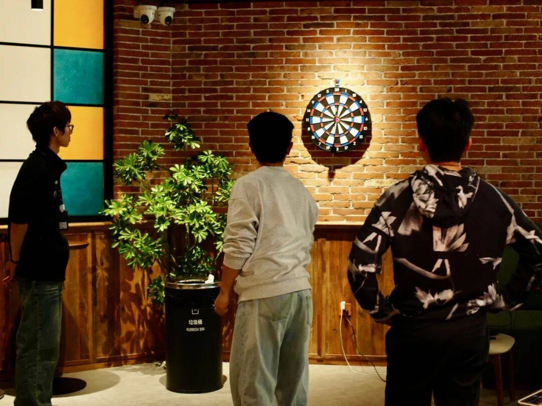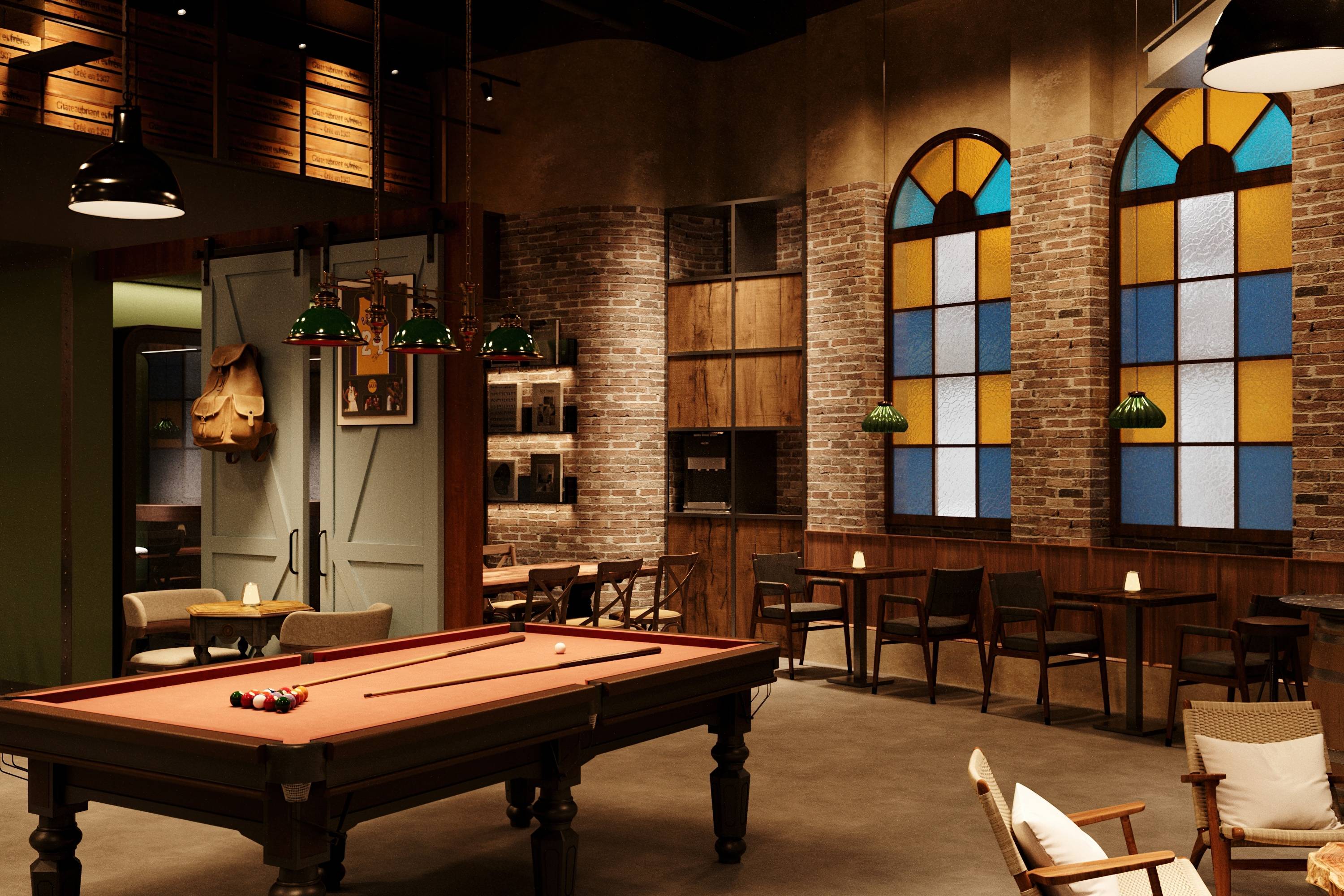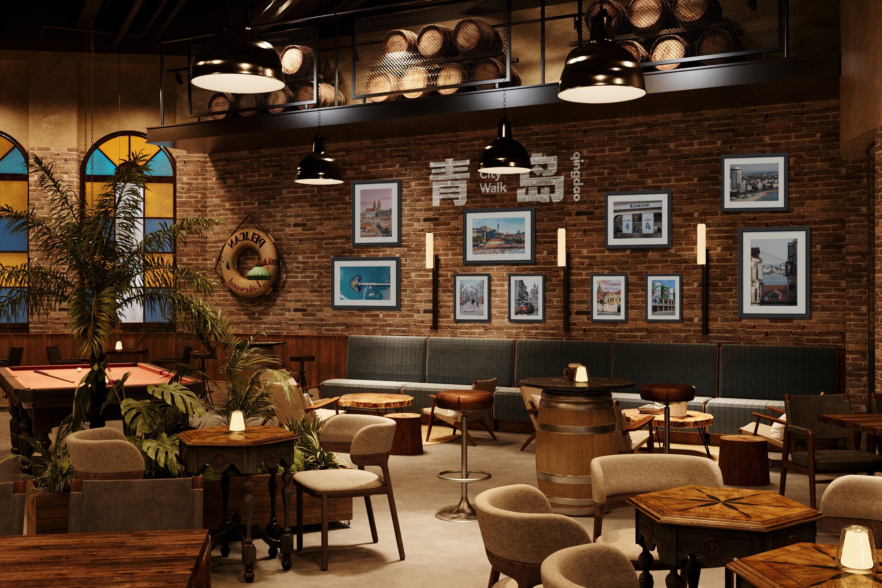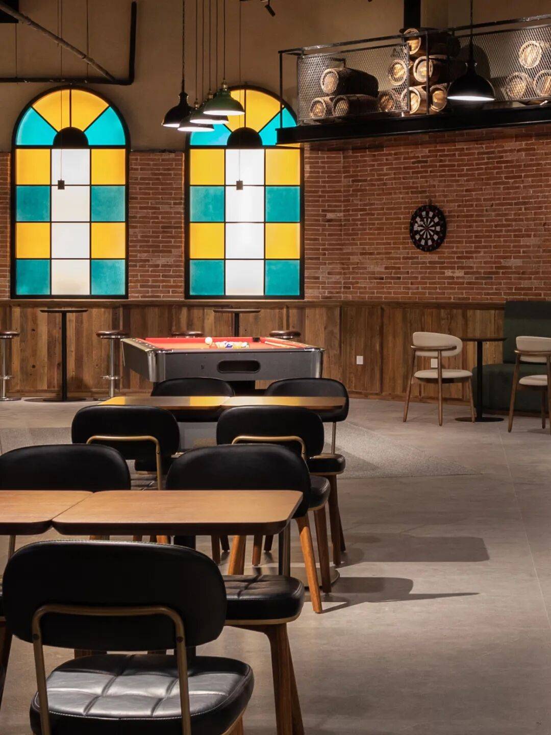 转入休闲区,松弛换了一种更生动的表达。飞镖、台球等娱乐设施如同散落的音符,勾勒出随性玩耍的轻快节奏;而软包长椅、木质桌椅与点缀的绿植,则围合出几个适合独处或低声交谈的安静角落。红砖墙上,欧式彩色玻璃拱窗将青岛特有的斑斓光影滤进室内,温柔地投下如记忆般晃动的色块。