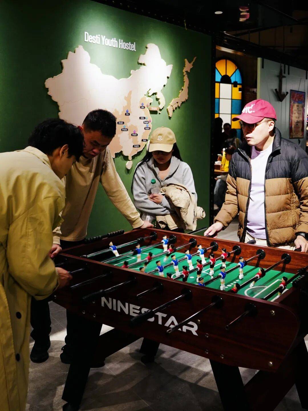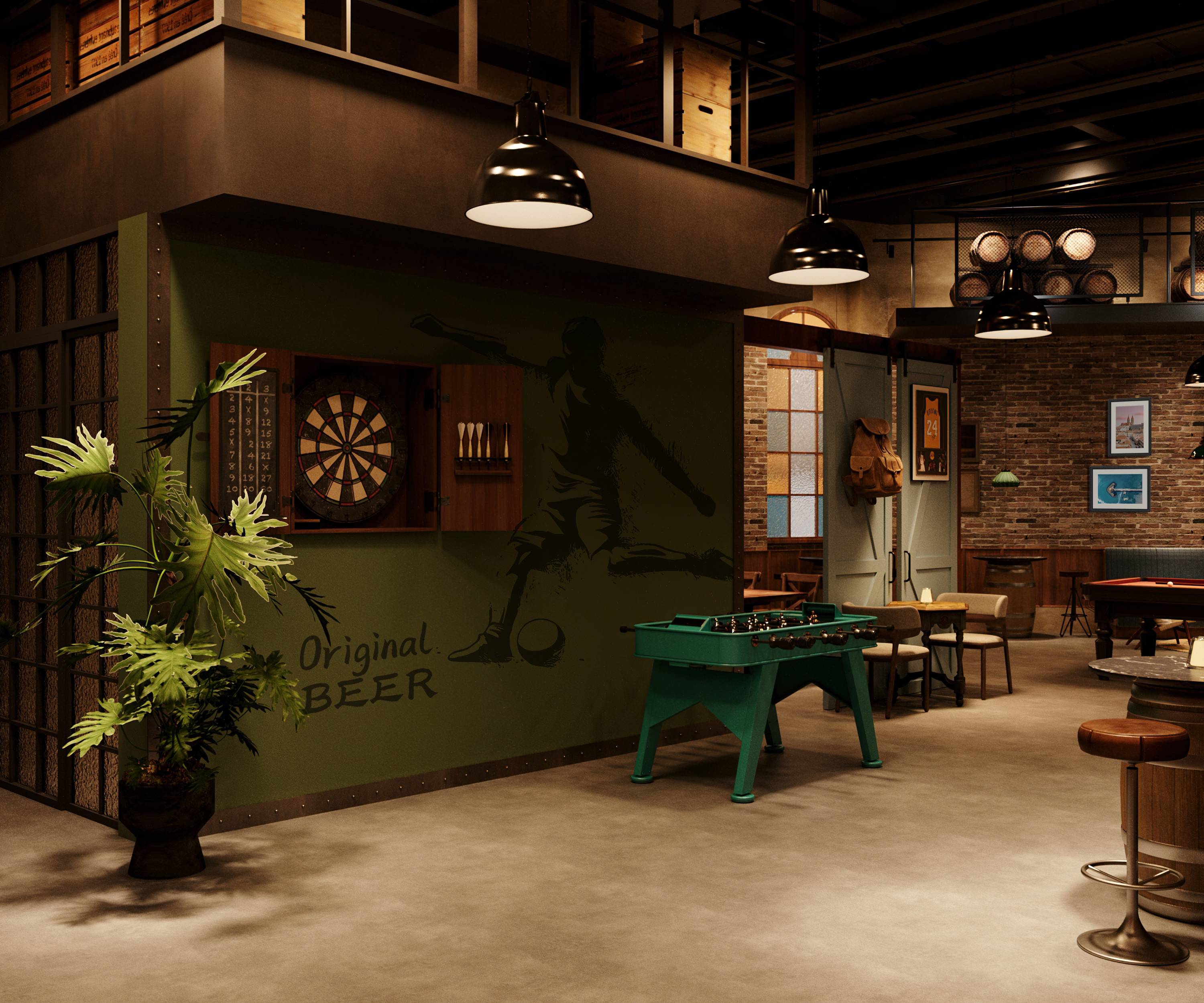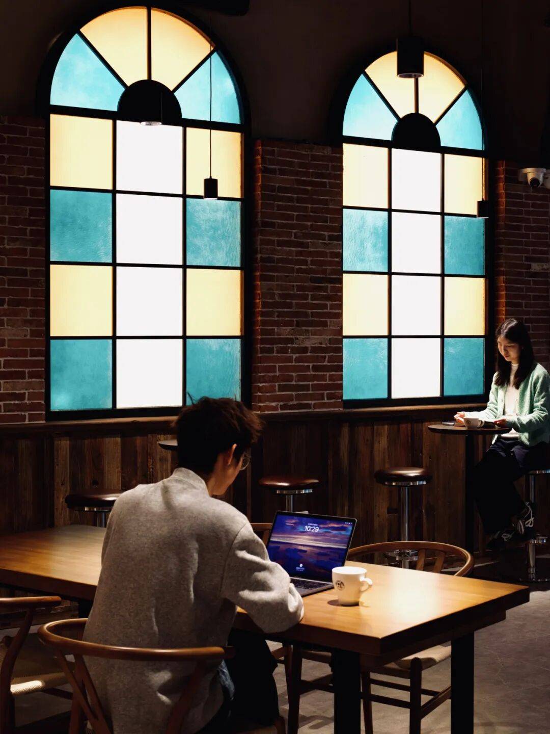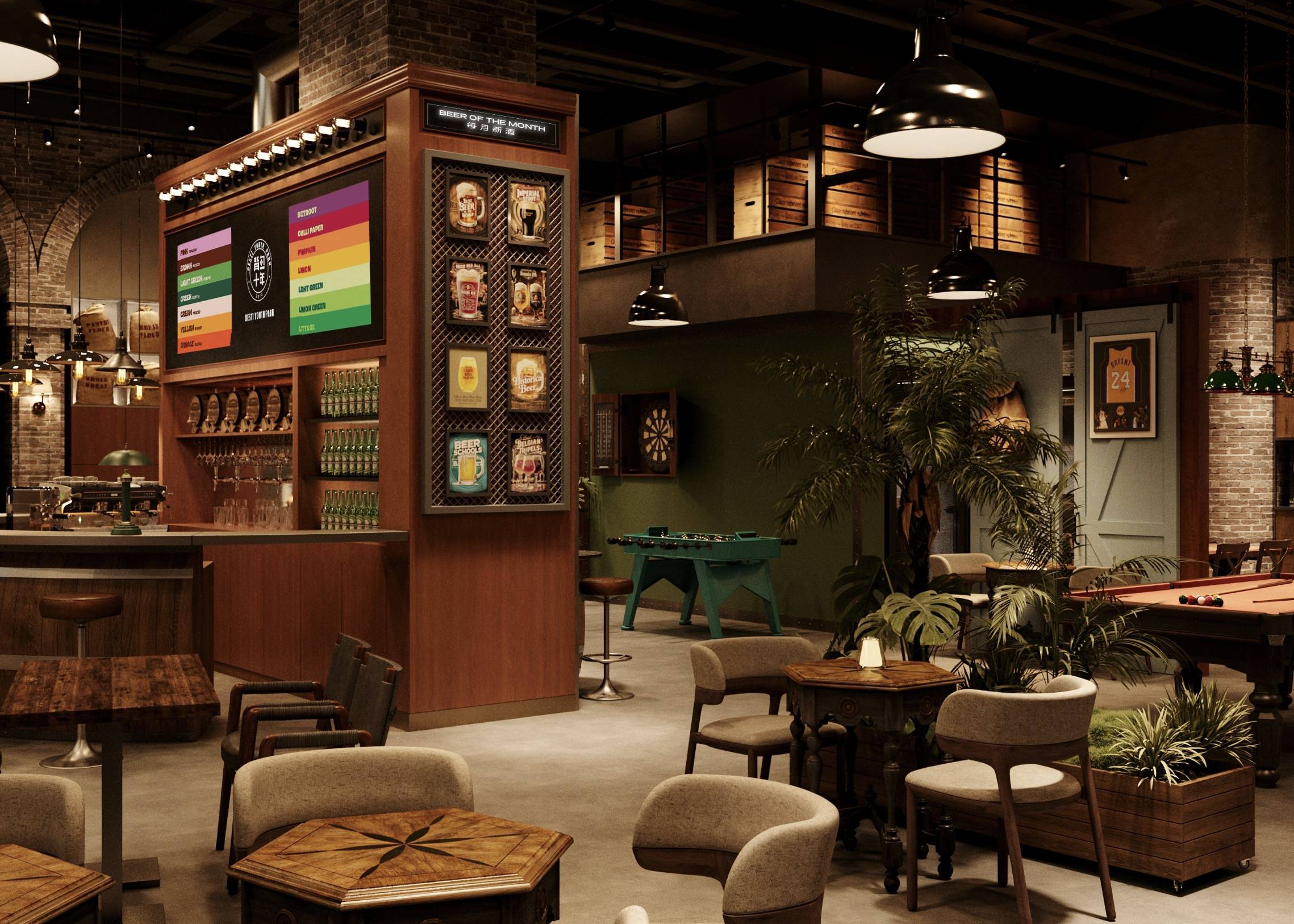 转入休闲区,松弛换了一种更生动的表达。飞镖、台球等娱乐设施如同散落的音符,勾勒出随性玩耍的轻快节奏;而软包长椅、木质桌椅与点缀的绿植,则围合出几个适合独处或低声交谈的安静角落。红砖墙上,欧式彩色玻璃拱窗将青岛特有的斑斓光影滤进室内,温柔地投下如记忆般晃动的色块。