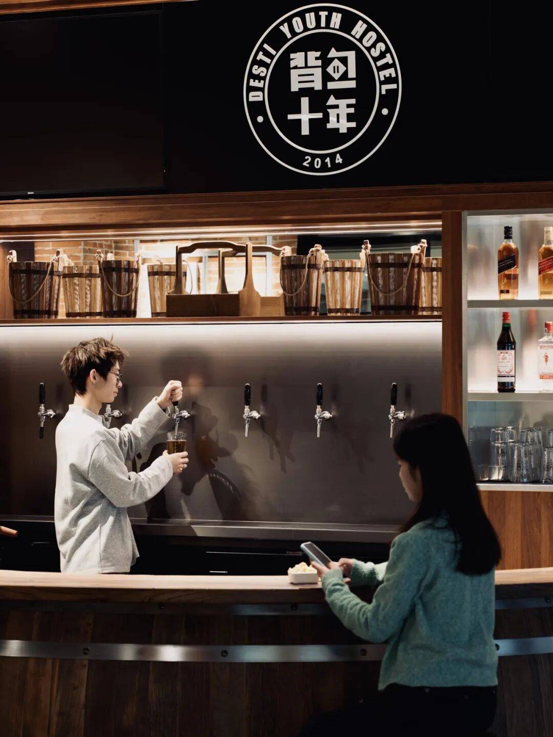 空间中央,是由木饰面围合而成的巨型酒桶吧台与酒柜,它不仅是青岛文化的实体承载,也是旅舍内视觉与行为的双重焦点。
