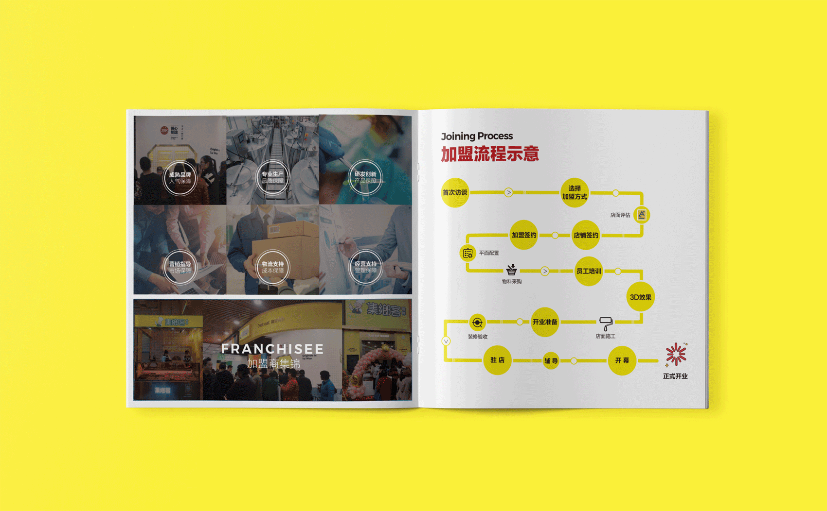 基于品牌的规划与策略,意在打造小店铺、大连锁的加盟发展策略,品牌色彩在这个环节中起着至关重要的作用。我们希望以醒目、识别度高作为第一位,就像链家的绿色、肯德基的红色...等等。我们选取了清新时尚的柠檬黄,作为品牌的主色调,在门头的运用上,以大面积色块为主。远远看去,非常醒目,意在吸引消费者的注意力,从而提升集乡客在消费者认知当中的品牌影响力!