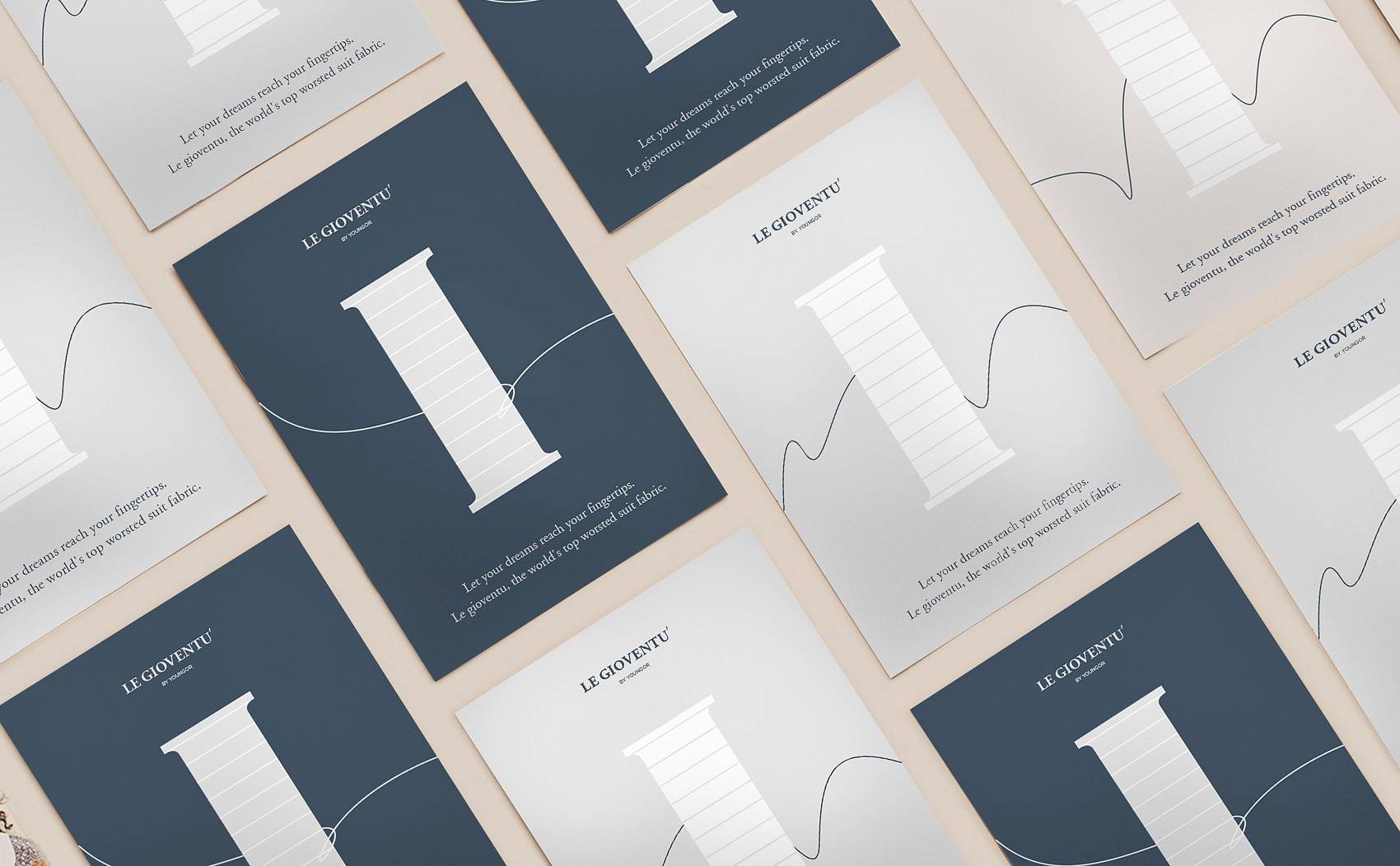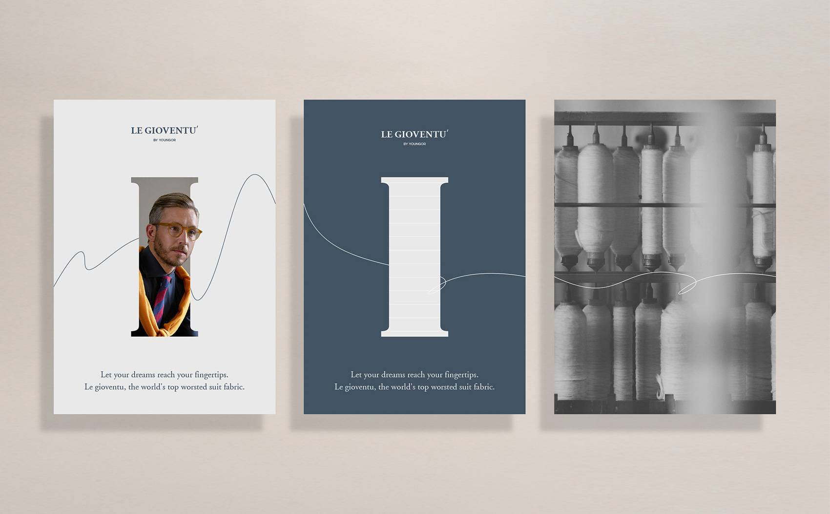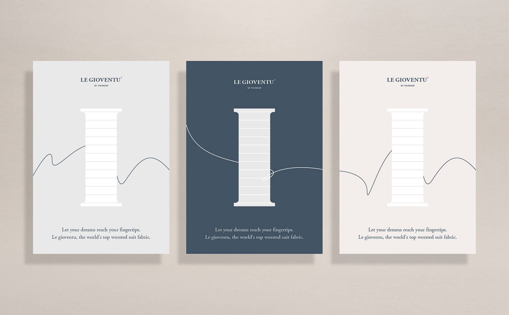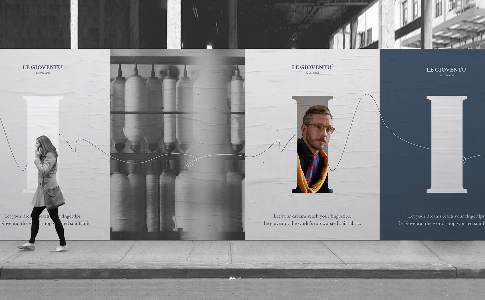 不断变化的纱线,代表着LE GIOVENTU'对面料工艺品质的探索与追求。纱线穿越不同的载体,贯穿整个视觉体系,持续的表达品牌的品类感,并塑造雅戈尔毛纺独特的品牌气质。