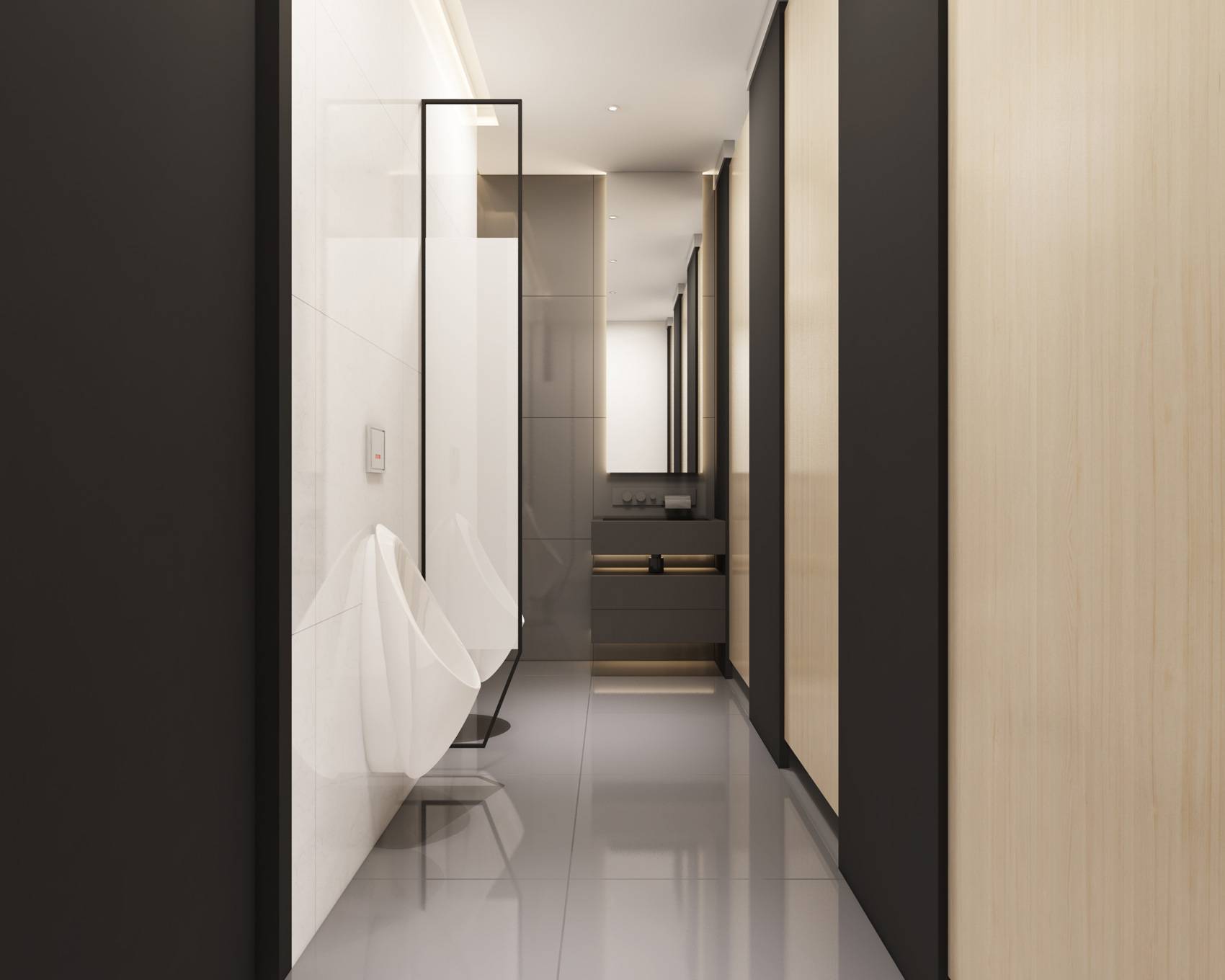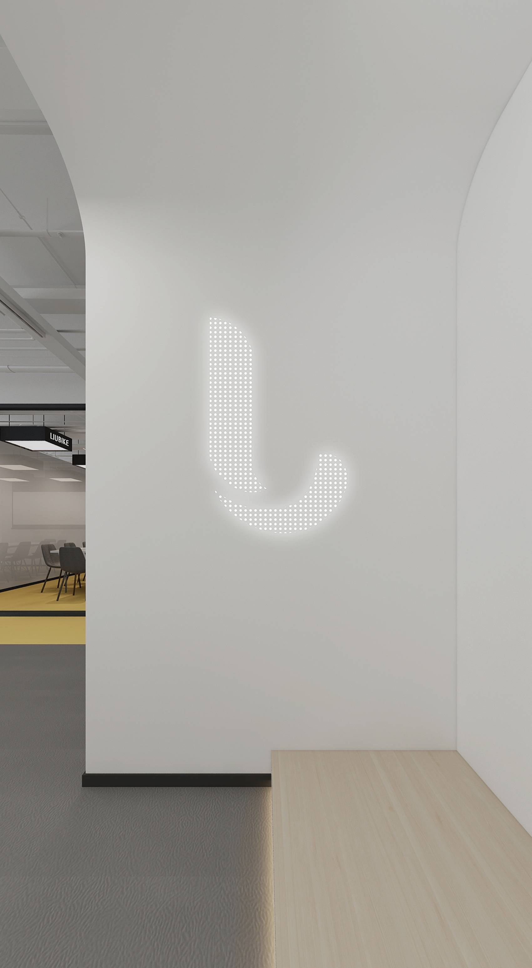 在入口展示区域,简单的黑色线条与白色弧度的层次运用,丰富空间感。入口的logo墙以及灯光的使用,既保证了充足的照明需求,也直观的展现了公司品牌形象。