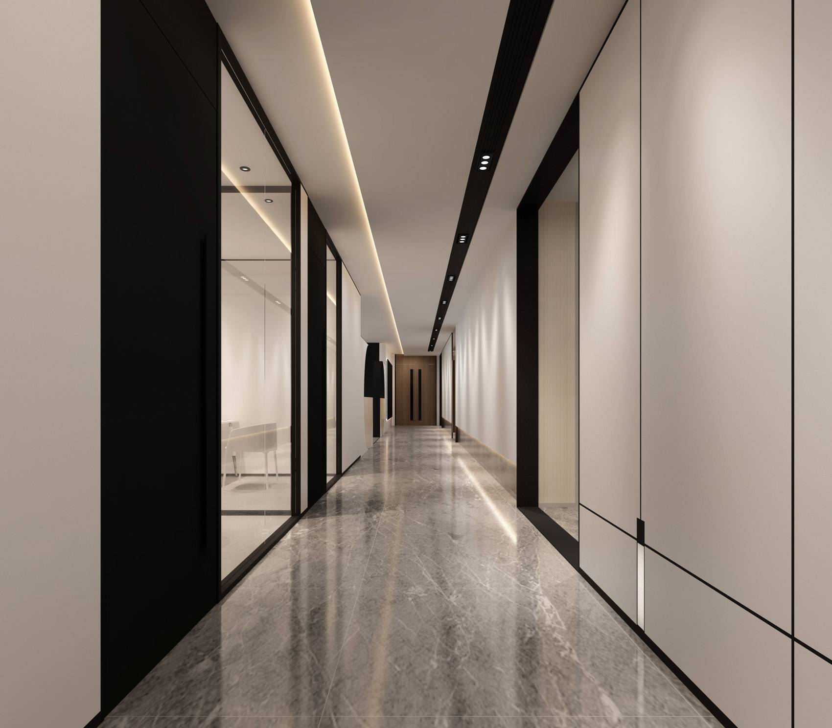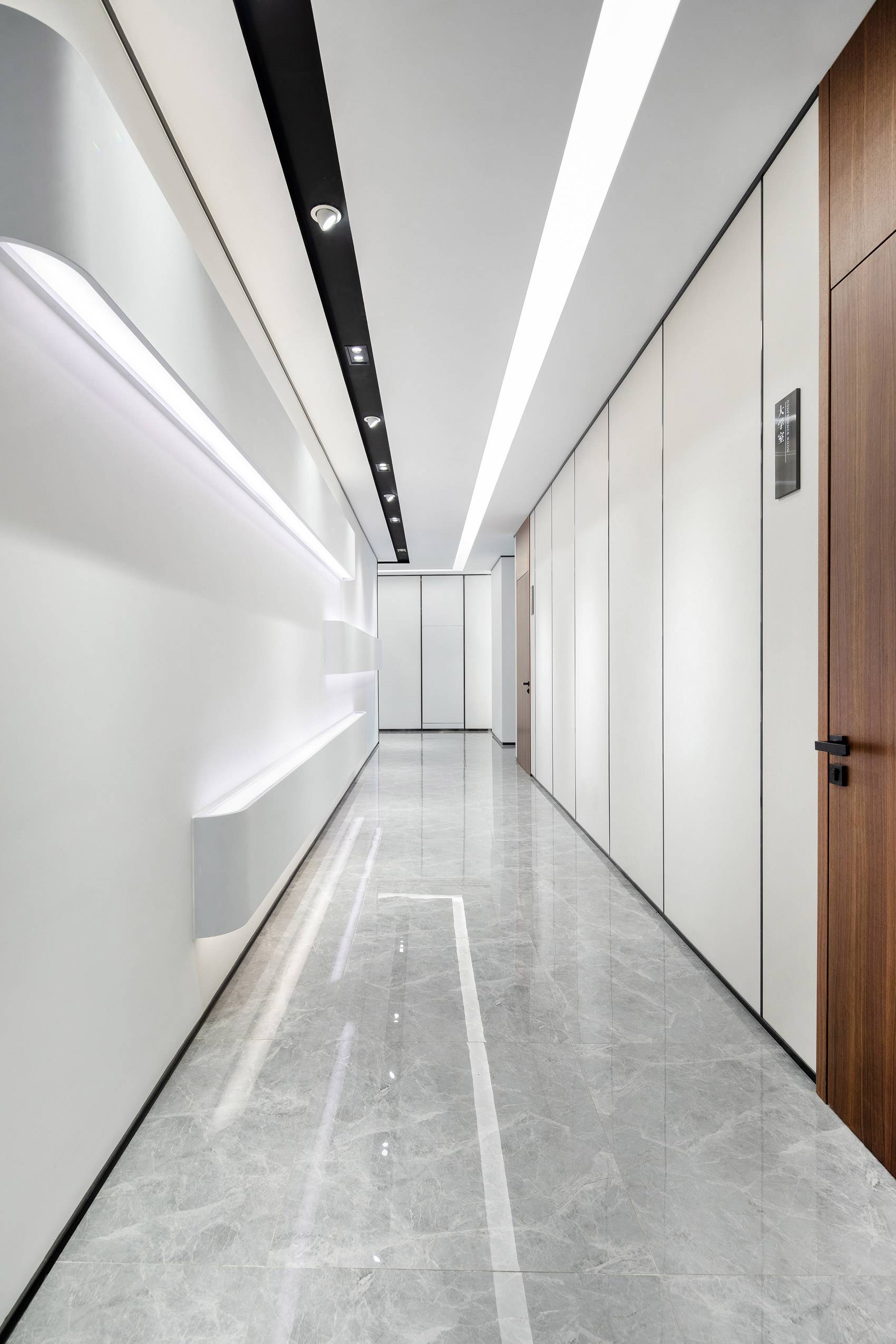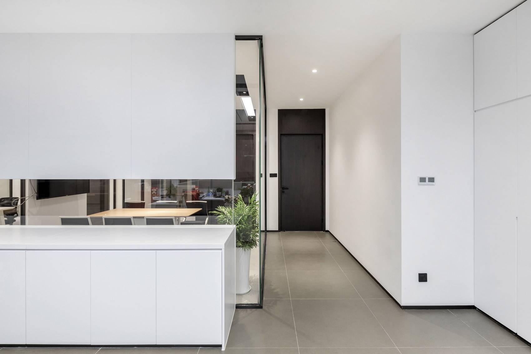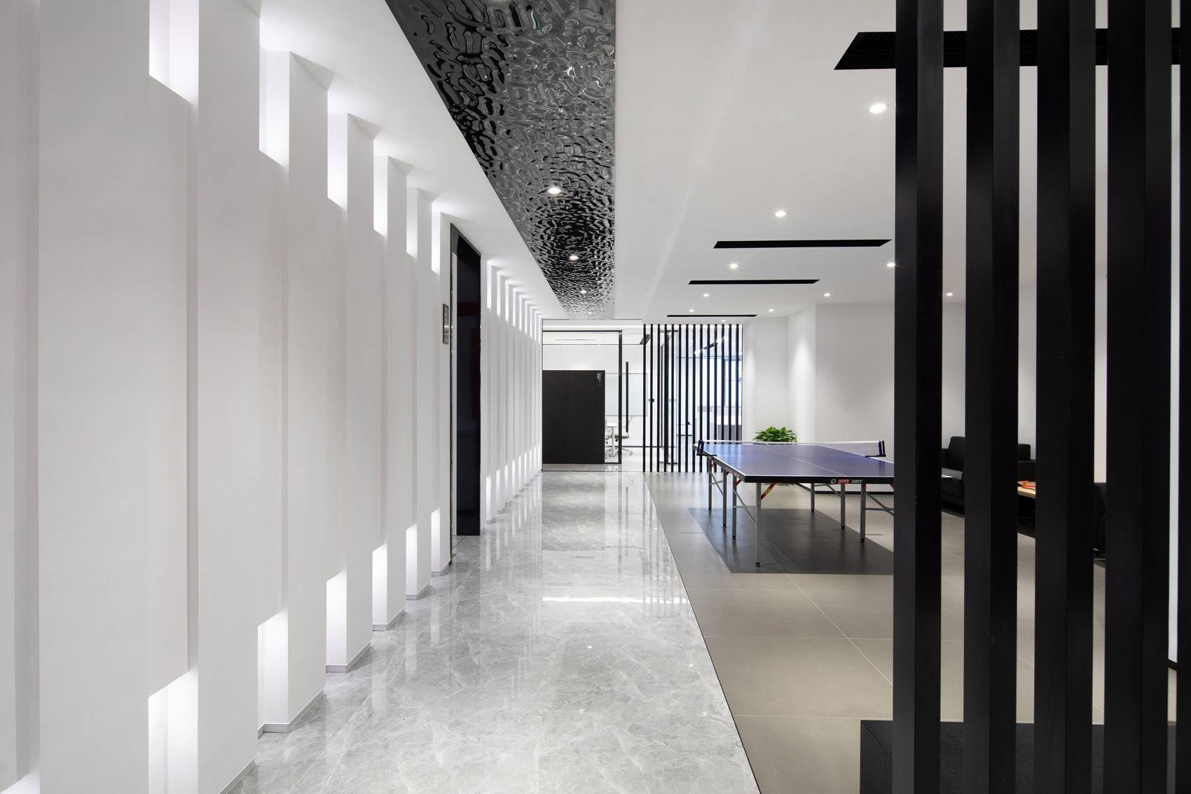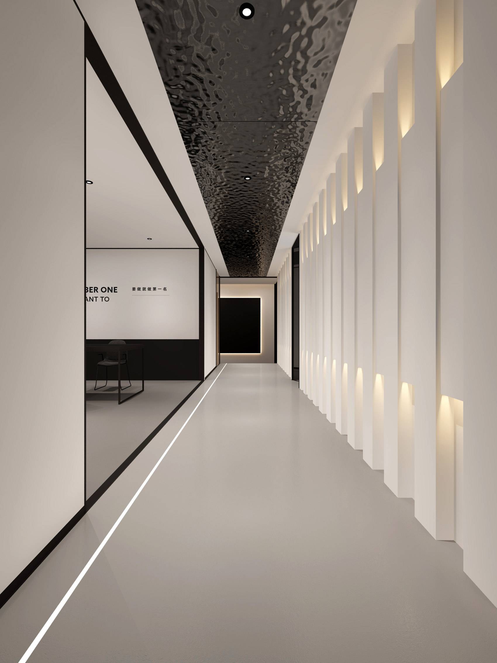 这是一个四面方正的空间,三面走廊各不相同却又互相关联,员工在走廊行走的时候可以看到不一样的。或举头是一片波光粼粼,让人在不自知中剥离心底的焦躁,回归平静的本心状态。或简洁黑白,快速将人带入工作氛围中去。