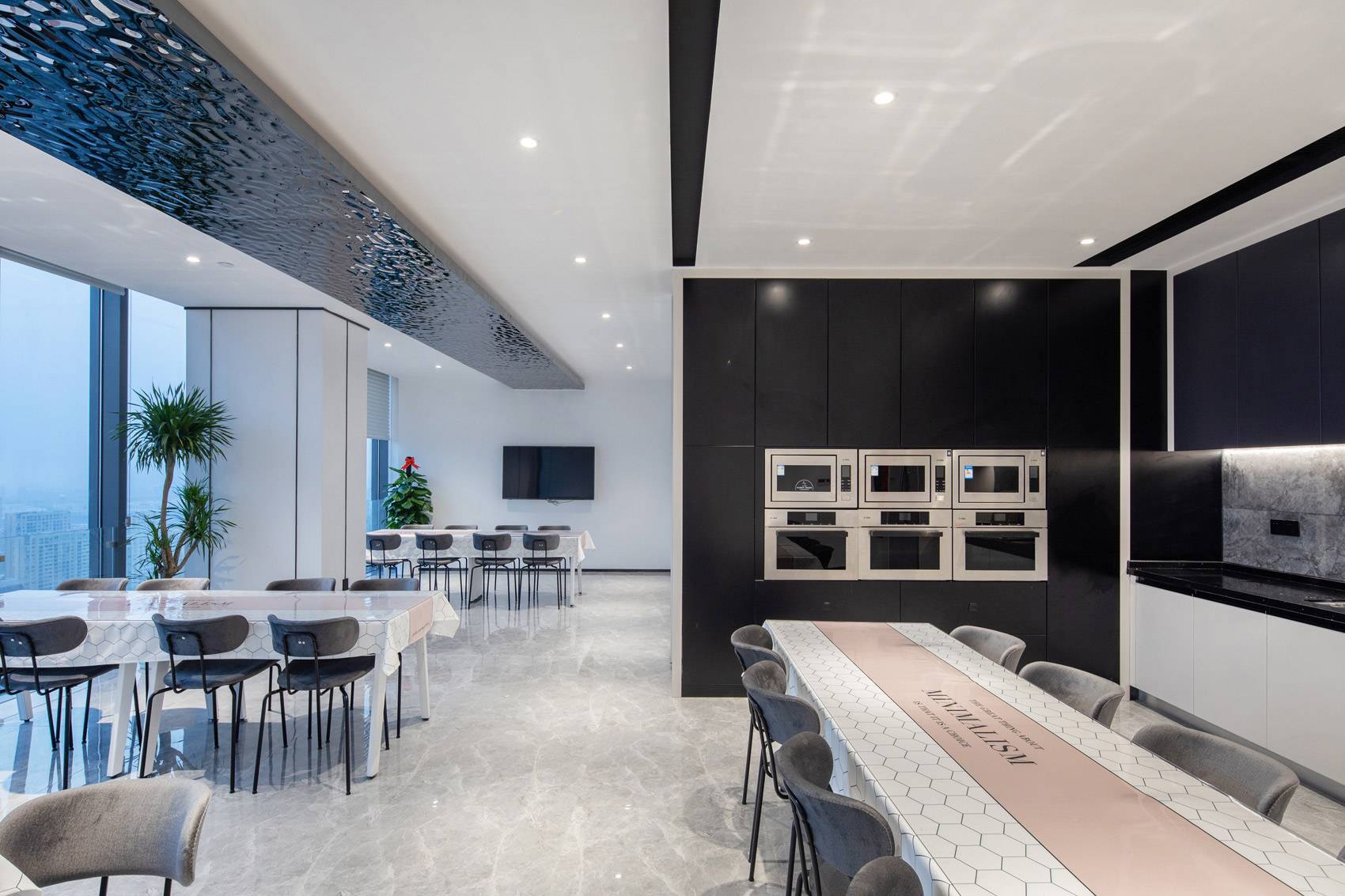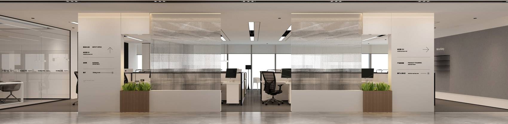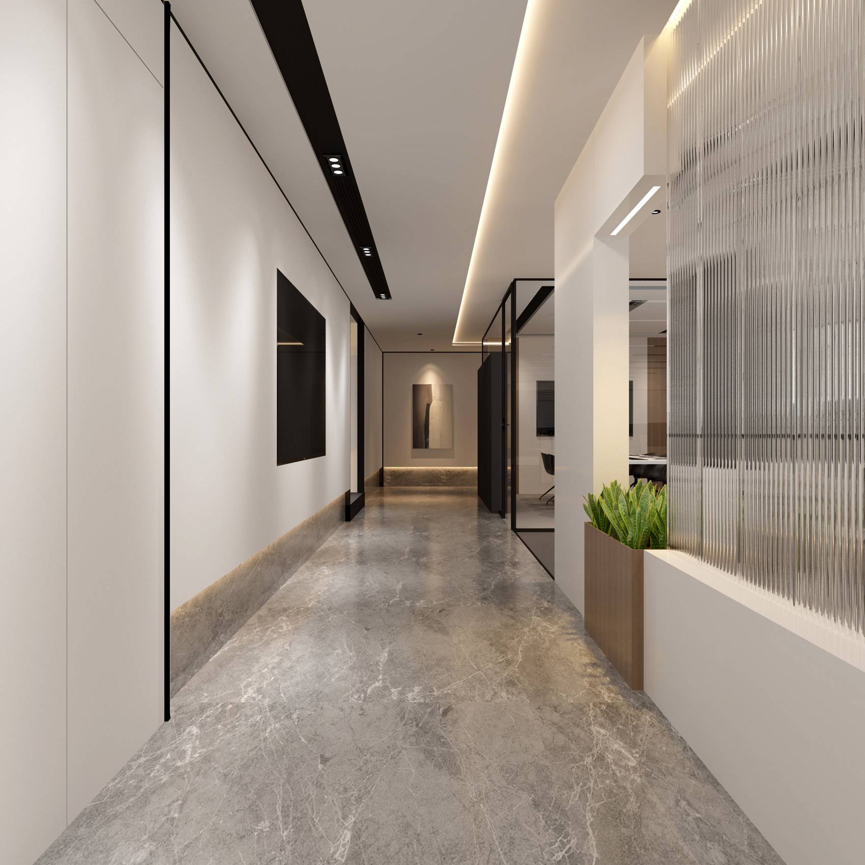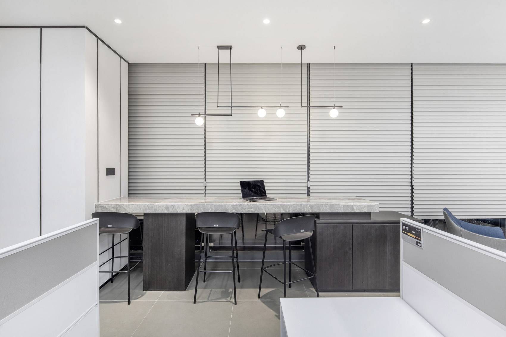 这是一个四面方正的空间,三面走廊各不相同却又互相关联,员工在走廊行走的时候可以看到不一样的。或举头是一片波光粼粼,让人在不自知中剥离心底的焦躁,回归平静的本心状态。或简洁黑白,快速将人带入工作氛围中去。