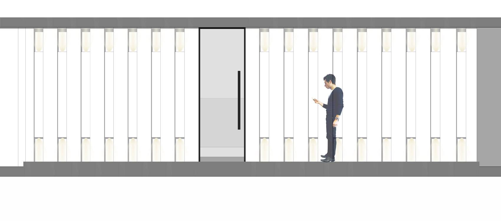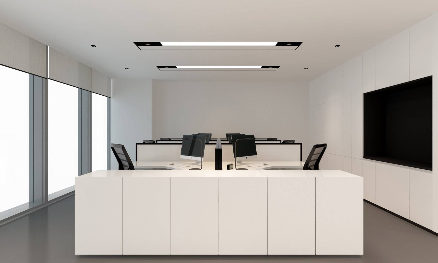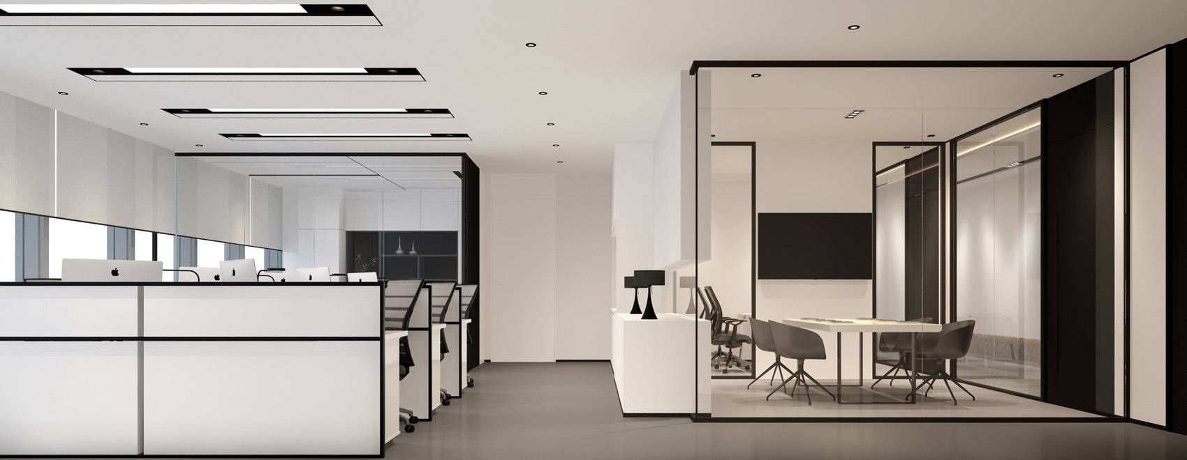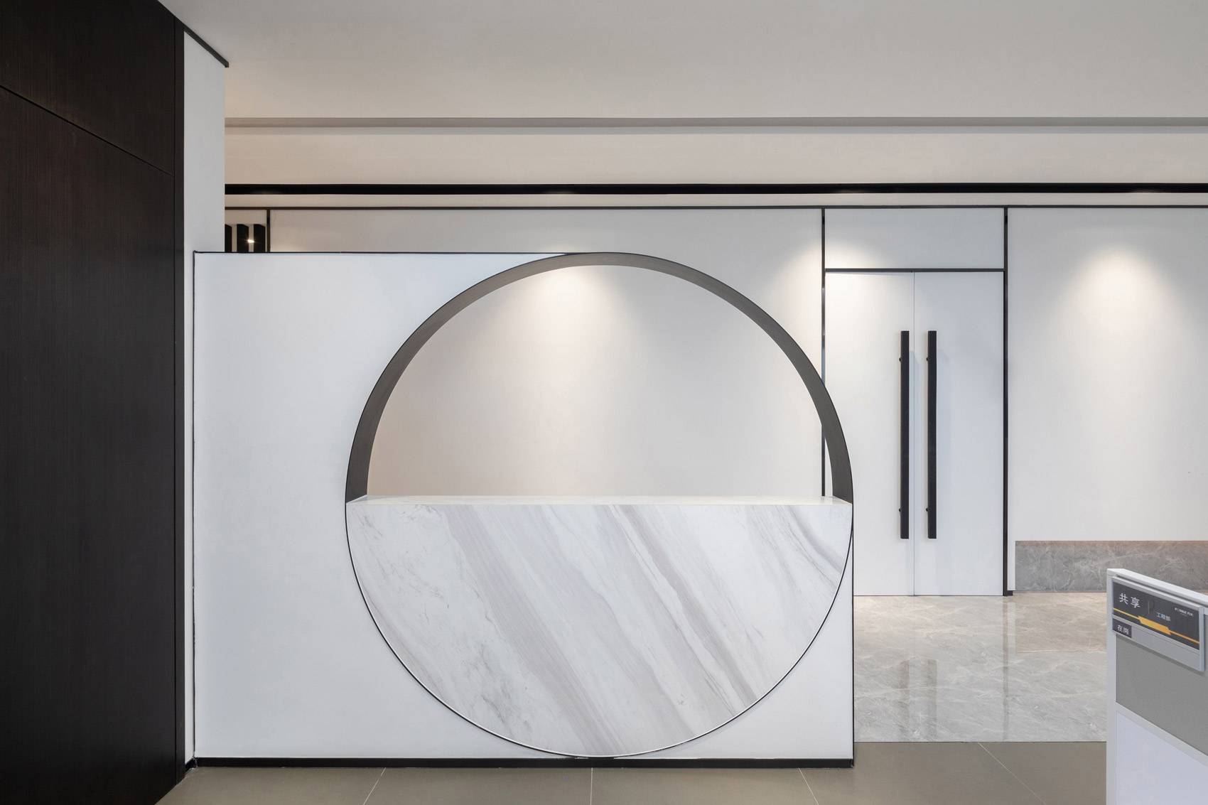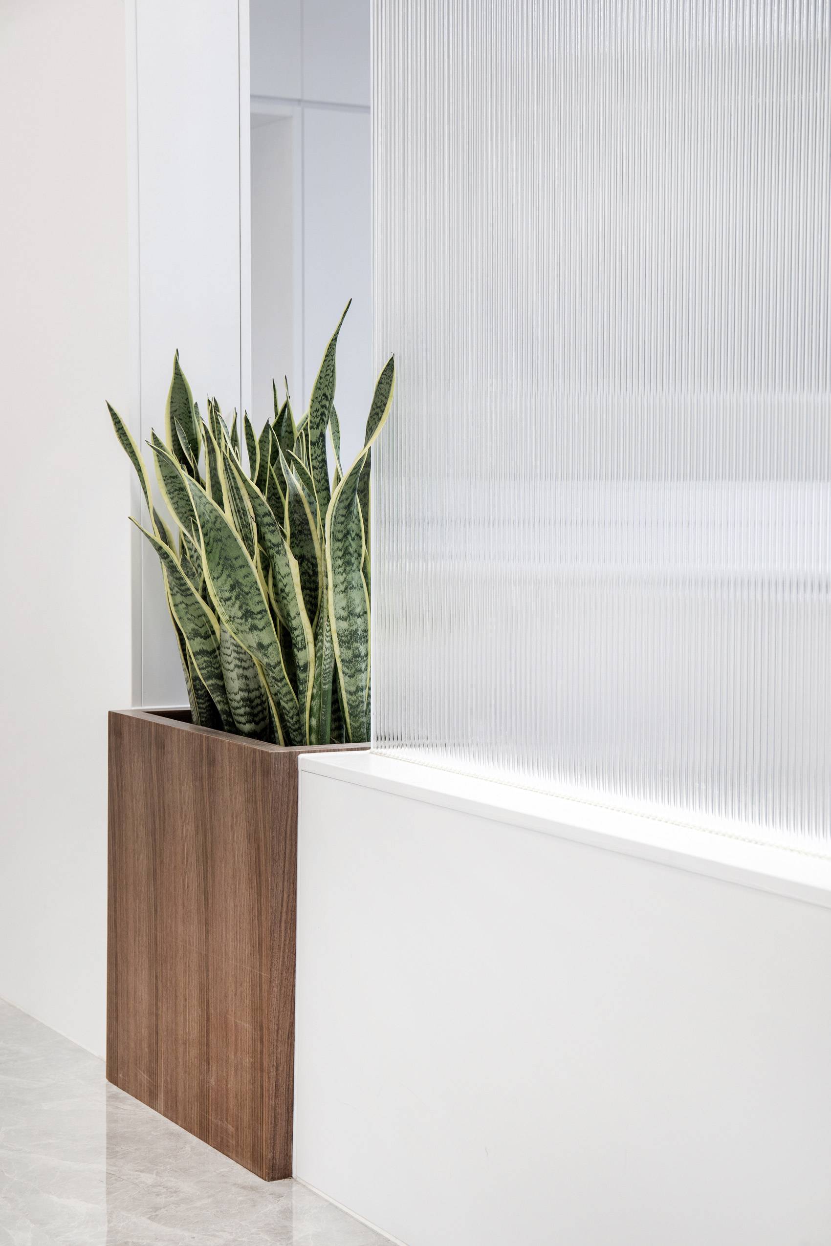 这是一个四面方正的空间,三面走廊各不相同却又互相关联,员工在走廊行走的时候可以看到不一样的。或举头是一片波光粼粼,让人在不自知中剥离心底的焦躁,回归平静的本心状态。或简洁黑白,快速将人带入工作氛围中去。