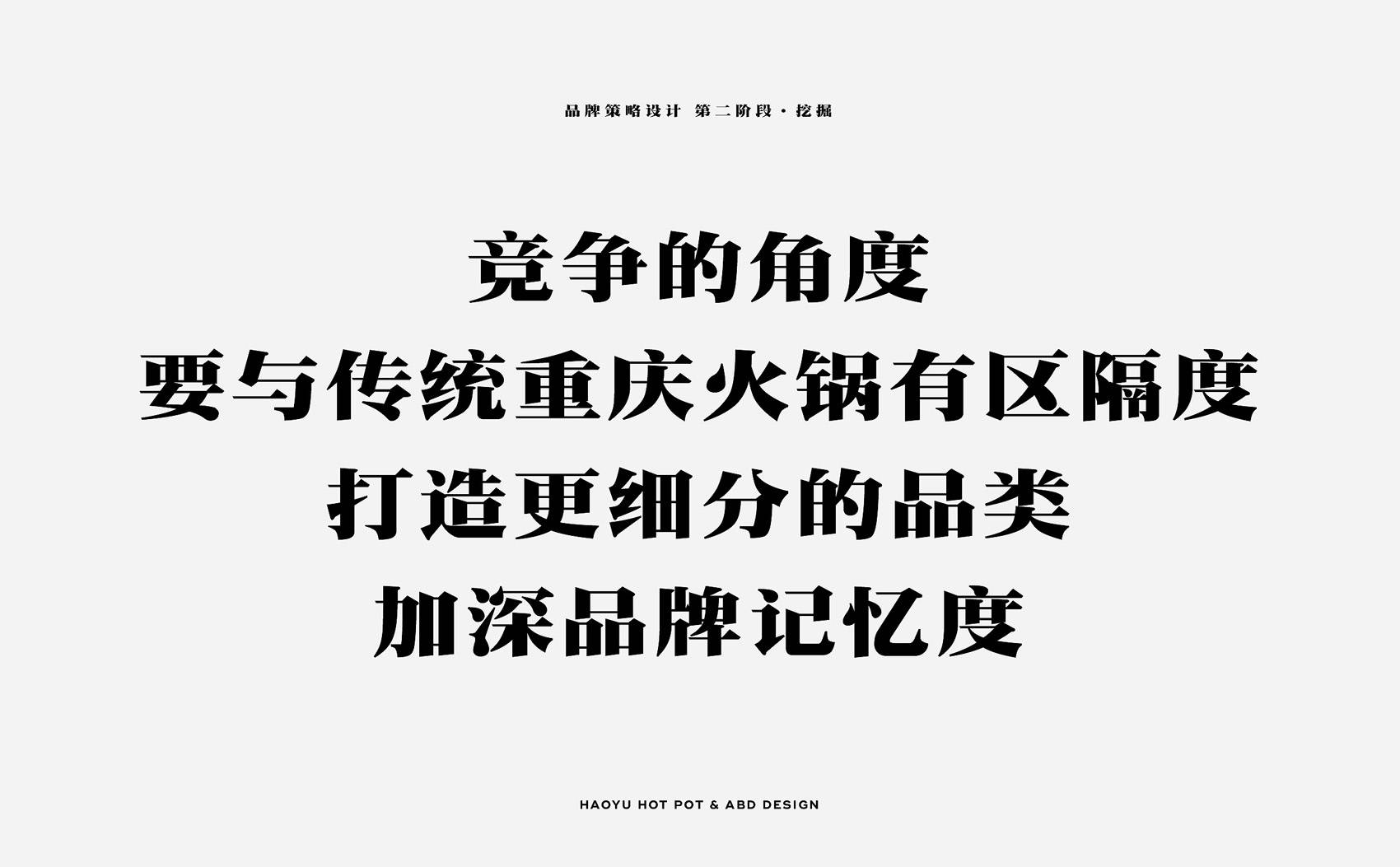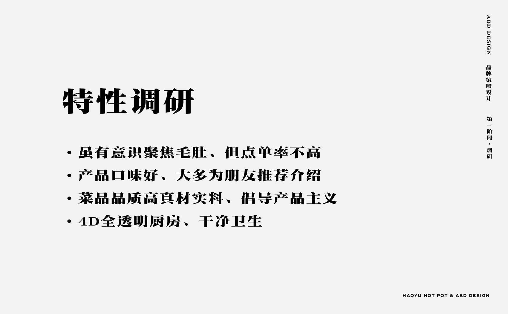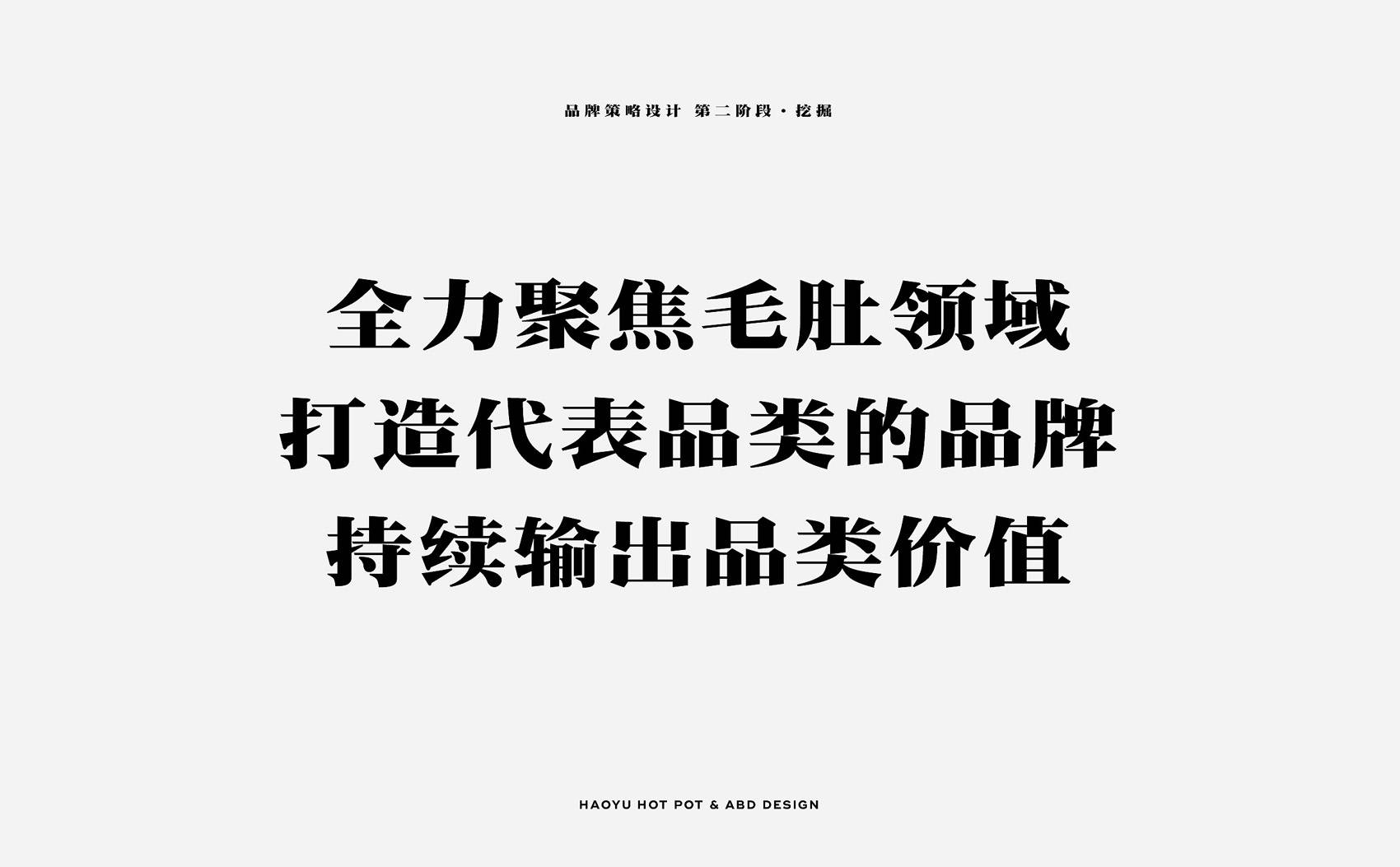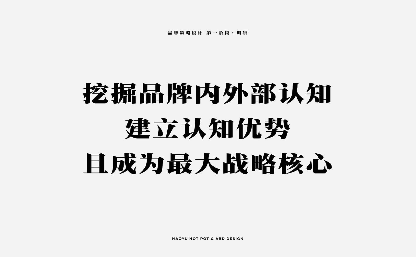 本次项目不同于传统的升级项目,我们深度结合了策略思维模型进行设计。豪渝火锅品牌升级全案,坚持基于策略思维,进行了深度的市场调研分析,其中包括了内部、外部、传播三大块的梳理与分析,结合豪渝现有的资源配称,从而得到品牌的核心点,全力聚焦毛肚火锅,持续打造品类品牌。