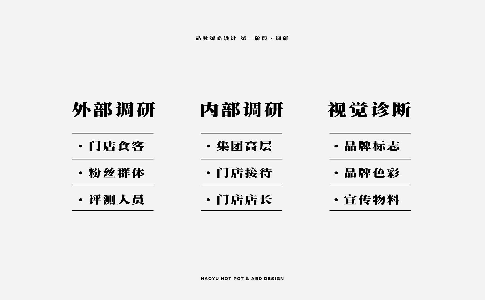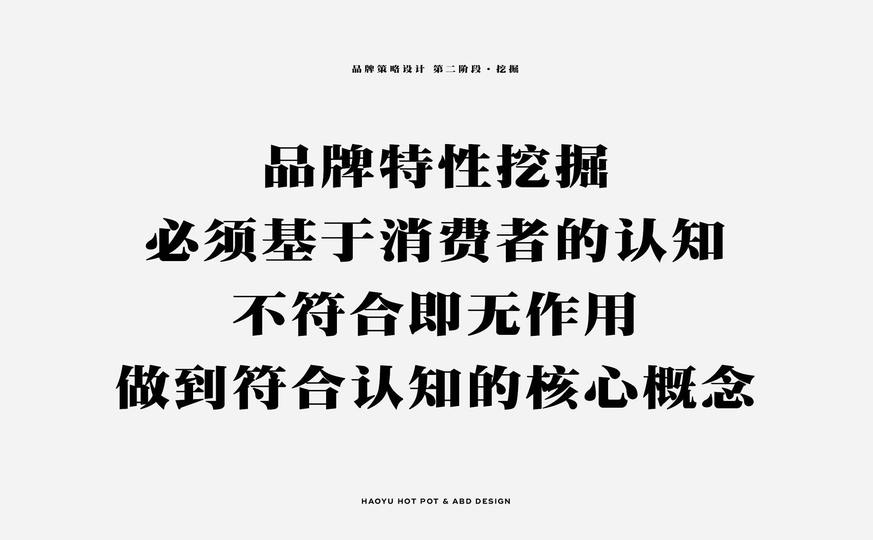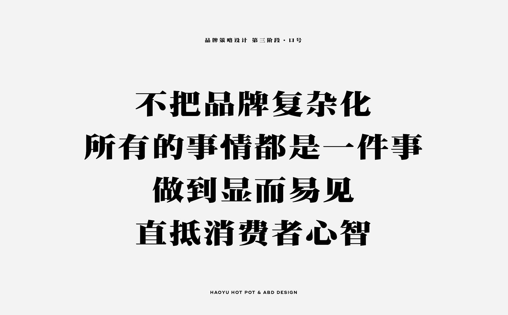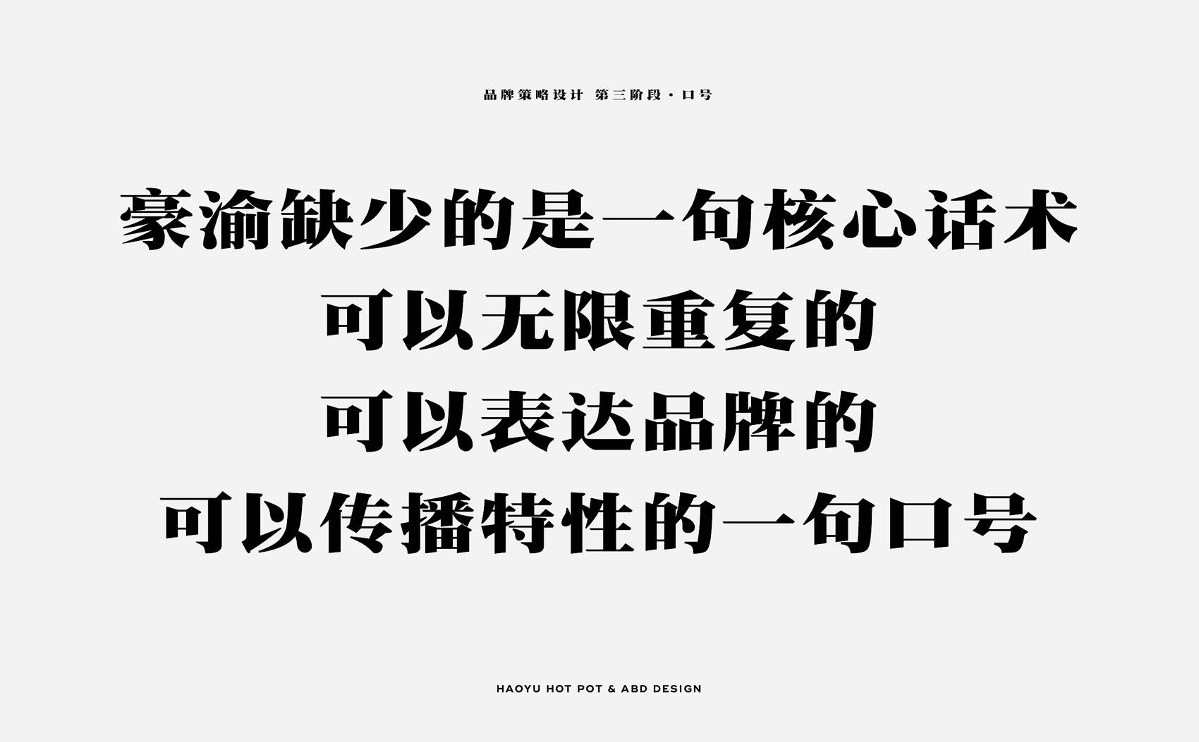 本次项目不同于传统的升级项目,我们深度结合了策略思维模型进行设计。豪渝火锅品牌升级全案,坚持基于策略思维,进行了深度的市场调研分析,其中包括了内部、外部、传播三大块的梳理与分析,结合豪渝现有的资源配称,从而得到品牌的核心点,全力聚焦毛肚火锅,持续打造品类品牌。