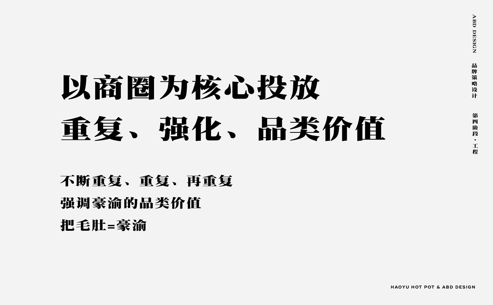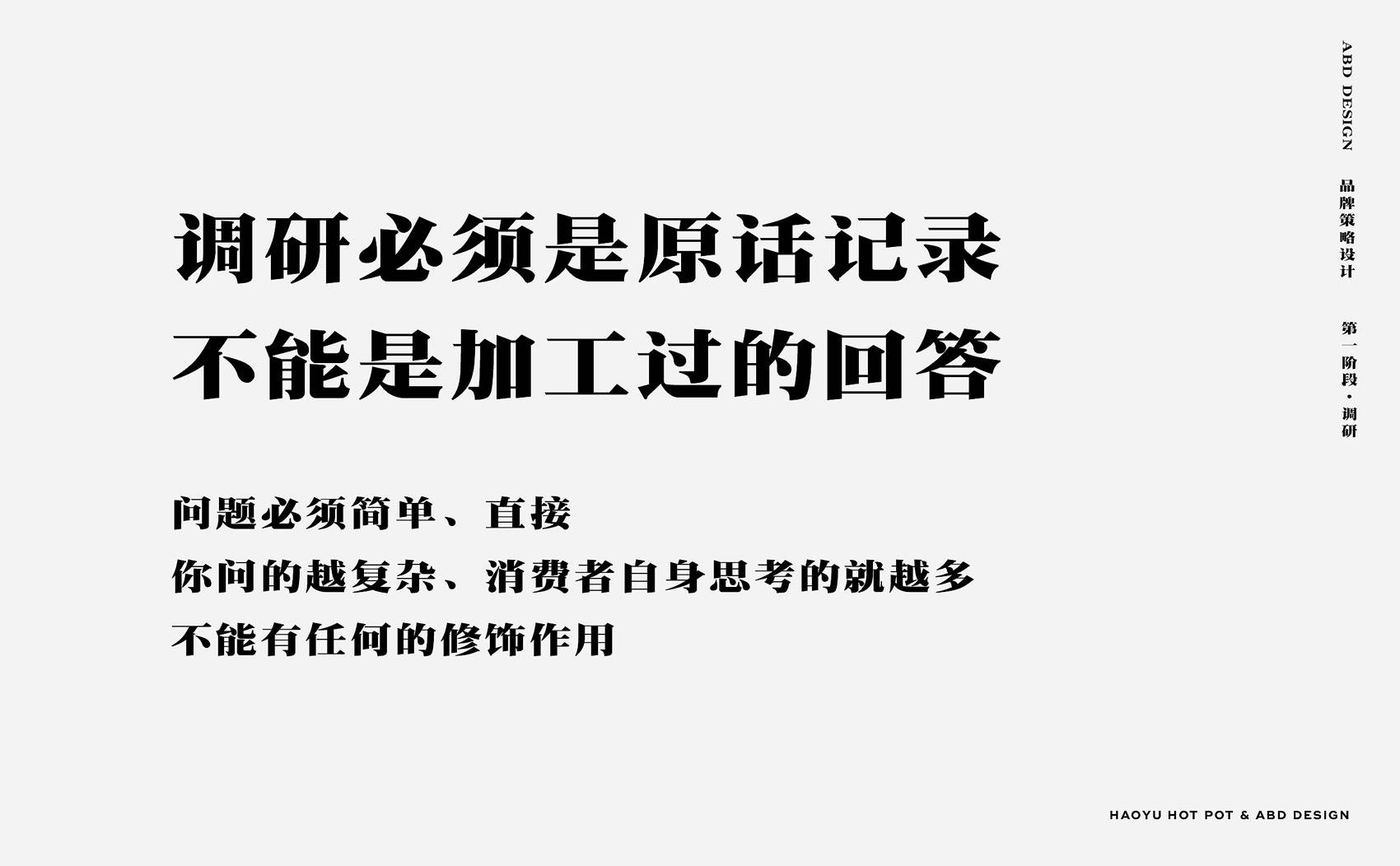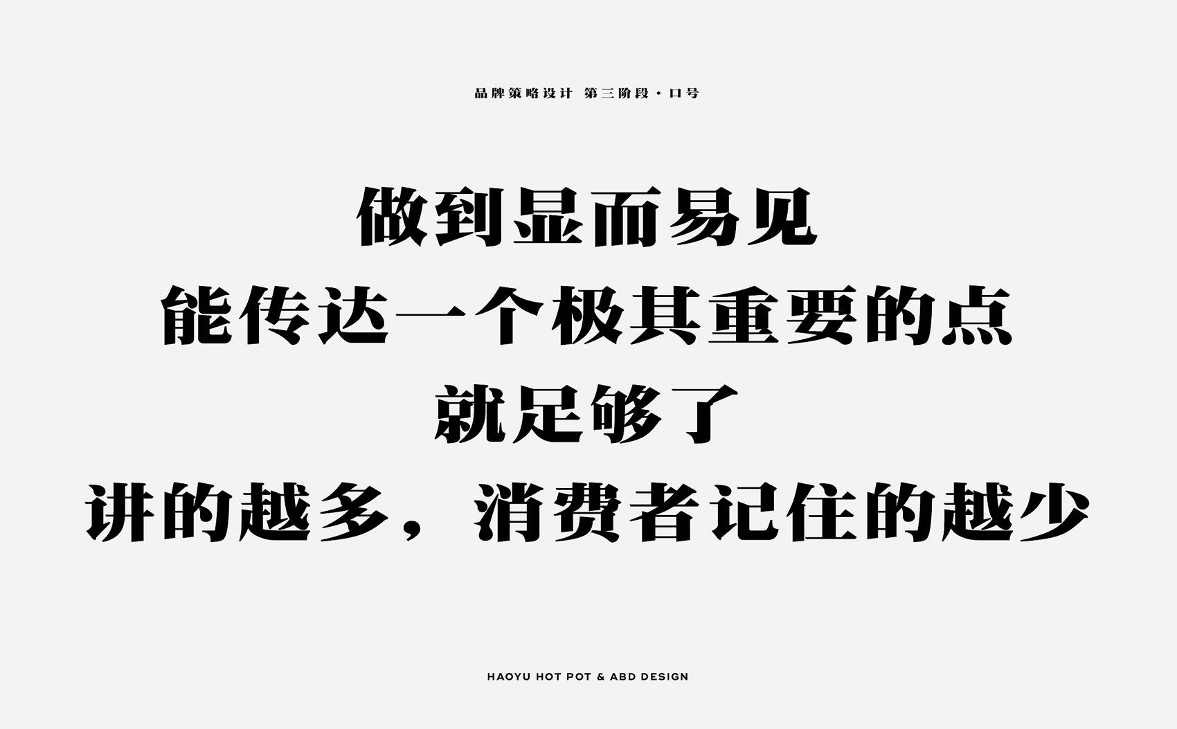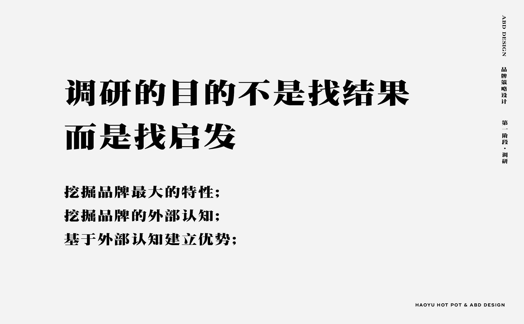本次项目不同于传统的升级项目,我们深度结合了策略思维模型进行设计。豪渝火锅品牌升级全案,坚持基于策略思维,进行了深度的市场调研分析,其中包括了内部、外部、传播三大块的梳理与分析,结合豪渝现有的资源配称,从而得到品牌的核心点,全力聚焦毛肚火锅,持续打造品类品牌。