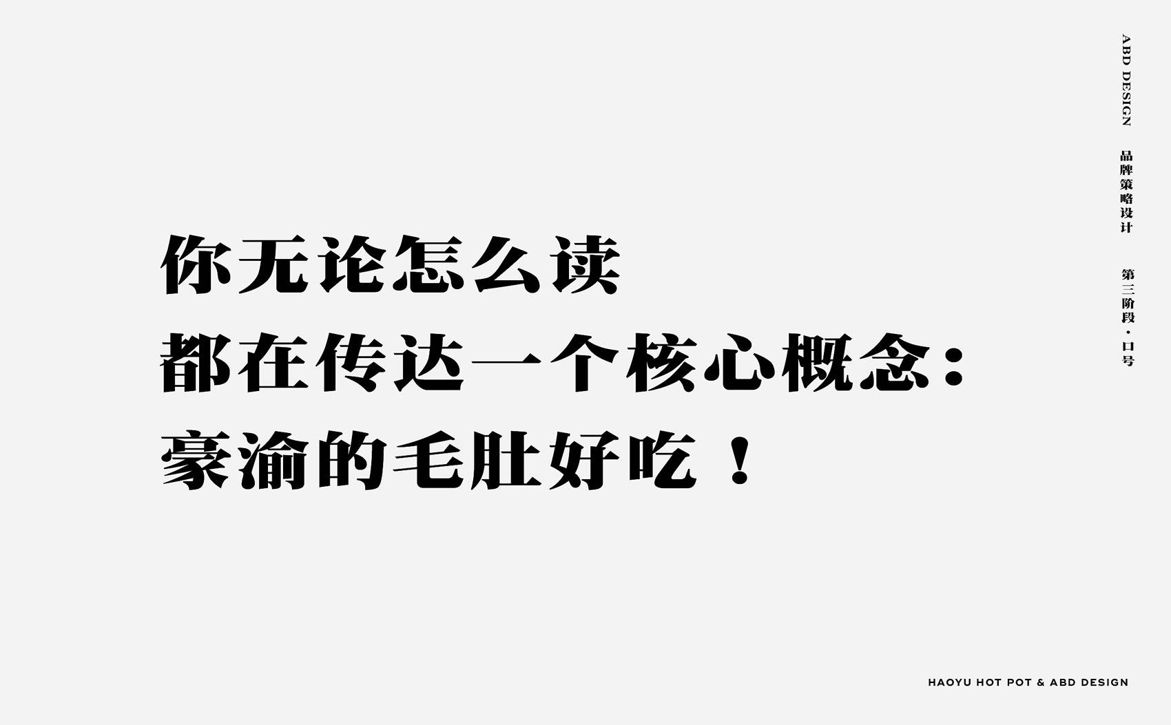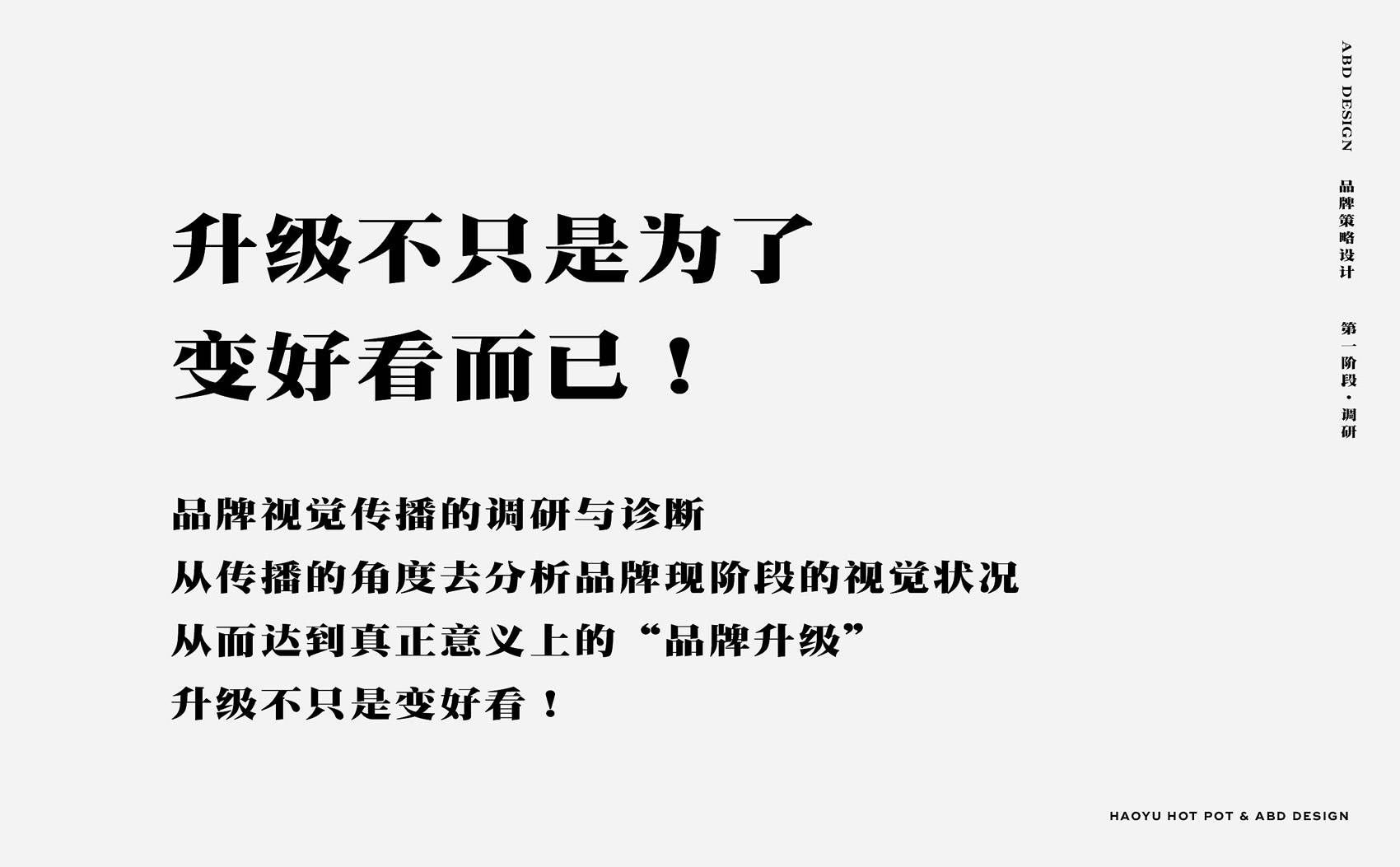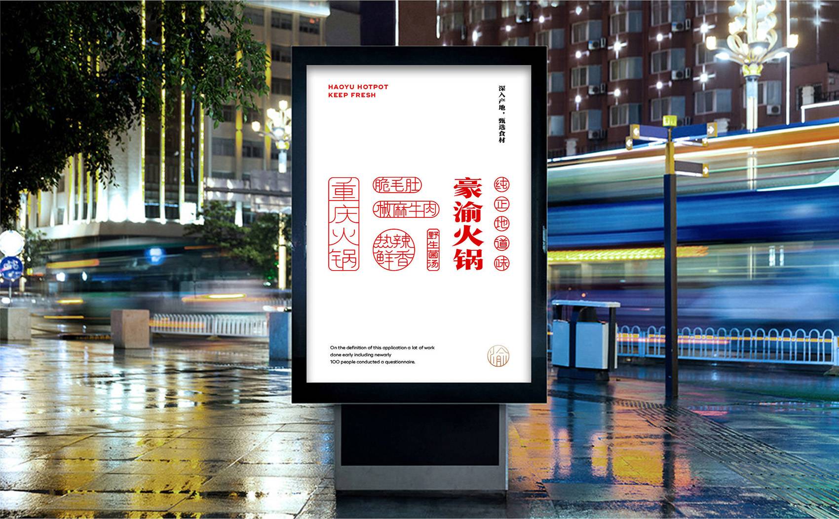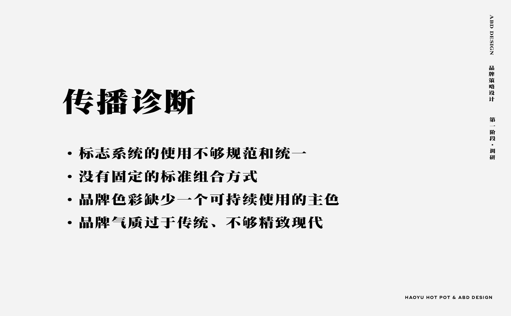 本次项目不同于传统的升级项目,我们深度结合了策略思维模型进行设计。豪渝火锅品牌升级全案,坚持基于策略思维,进行了深度的市场调研分析,其中包括了内部、外部、传播三大块的梳理与分析,结合豪渝现有的资源配称,从而得到品牌的核心点,全力聚焦毛肚火锅,持续打造品类品牌。