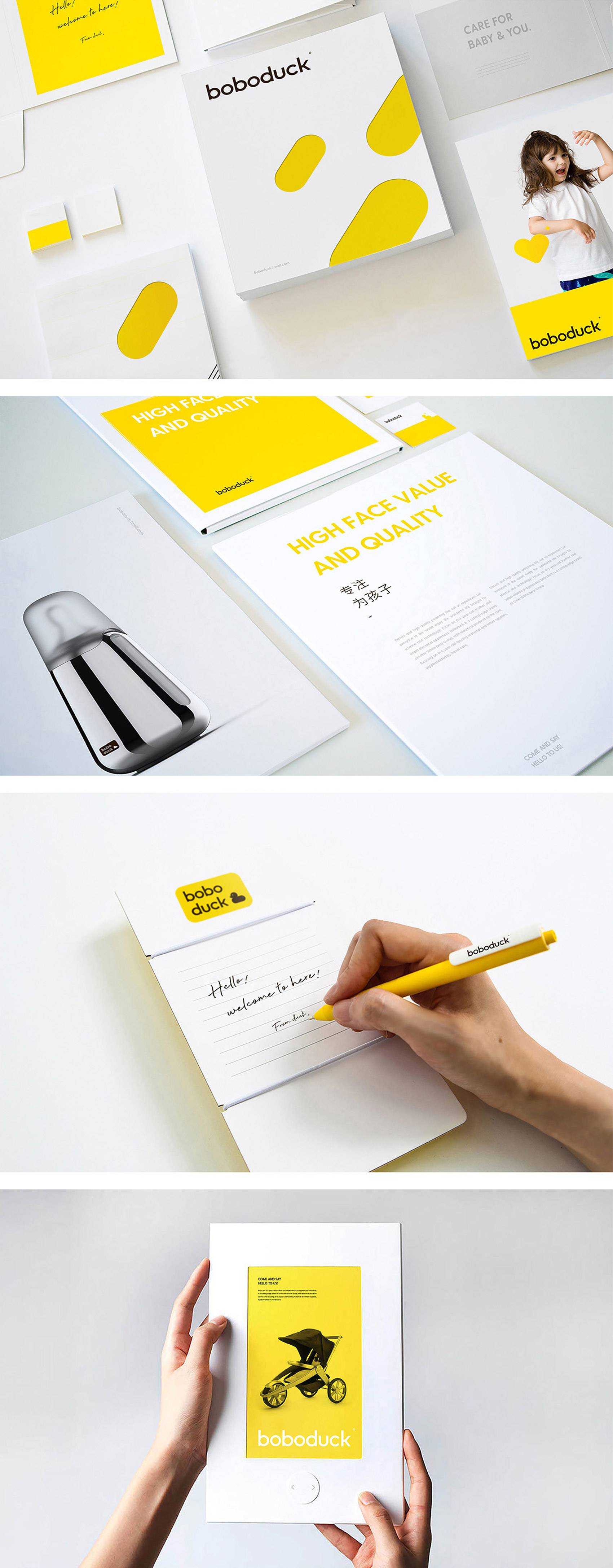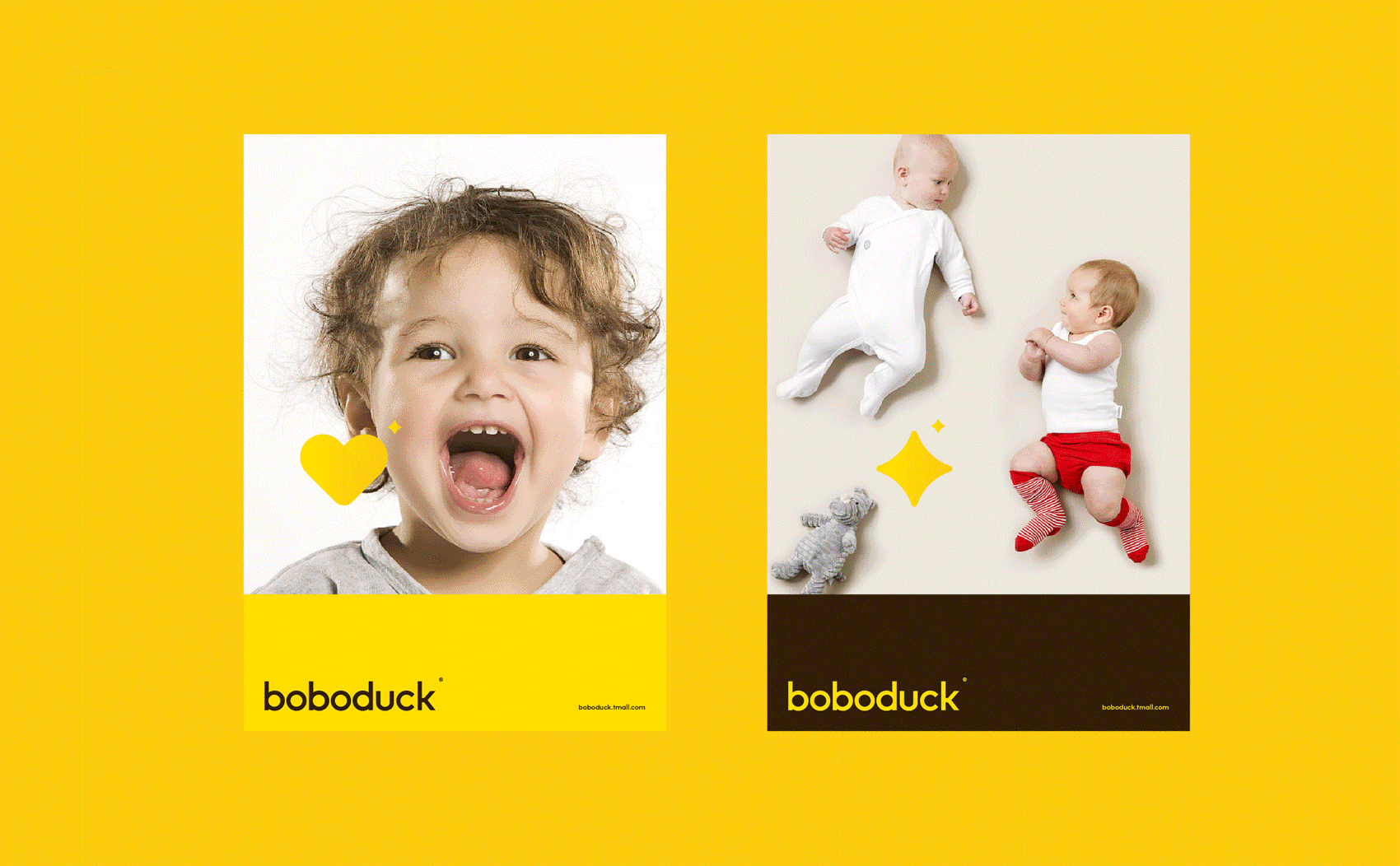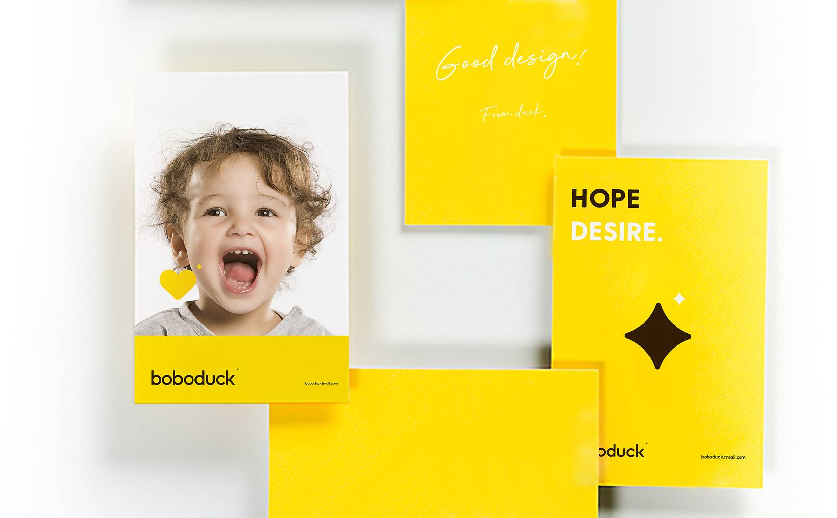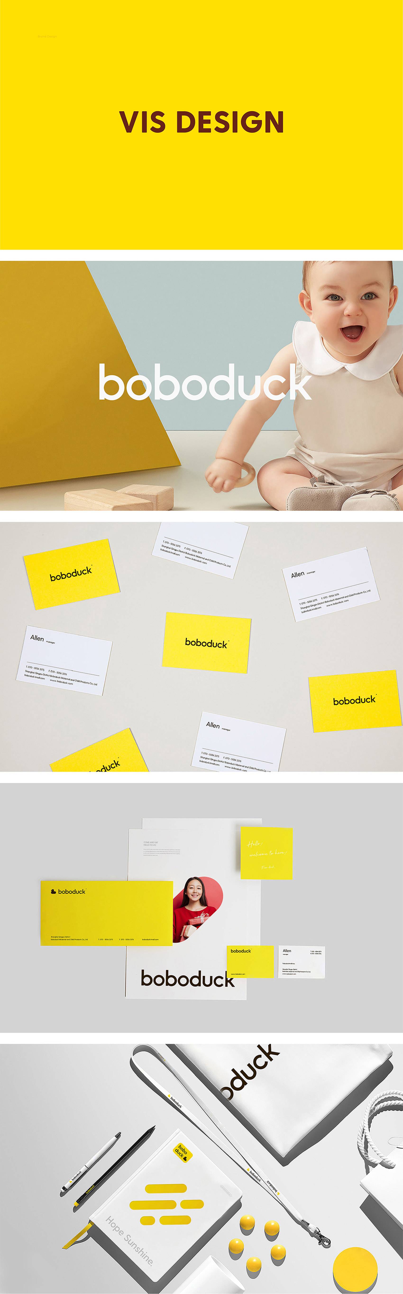 以柠檬黄作为品牌的主色调,搭配深棕色,清新而又阳光的配色。凸显boboduck的品牌调性,传递有趣、轻松的品牌理念。字体为主的品牌标识更有品质感与现代感。