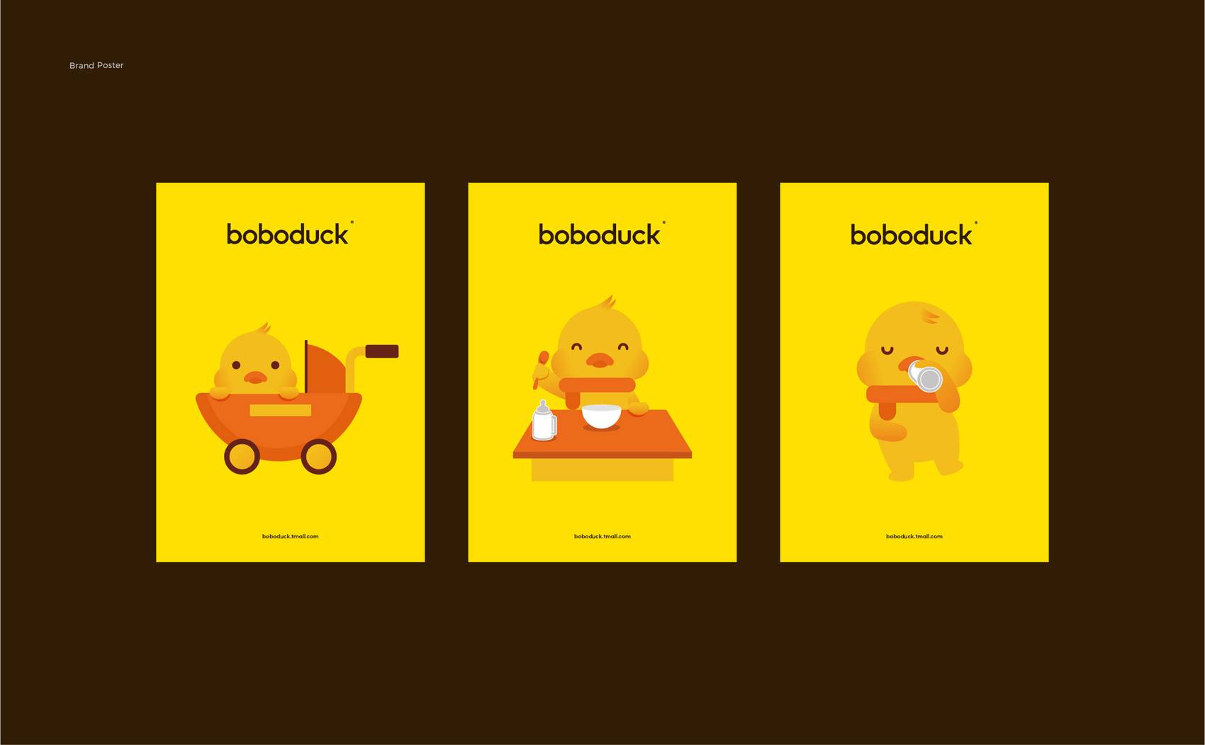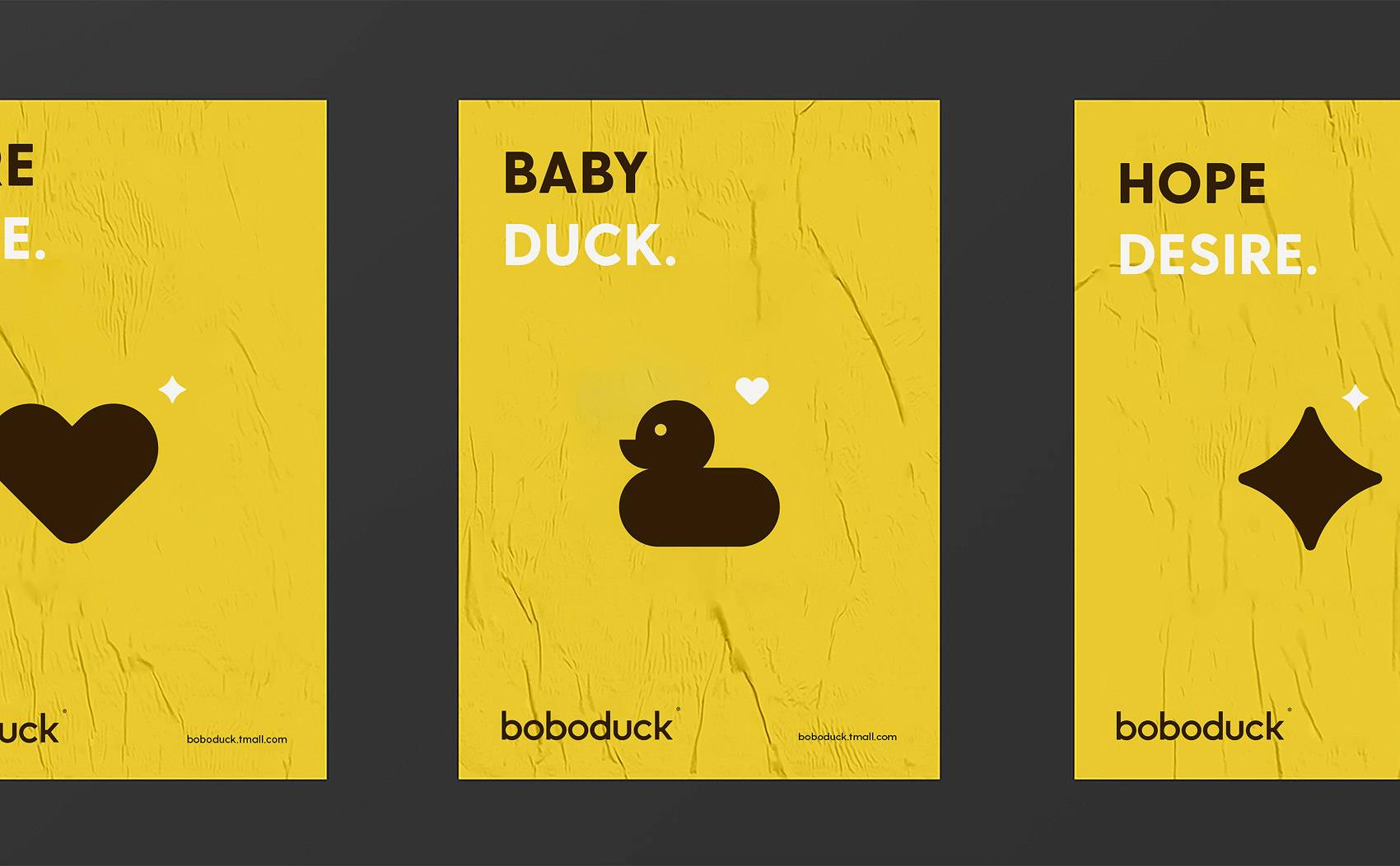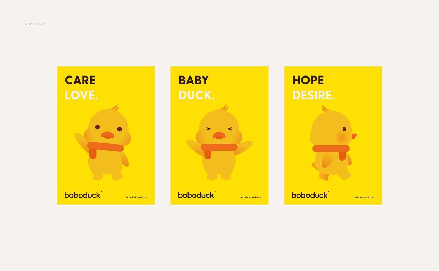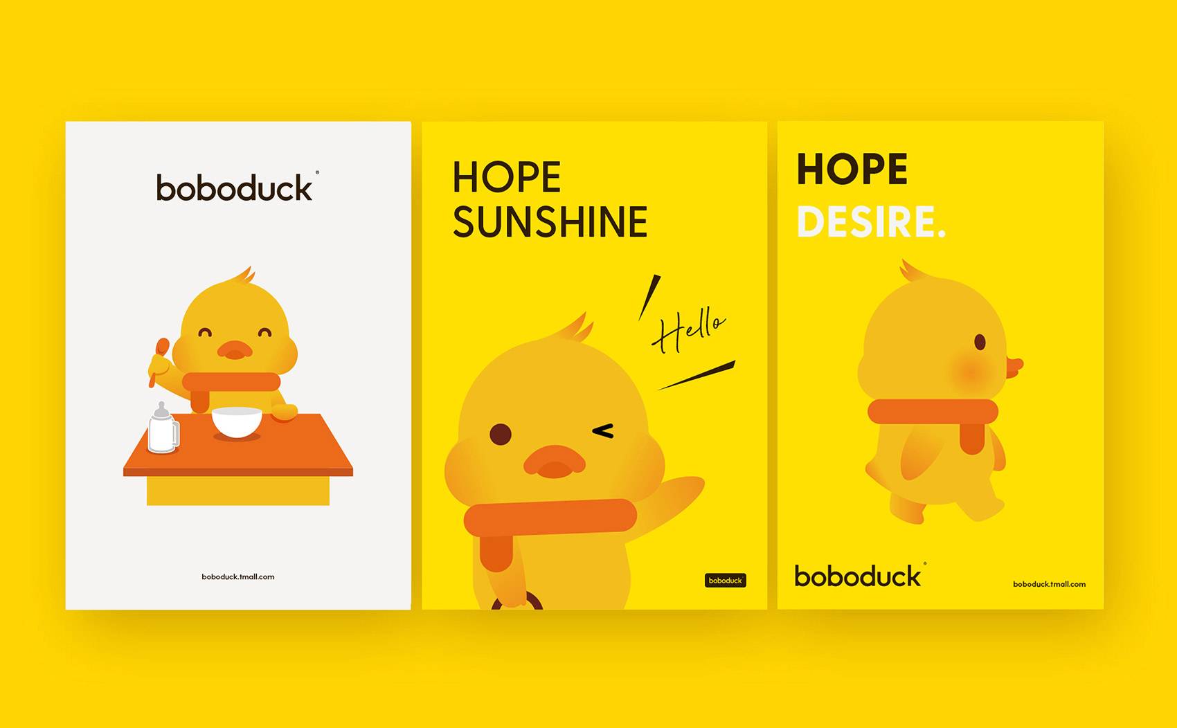 为了让品牌与消费者进行互动、引起情感共鸣,我们为boboduck塑造了品牌IP的形象设计。角色原型用什么合适?品牌可视化!品牌名就是品牌IP,基于DUCK这一元素而进行创作,BOBO给人的感觉是一个呆呆、有趣、轻松、好玩的视觉印象,所以才有了胖胖的身子、大大的头、无辜的眼神,红色的围巾是为了进一步体现品牌的理念,关心与呵护。