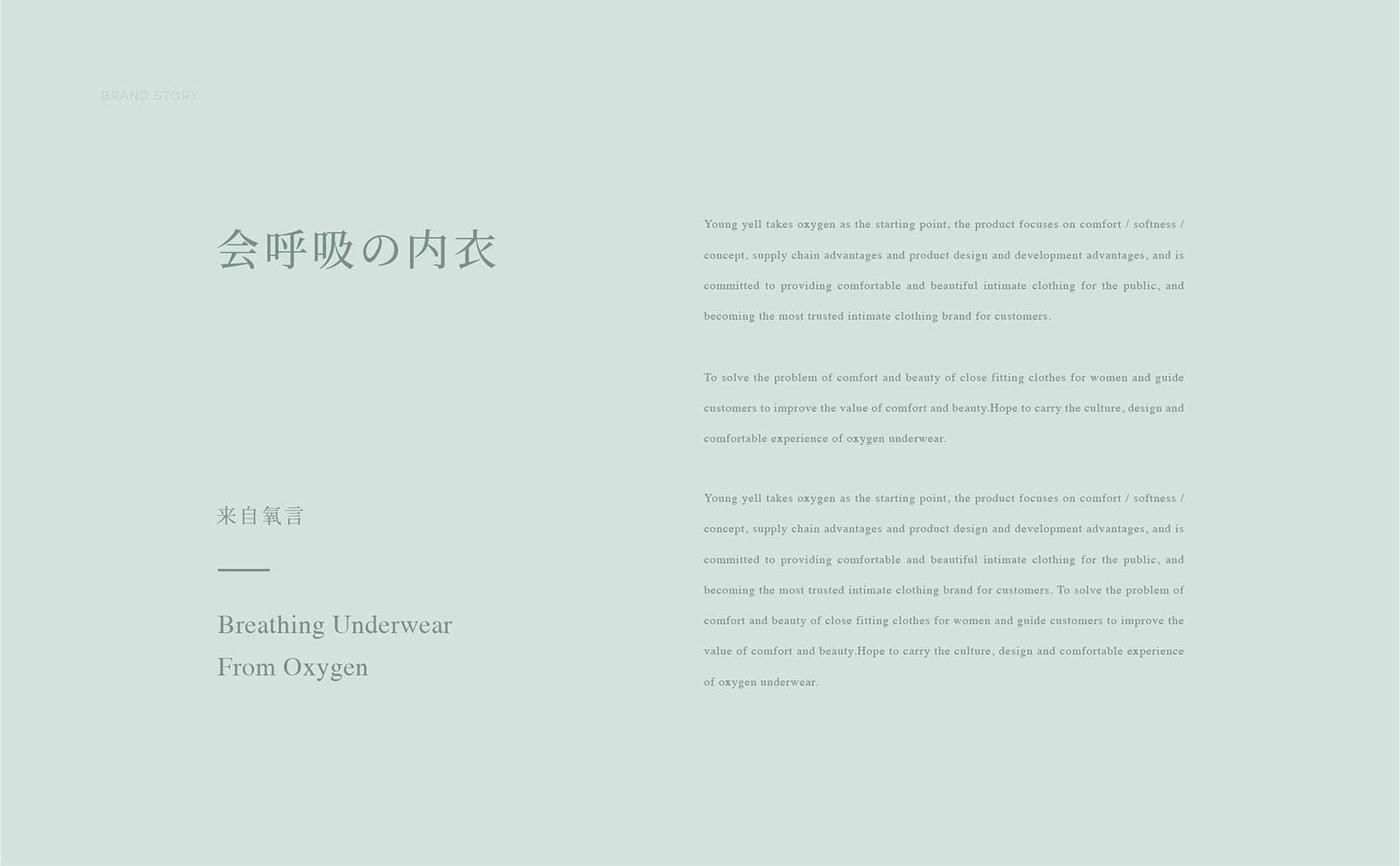 氧气生活,因会呼吸的内衣而生。氧言用柔美、舒适的设计突显身体线条,在贴身中低调地展现内在美感,同时传递让年轻男性女性享受自由、无束缚的生活方式。