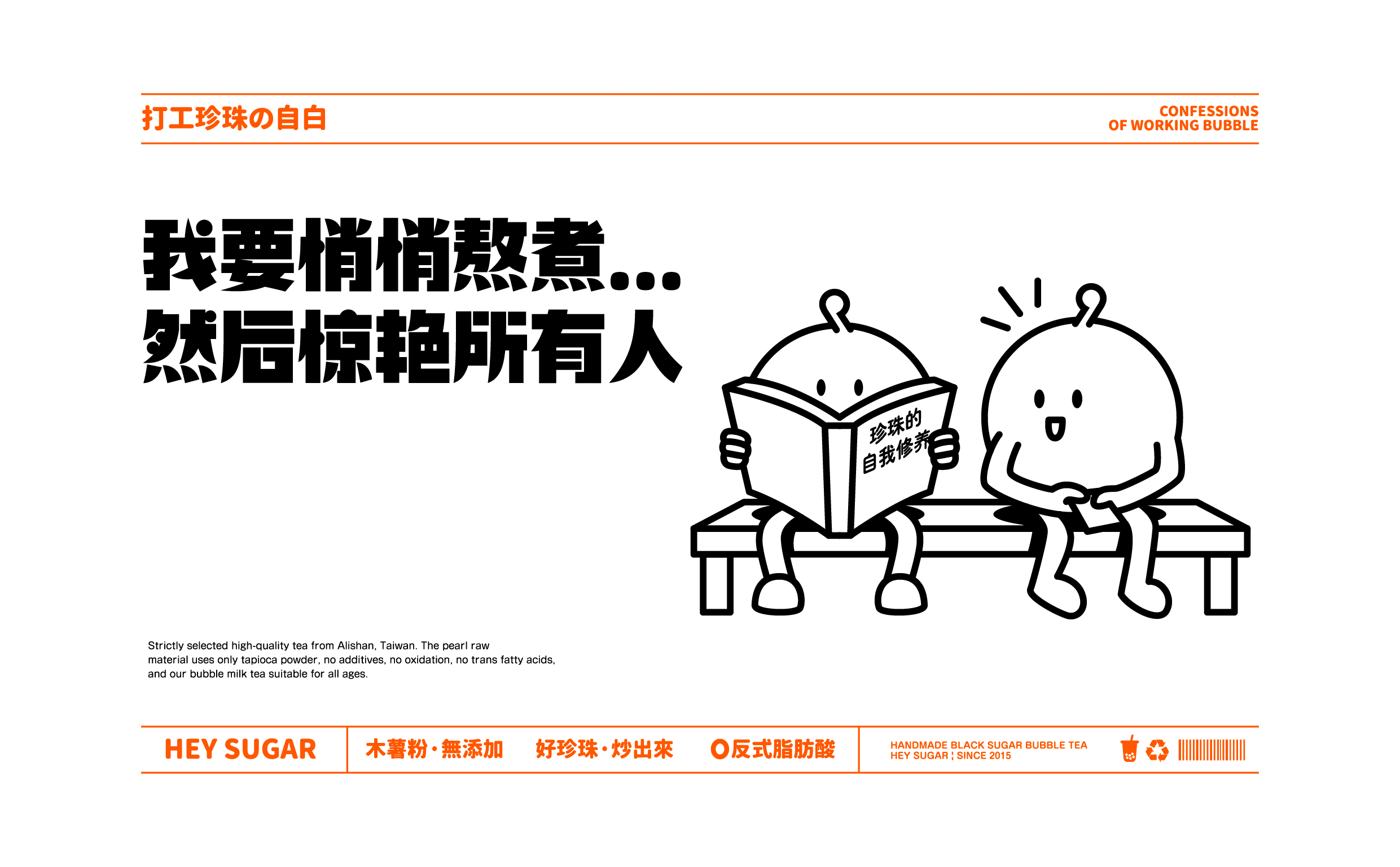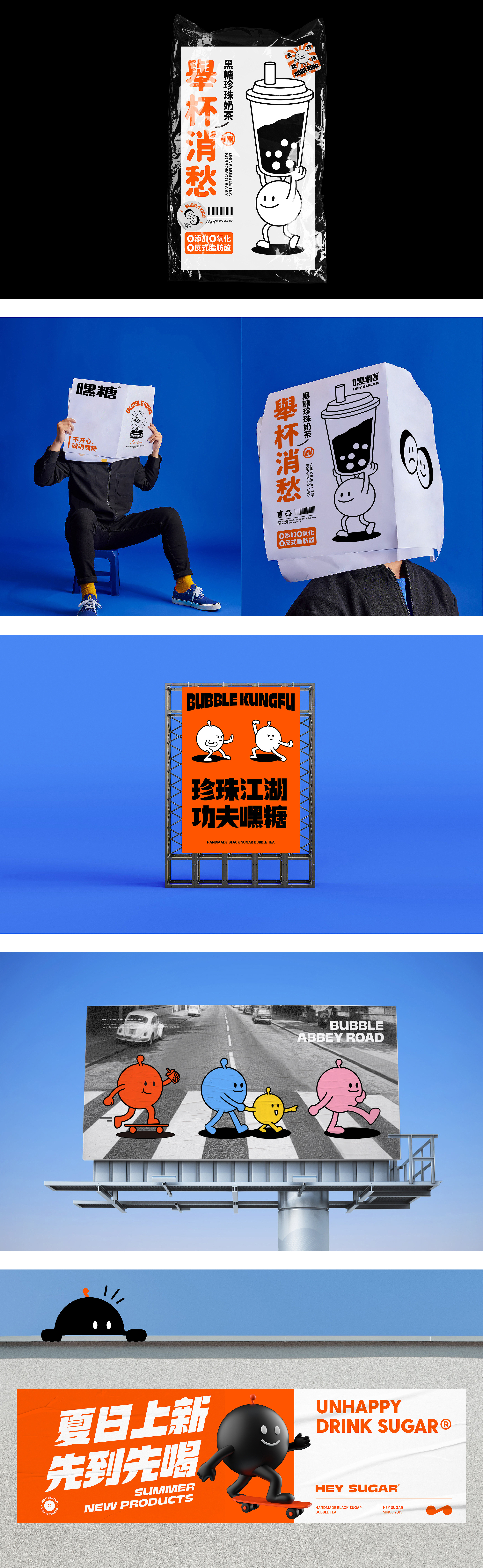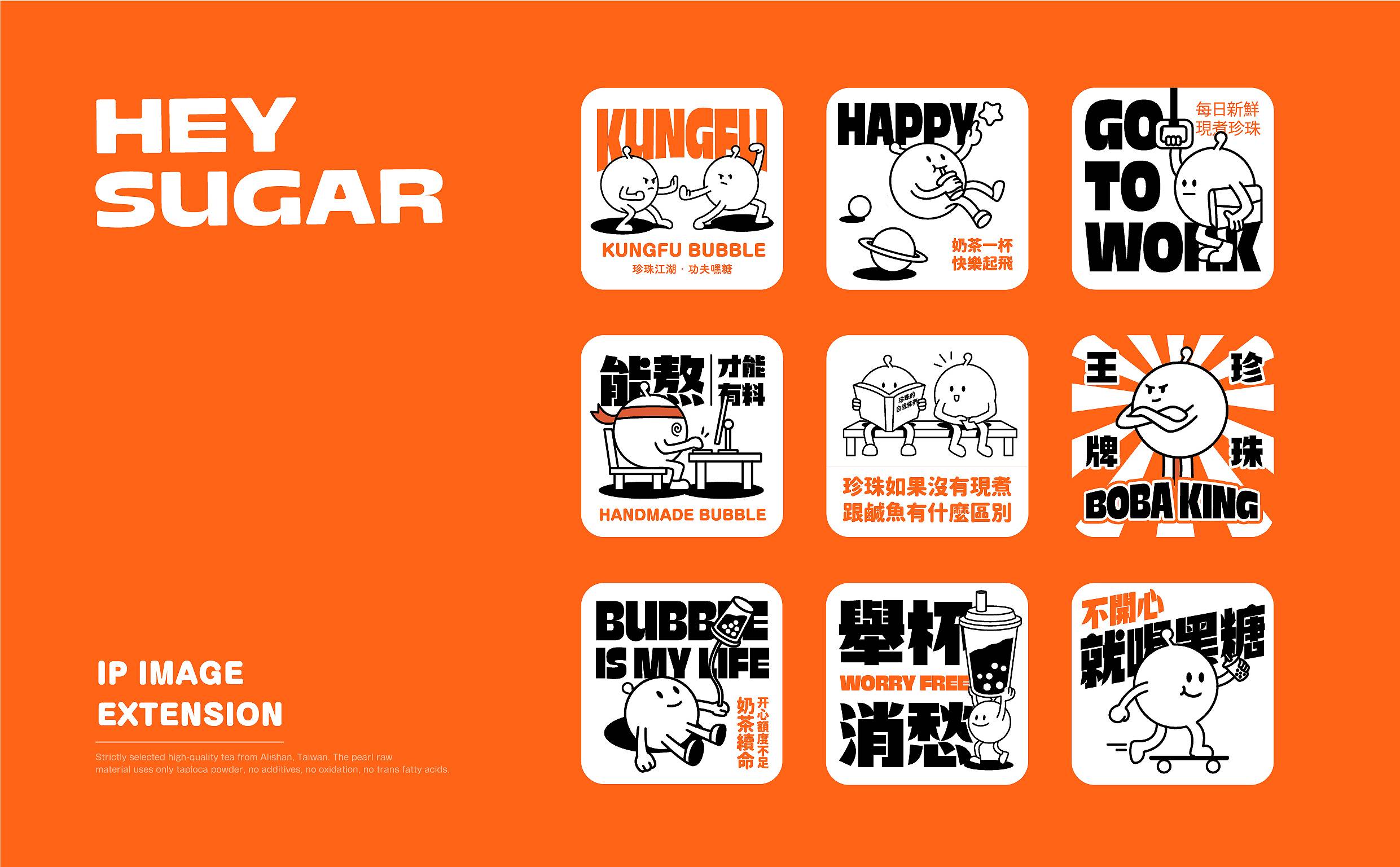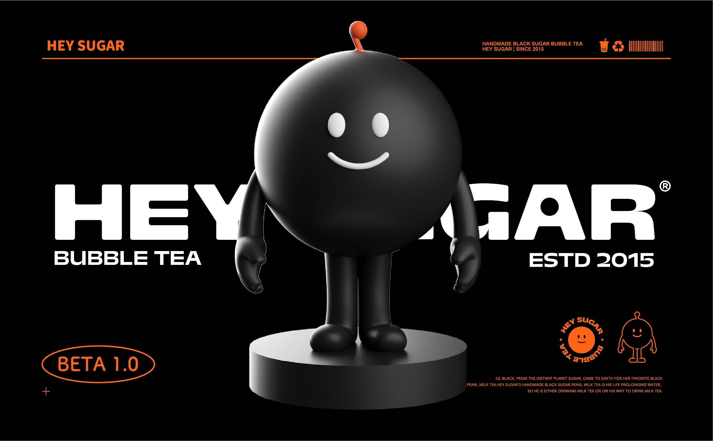 品牌符号的设计必须具备涵盖品牌核心价值,我们塑造了嘿糖的超级IP:小嘿!原型:黑糖珍珠、把珍珠拟人化;特点:嫁接表情文化、笑脸;不开心喝嘿糖!喝嘿糖就开心!