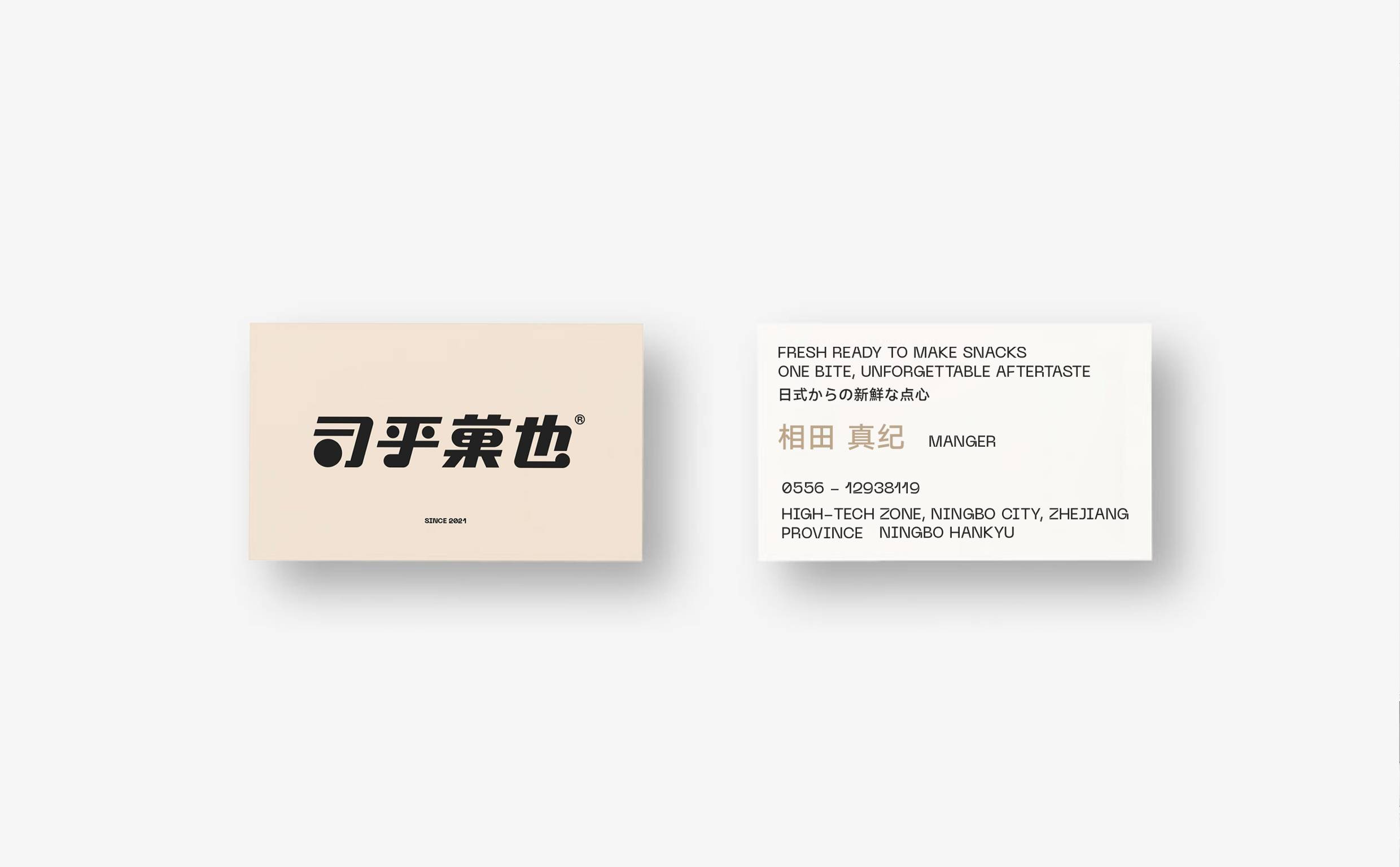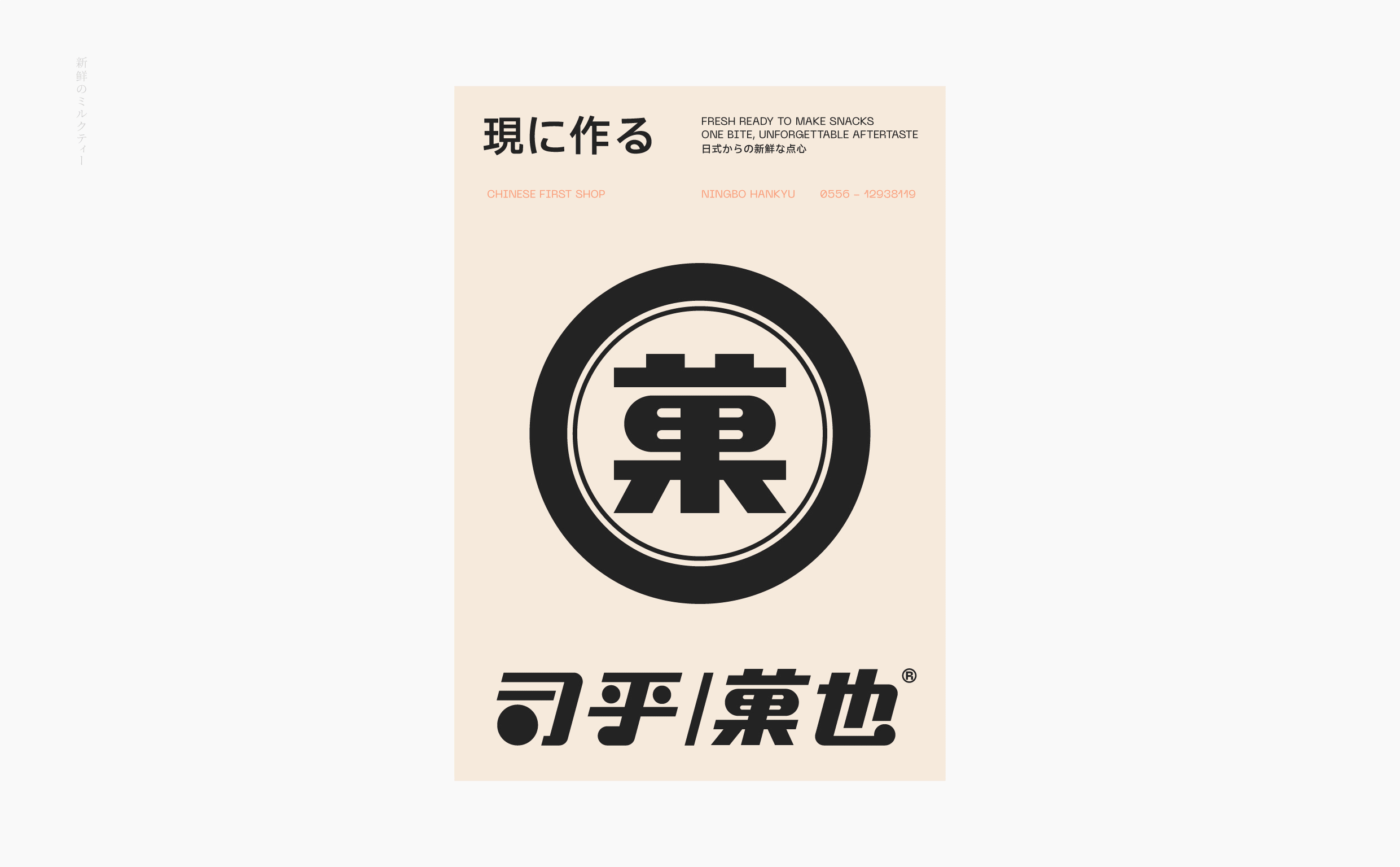 我们根据司乎·菓也的产品特性设计对应的标识,菓也主打的是日式点心,匠心选材、新鲜现做,每一款都带有手作的温度以及点心师的美好祝愿,而日式点心最大的特征是什么?大多是圆形的。因此,我们取“点”为“•”,既是产品的⼀种形态,也代表着用心的⼯匠精神,并将其融入字体中,使标识更具风格特征,从而展现司乎·菓也的品牌性格:圆润、亲和。