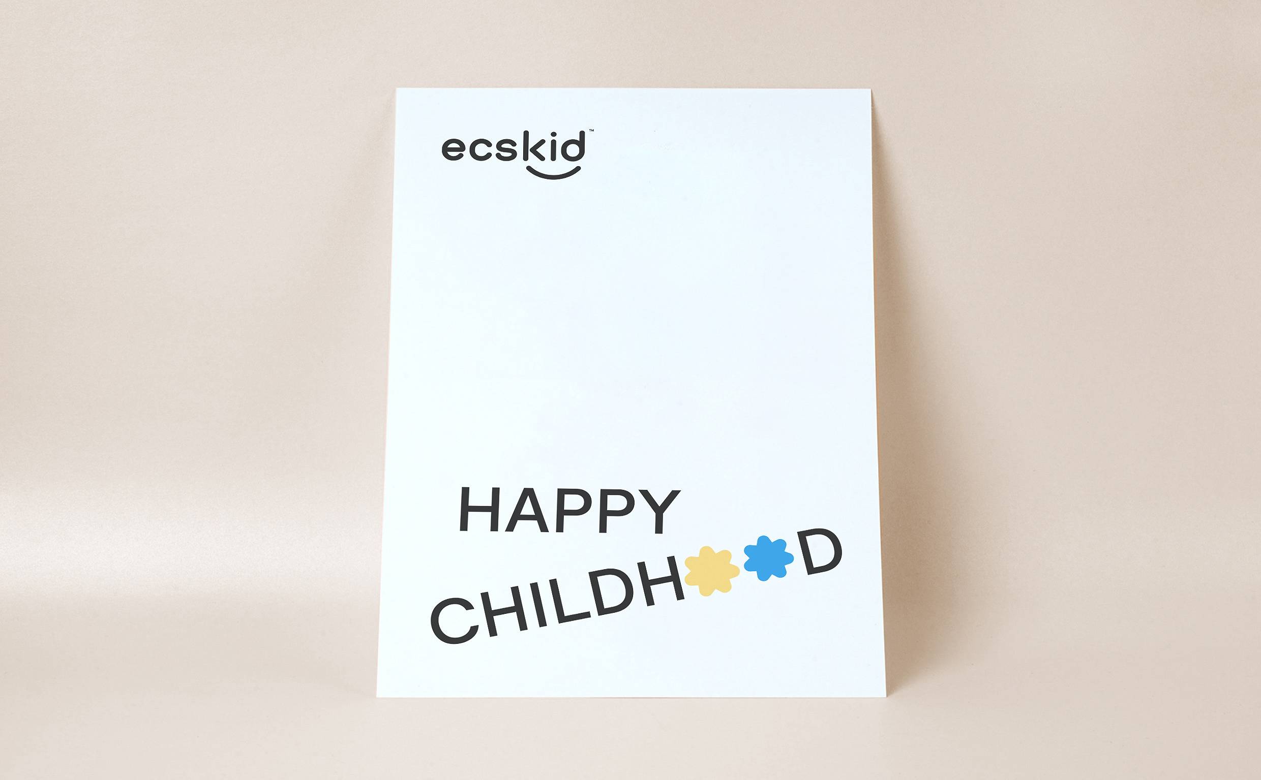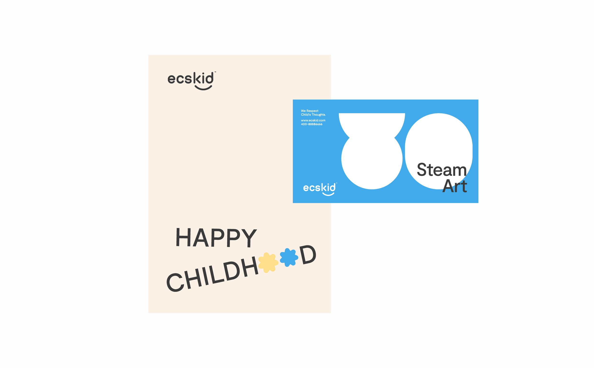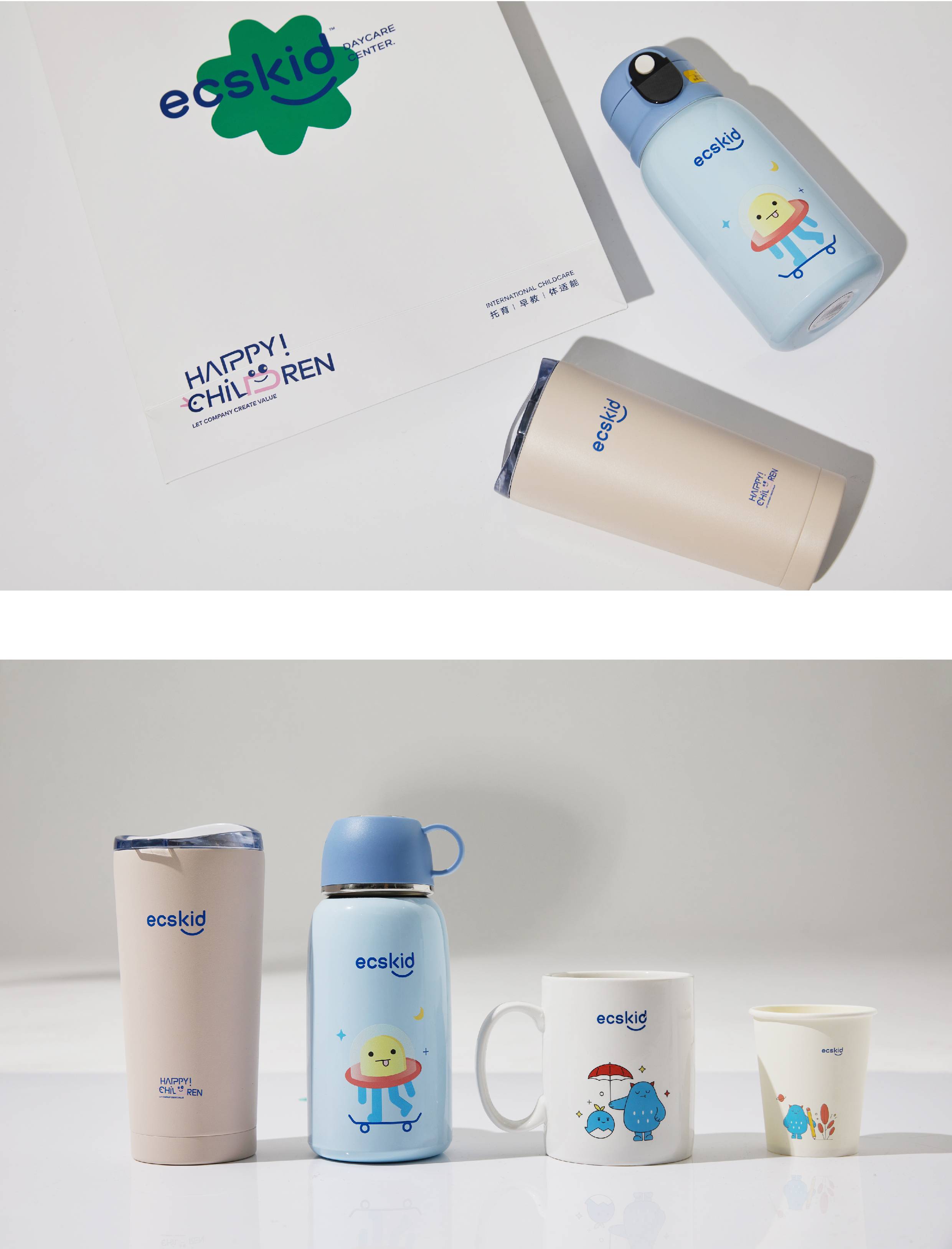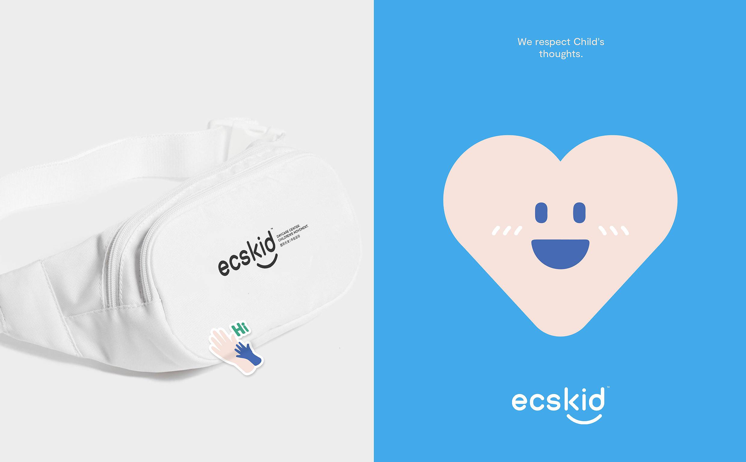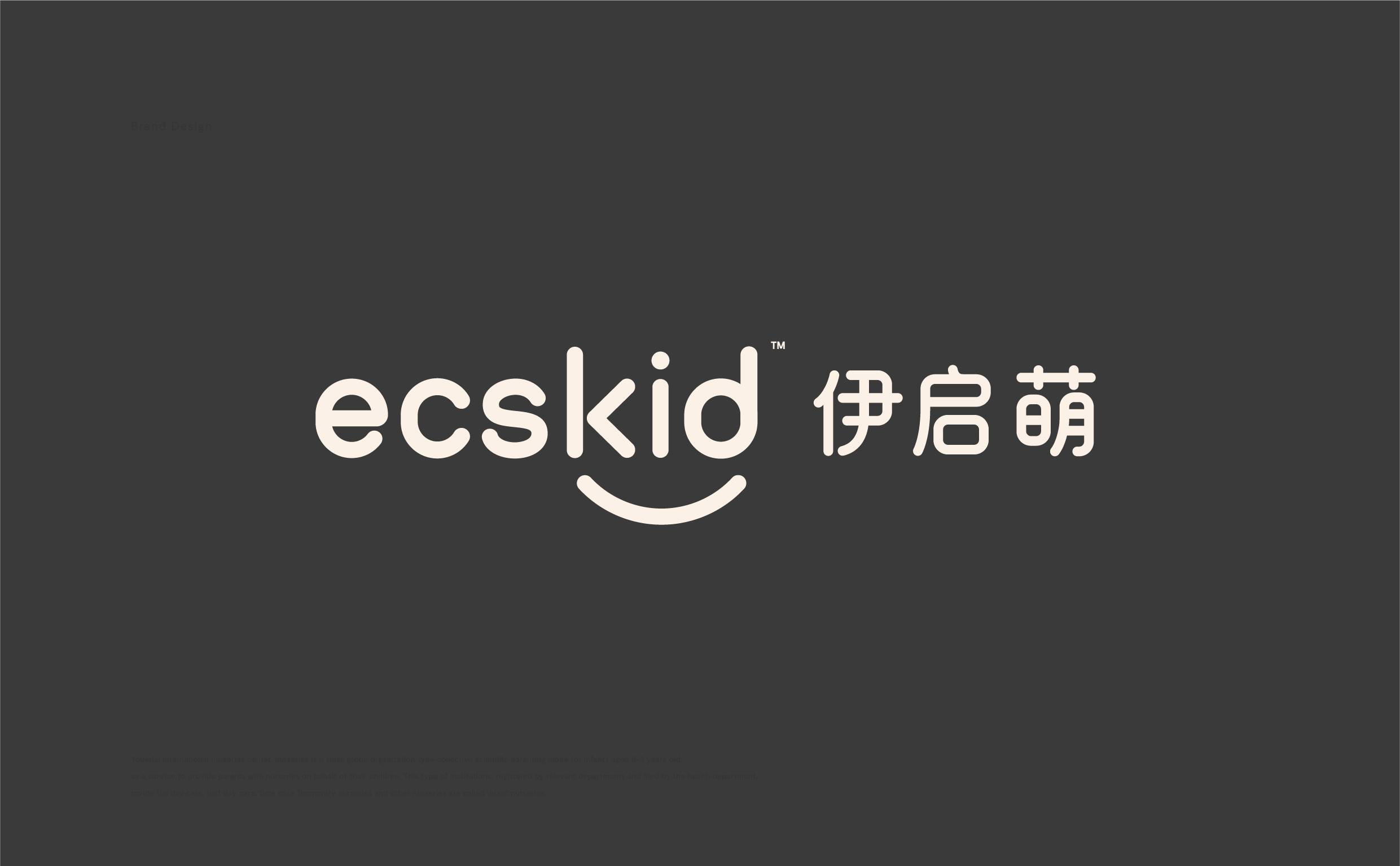 在标识设计上,为了表现品牌倡导的教育理念,呼应“ecskid”品牌名称,巧妙的通过点缀“微笑弧线”“用心呵护”组合成为⼀种差异化的视觉记忆点。