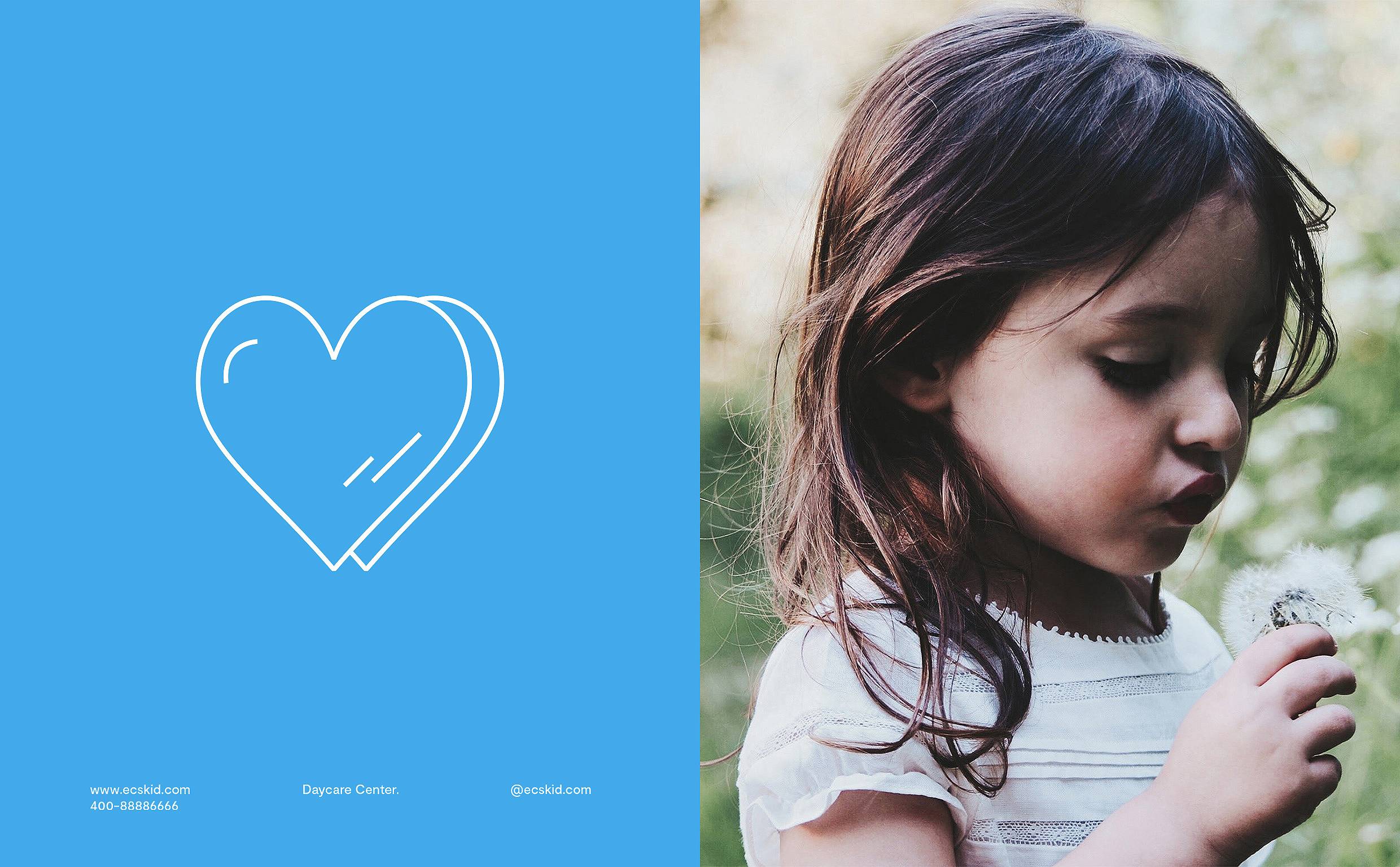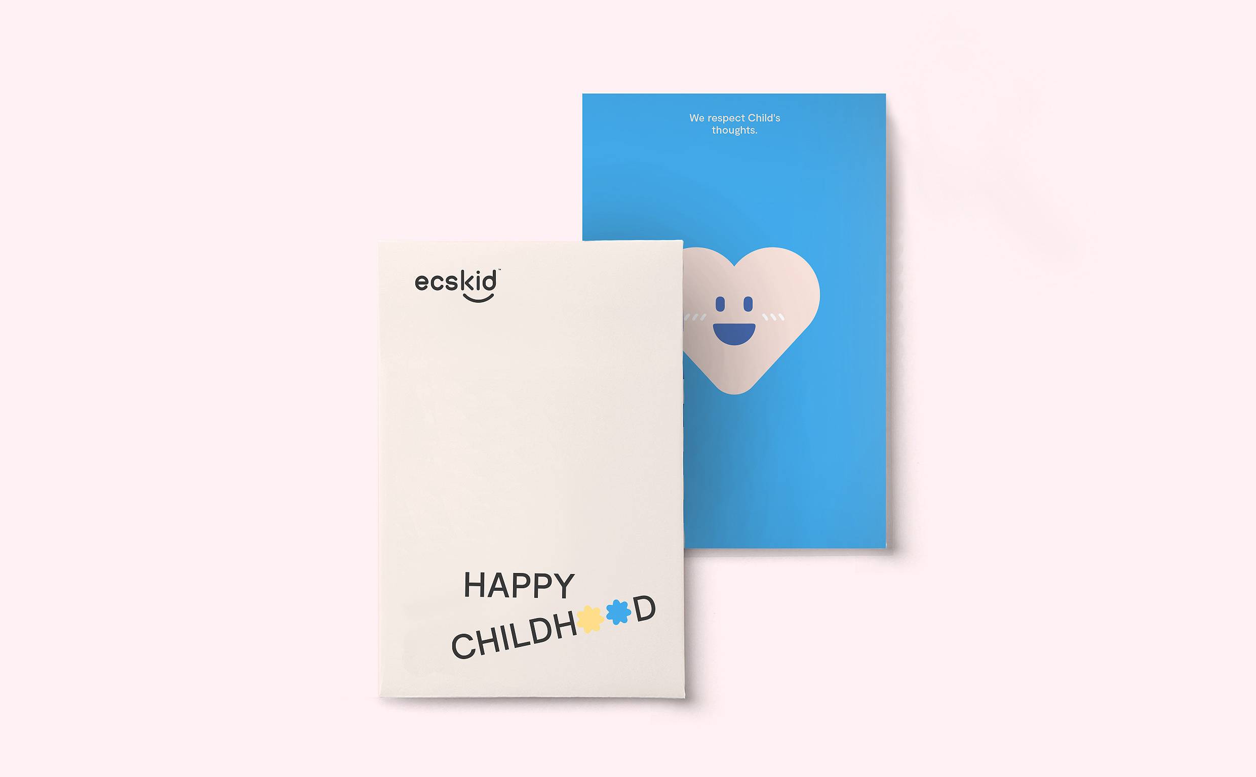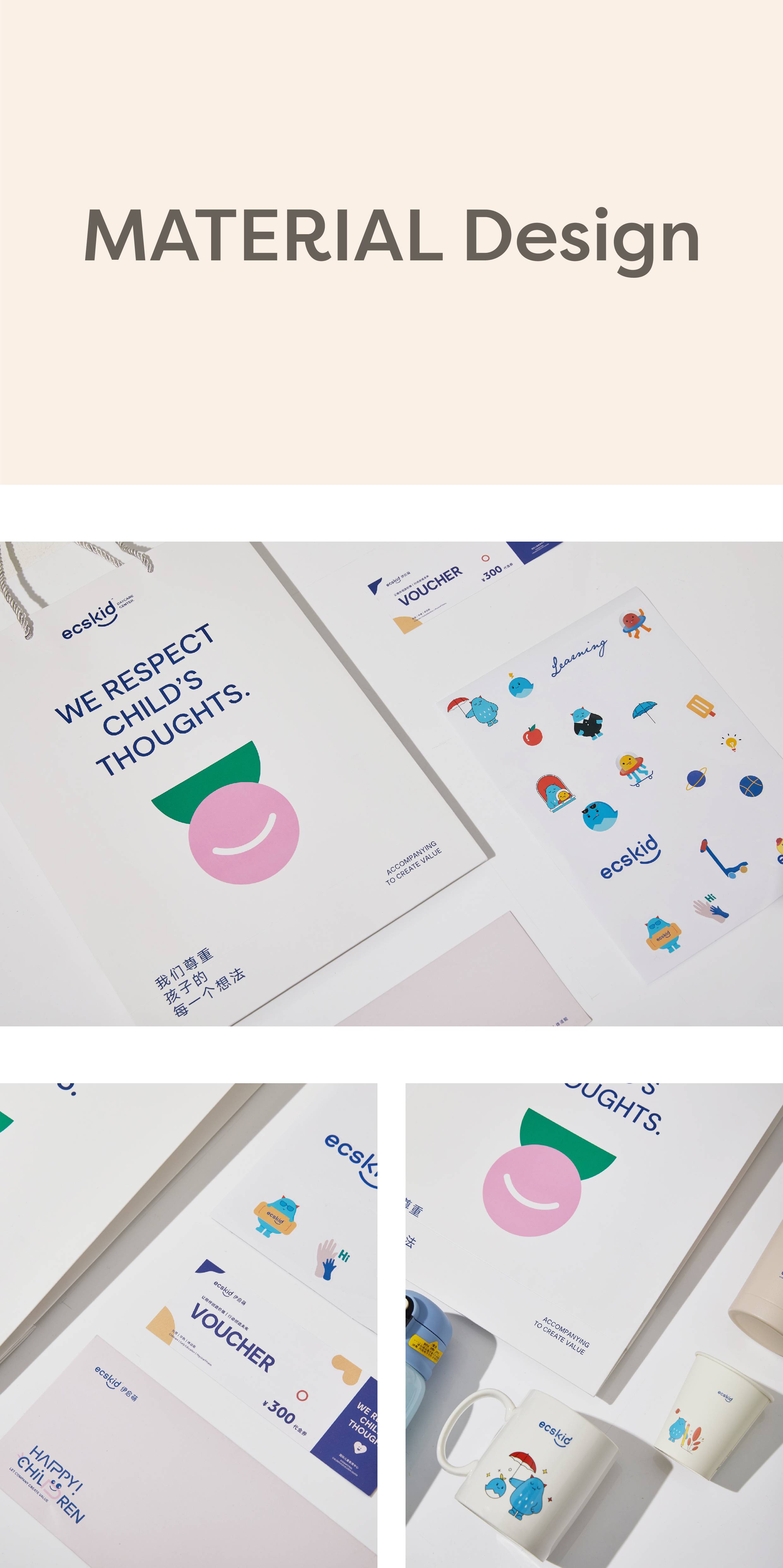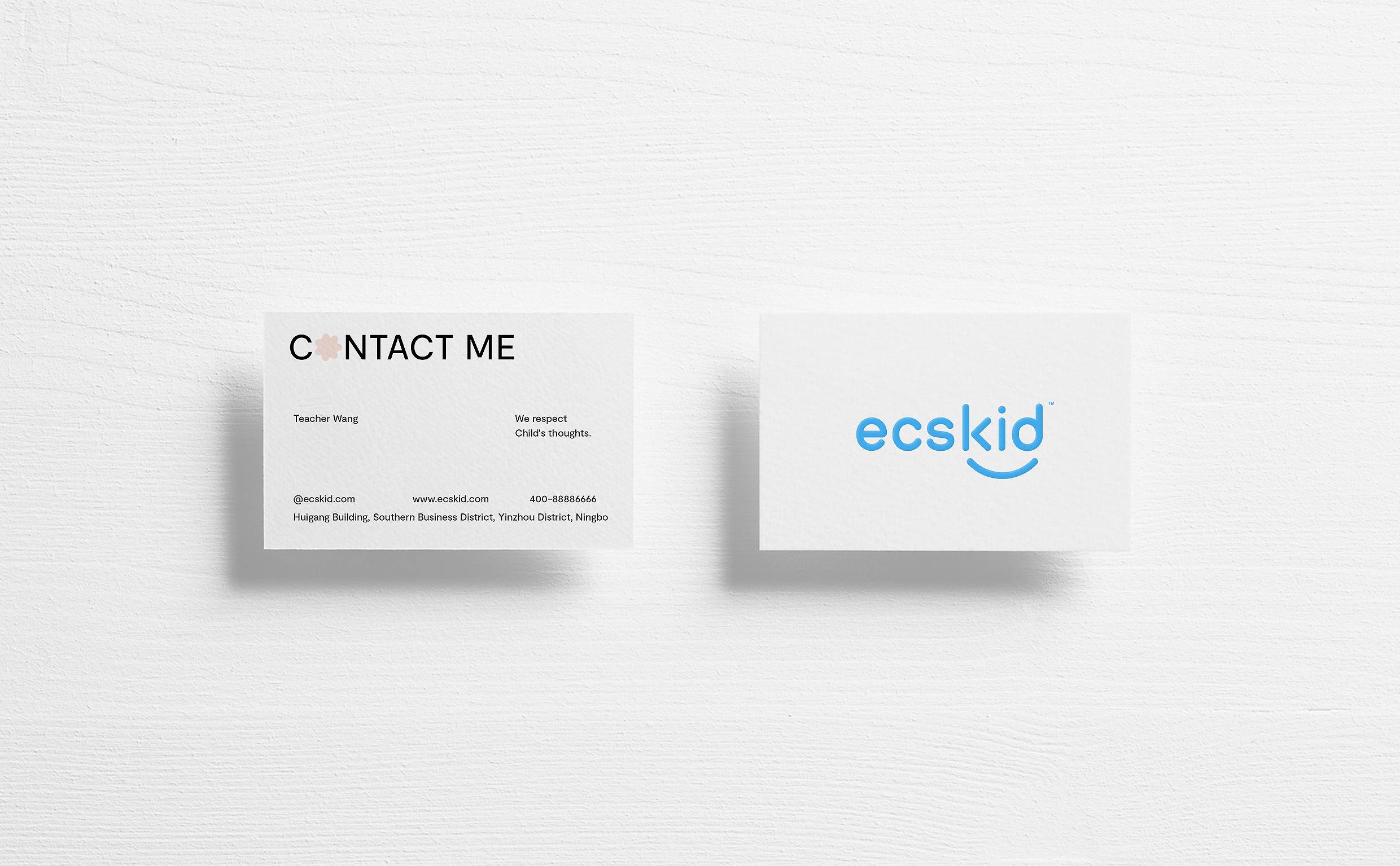 在标识设计上,为了表现品牌倡导的教育理念,呼应“ecskid”品牌名称,巧妙的通过点缀“微笑弧线”“用心呵护”组合成为⼀种差异化的视觉记忆点。