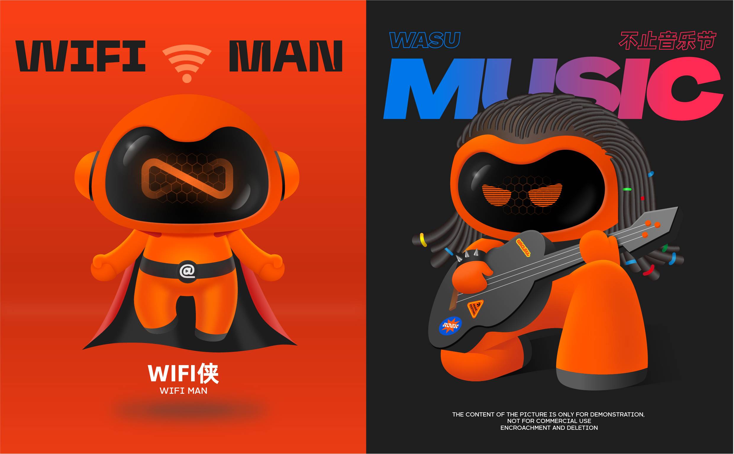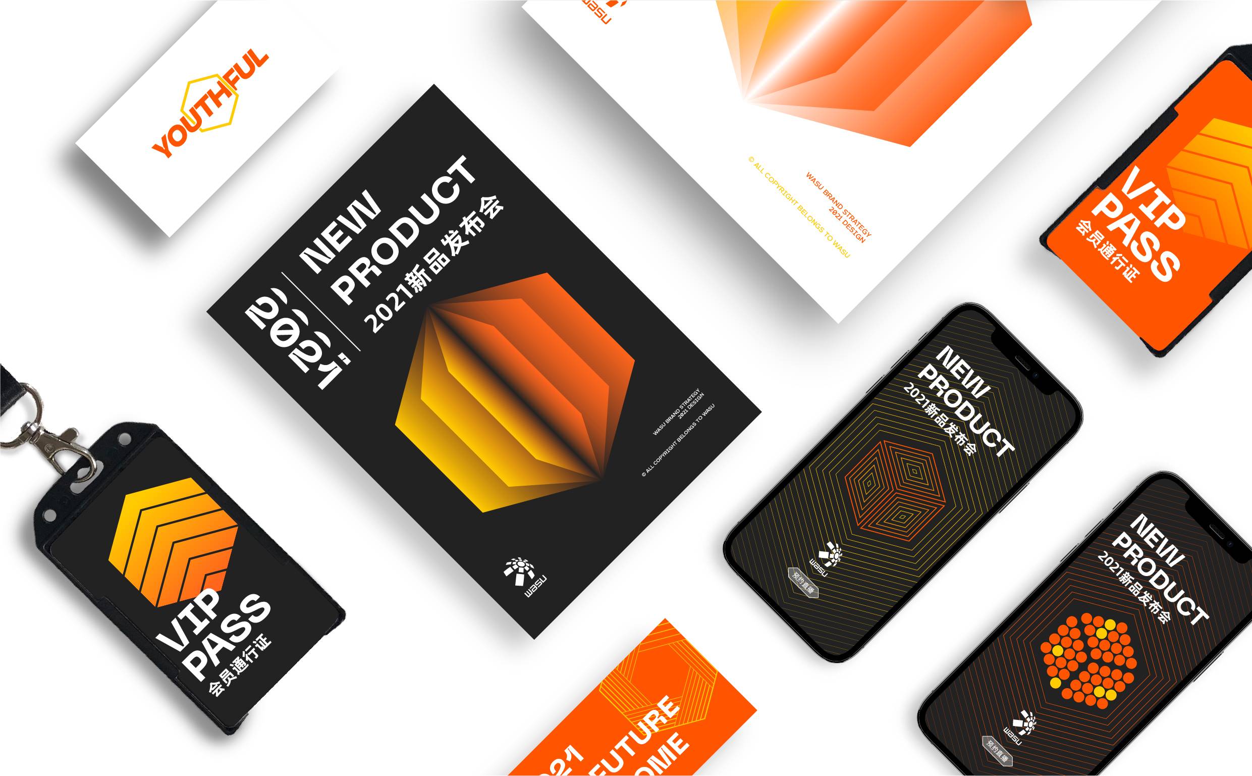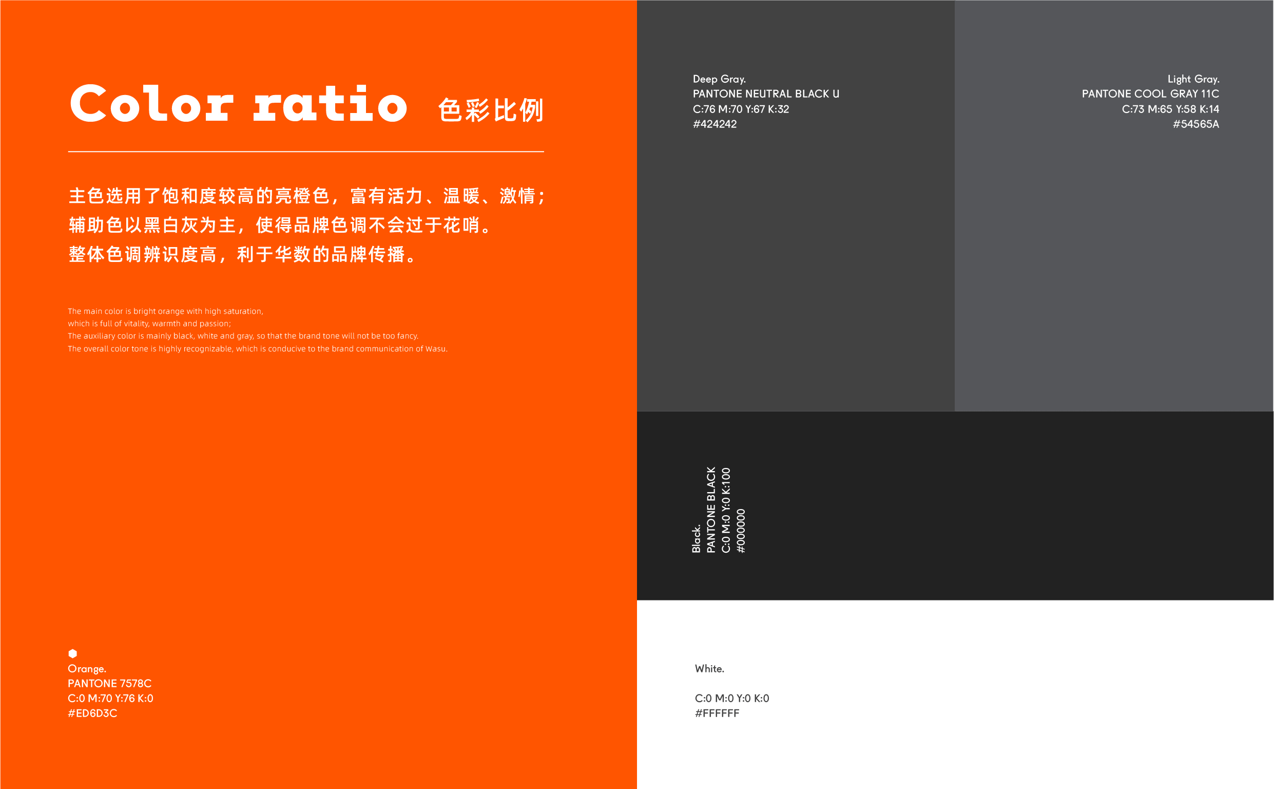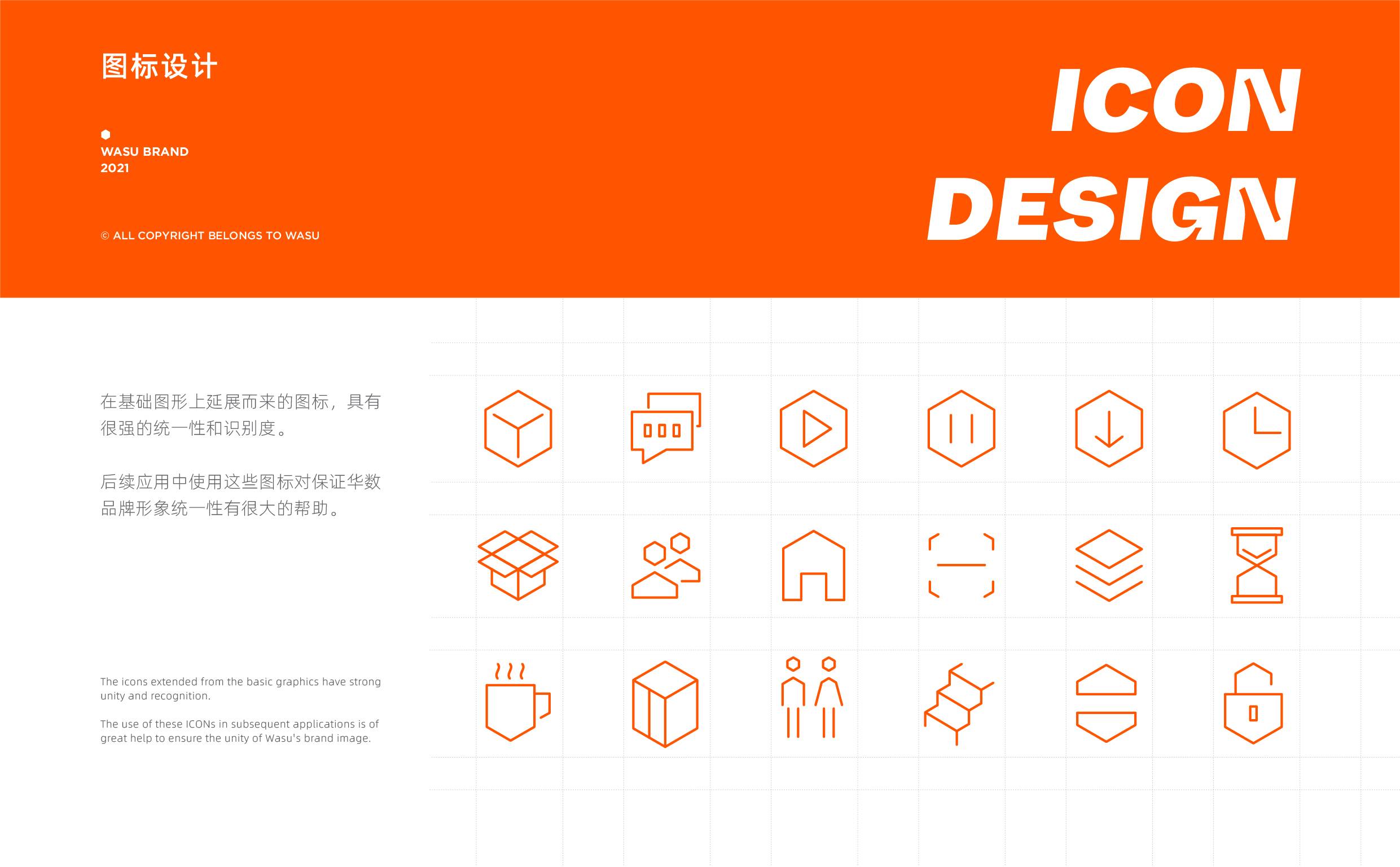 主色我们选用了饱和度较高的亮橙色,它取自华数logo中的橙色元素,为了打造华数全新年轻印象,我们调整了色彩的明度、饱和度和鲜艳度,与华数一脉相承,又呈现出了华数热情、风尚、活力、创新的新状态。辅助色以黑白灰为主,使得品牌色调不会过于花哨,能更好地展开延伸。整体色调辨识度高,利于华数的品牌传播。